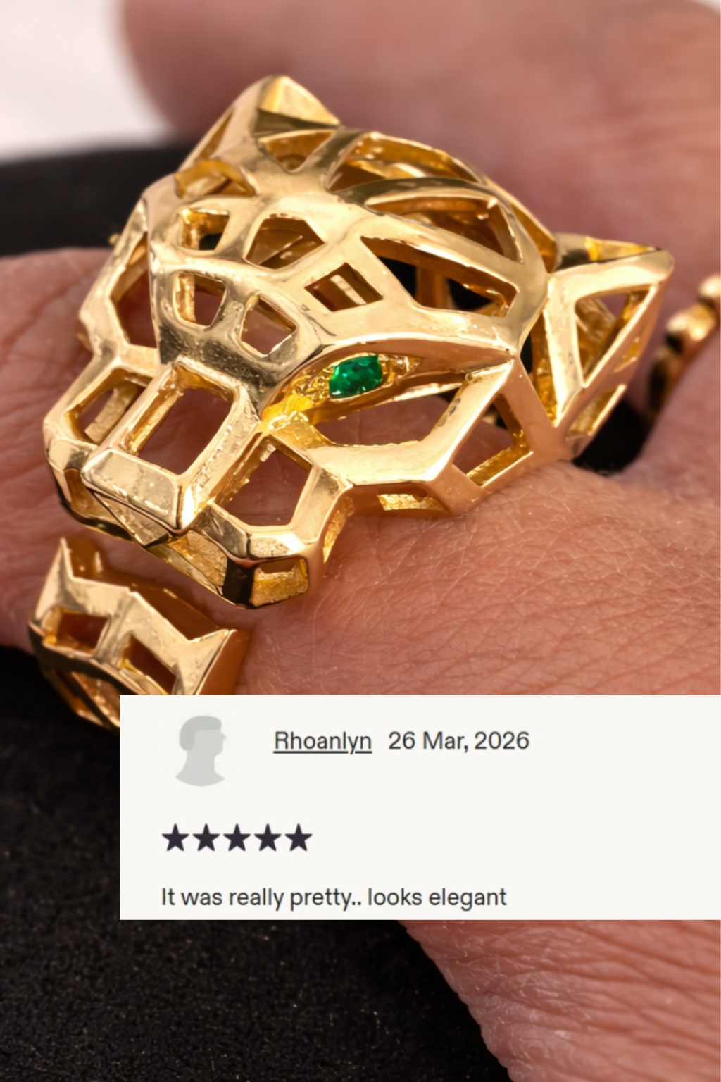 Gold Plated Stainless Steel Green Eyed Animal Panther Statement Ring