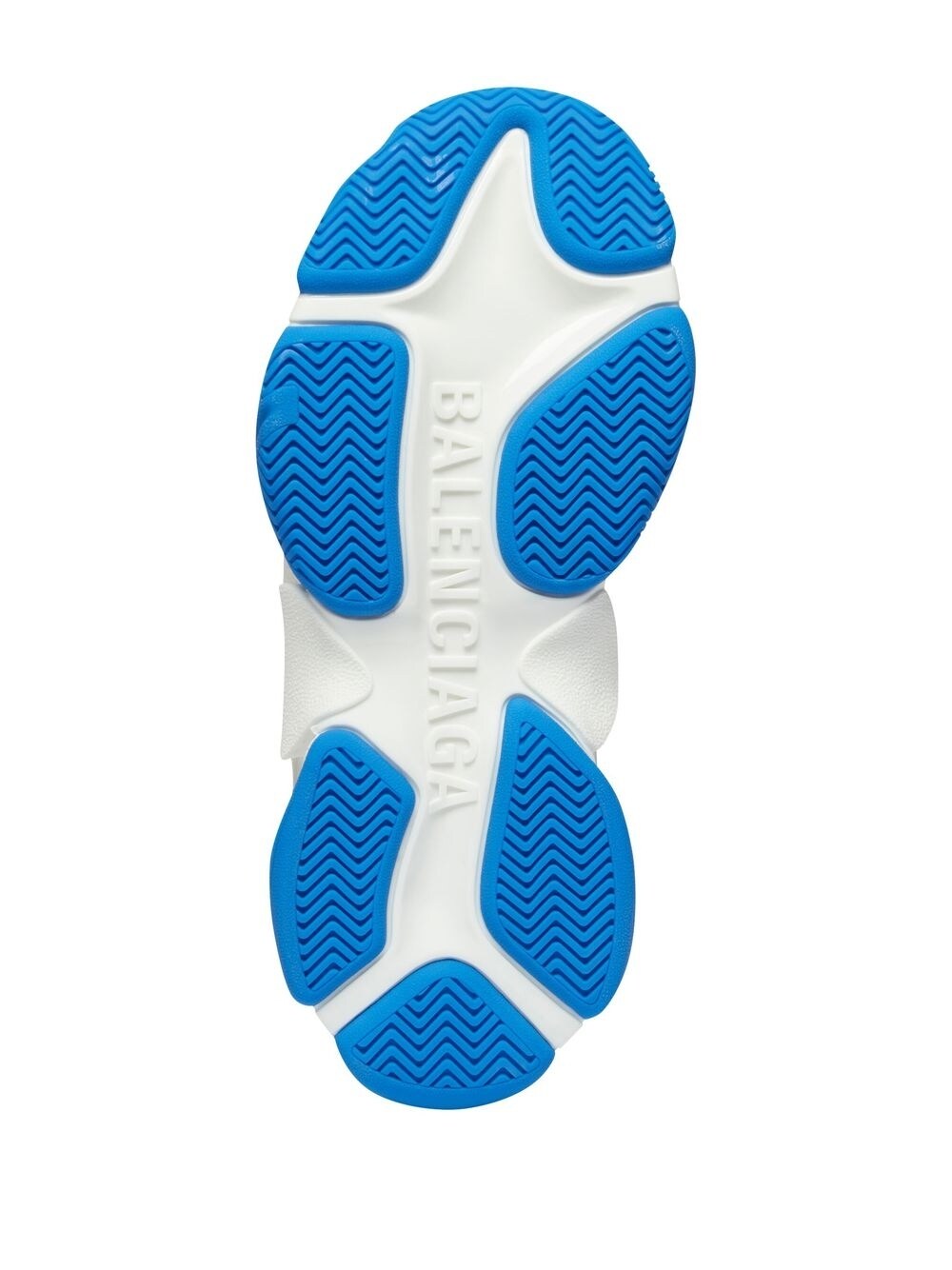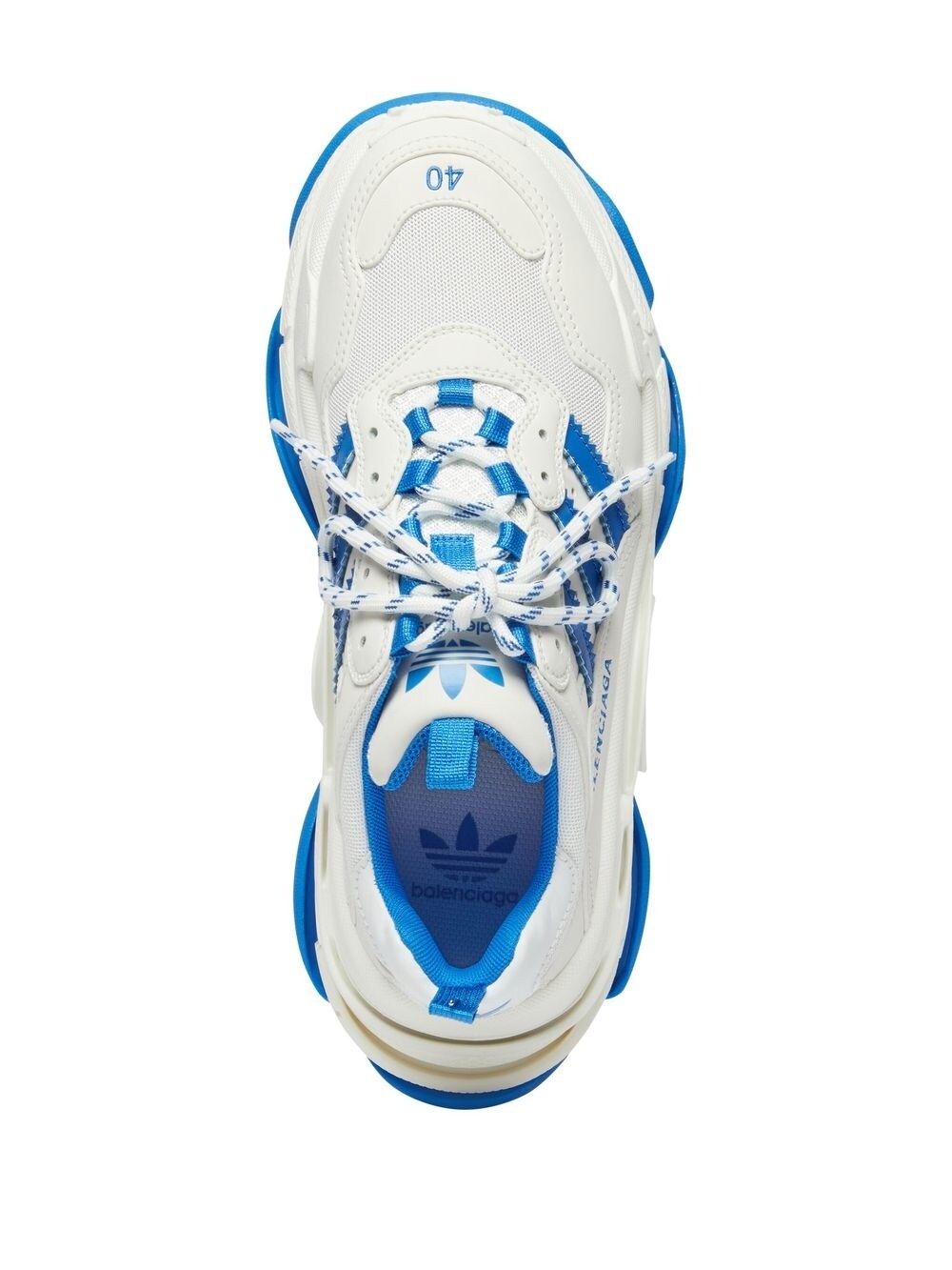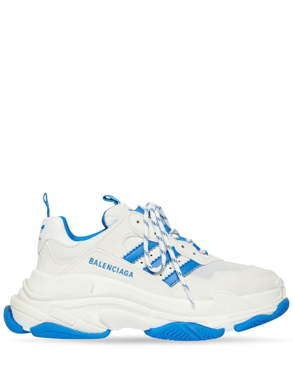 x adidas Triple S sneakers from BALENCIAGA featuring white, blue, faux leather, signature 3-Stripes logo, logo print to the side, round toe, front lace-up fastening, double pull-tab at the opening, branded insole and chunky rubber sole. Size and Fit - Heel 2,2 in / 5,5 cm; Platform 1,2 in / 3 cm