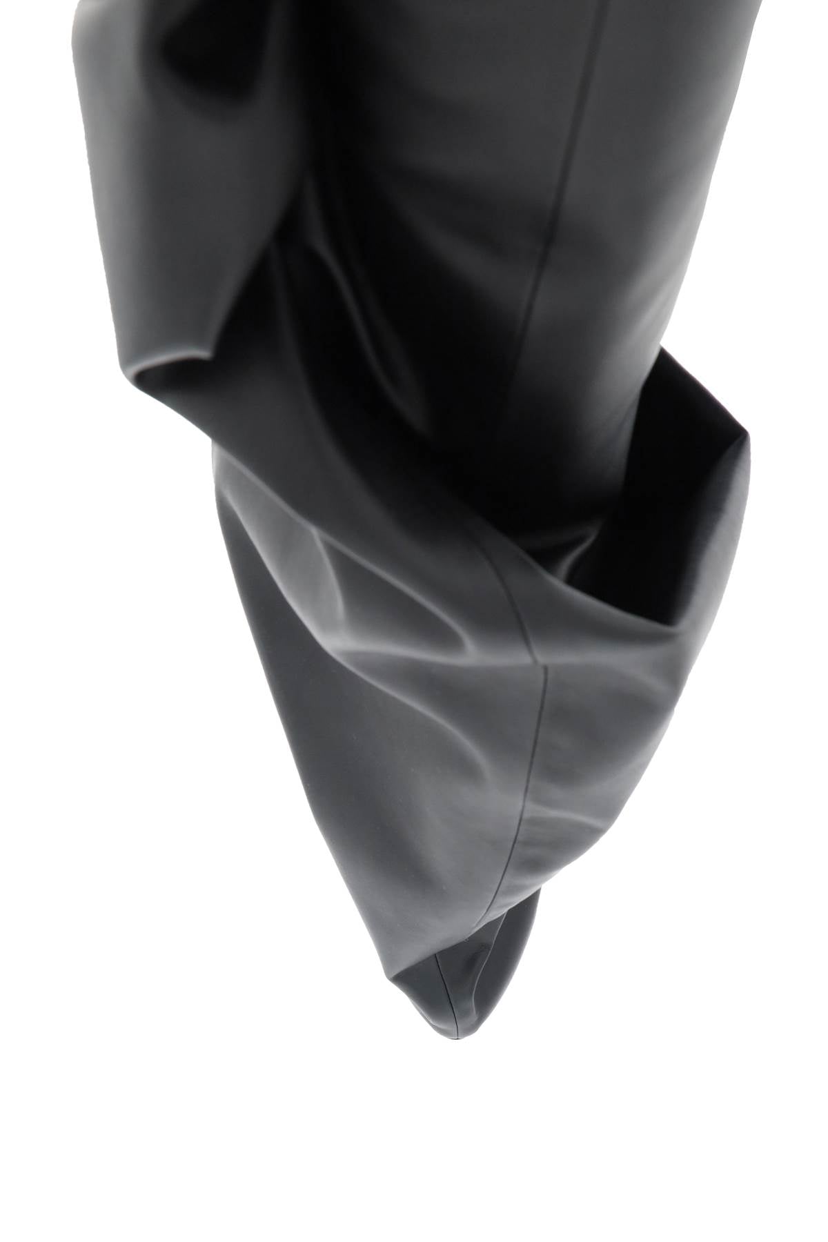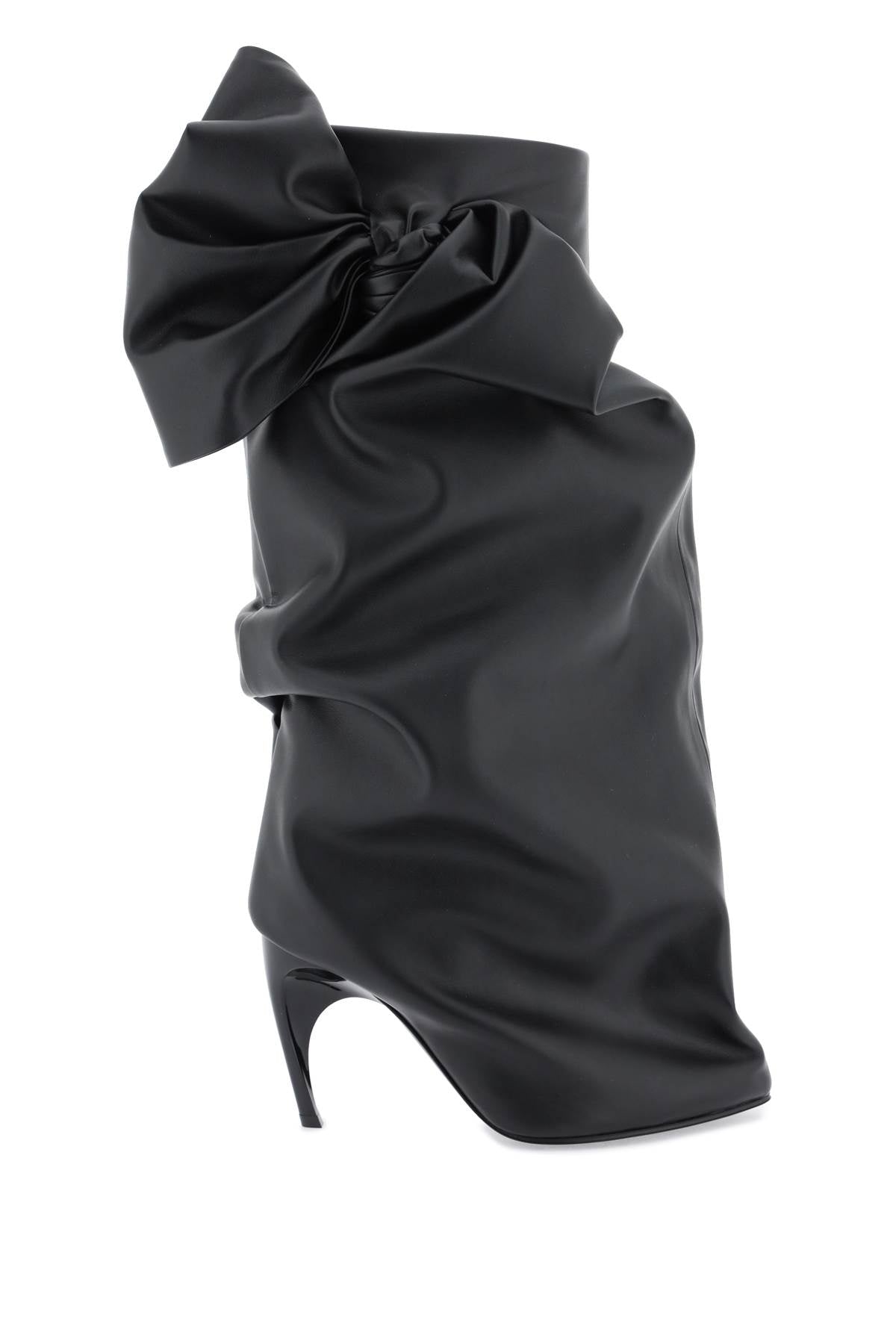 Alexander McQueen faux leather boots featuring a sculptural silhouette and embellished with an oversize bow on the side. Almond toe, iconic lacquered Armadillo heel, leather interior and leather sole with rubber inlay. Size and Fit - Heel Height = 9,5 cm,