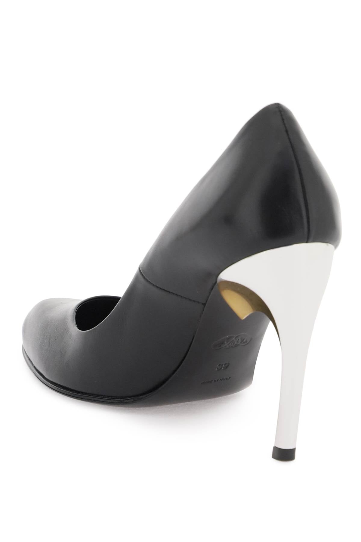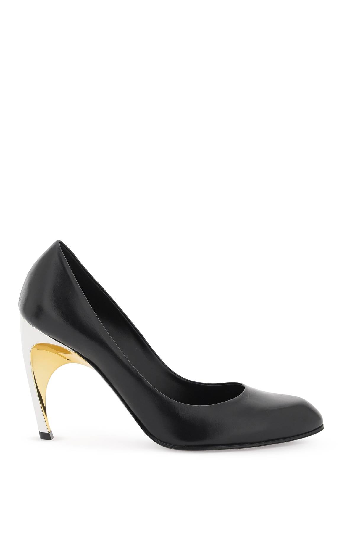 Armadillo pumps by Alexander McQueen made of leather and featuring the distinctive Armadillo heel lacquered in gold and silver. Leather footbed and leather sole with non-slip rubber inlay. Size and Fit - Heel Height = 9,5 cm,