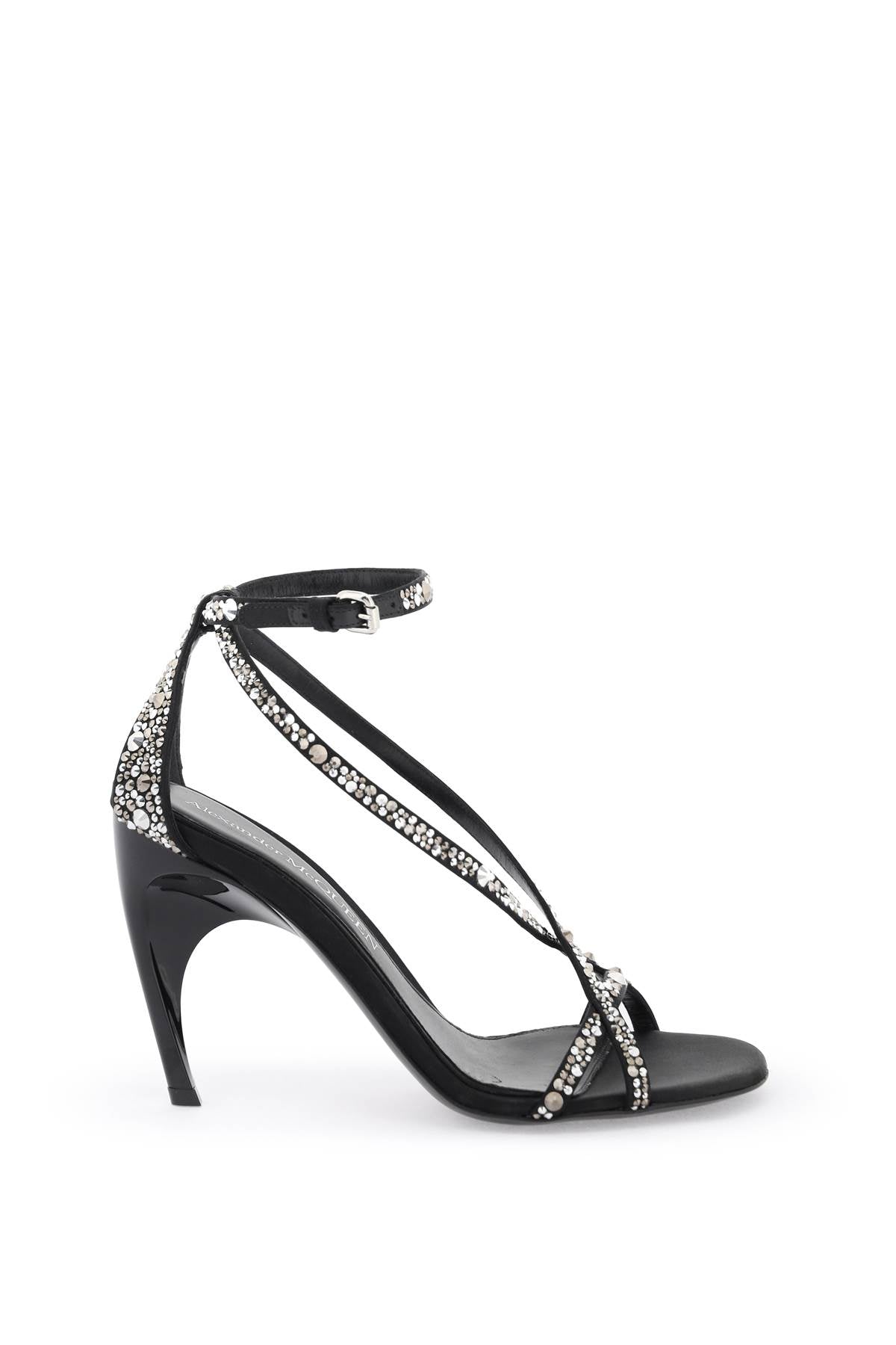 Armadillo sandals by Alexander McQueen made of silk satin with rhinestone-covered crisscross straps and iconic lacquered Armadillo heel. Leather footbed and leather sole with non-slip rubber inlay. Size and Fit - Heel Height = 9.5 cm,