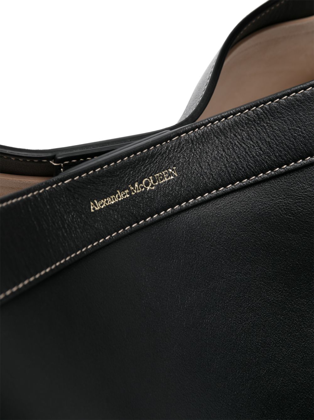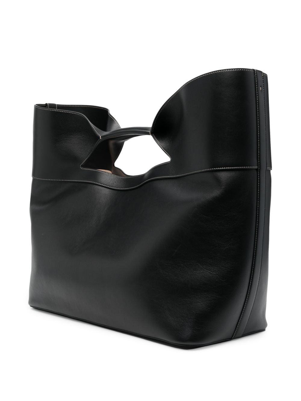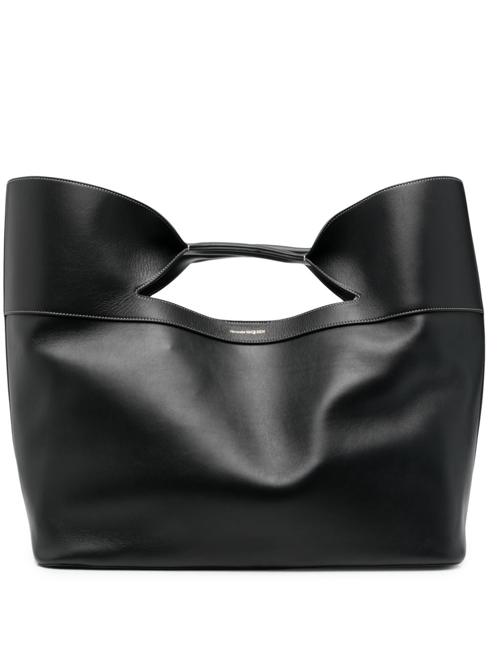 The Bow leather tote bag from Alexander McQueen featuring black, calf leather, gold-tone logo lettering, cut-out top handle, contrast stitching, concealed magnetic fastening, main compartment and removable pouch. Size and Fit - Width 22,05 in / 56 cm