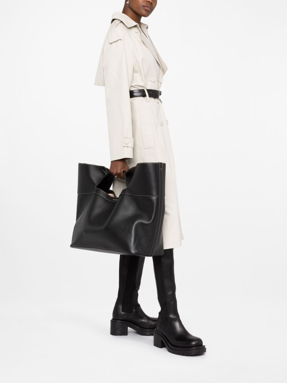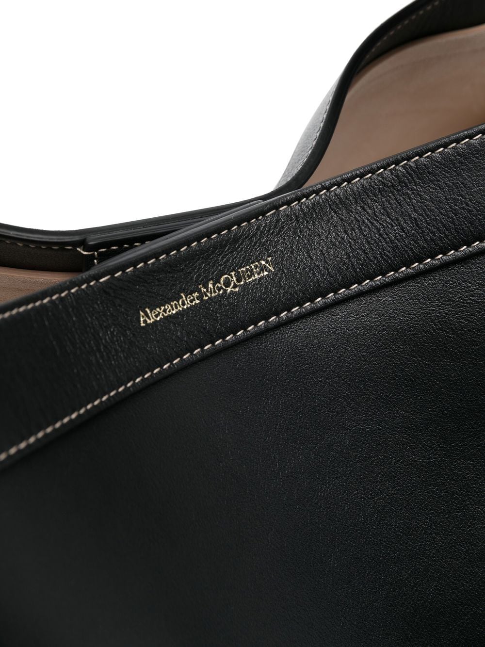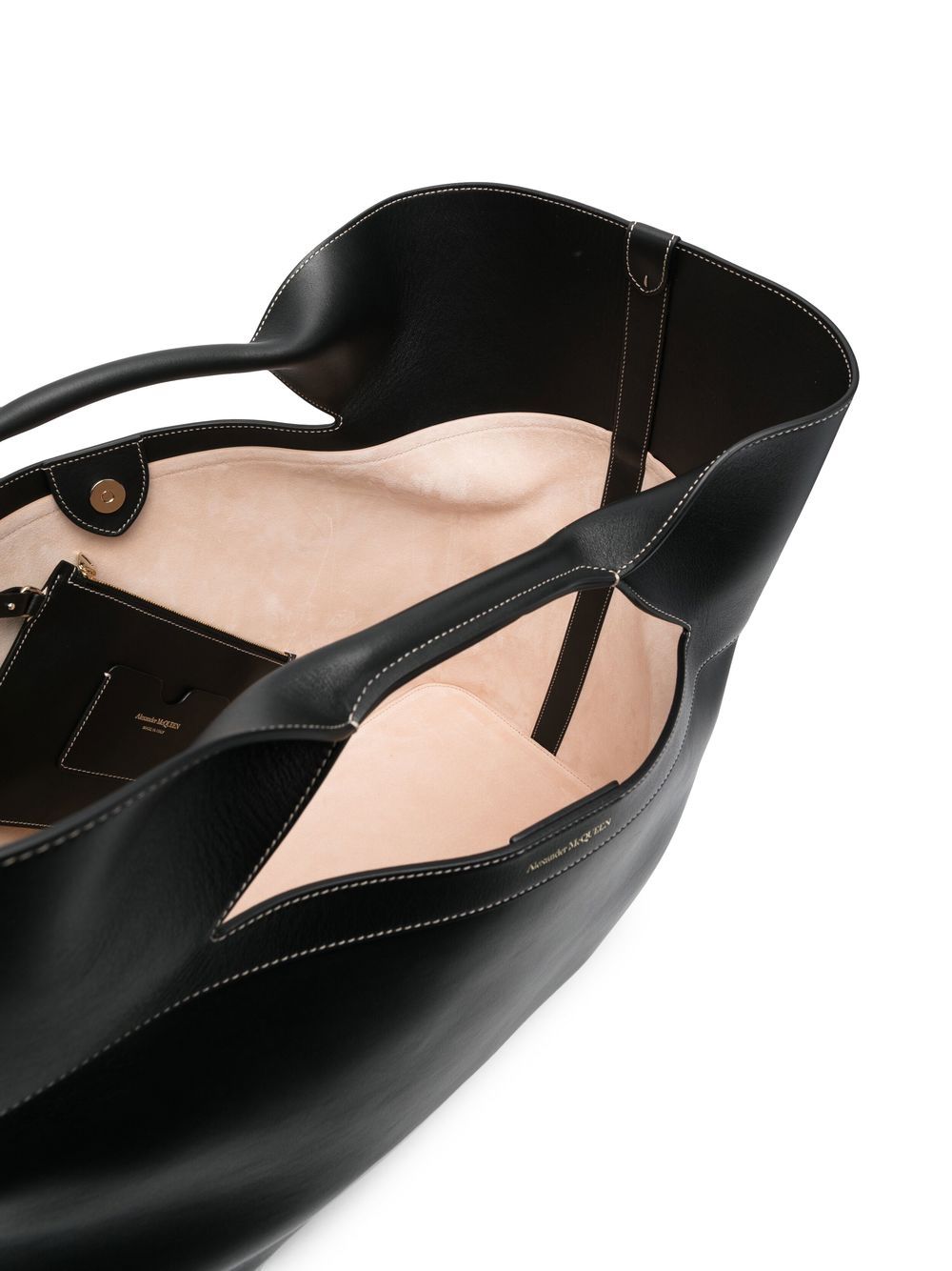 The Bow leather tote bag from Alexander McQueen featuring black, calf leather, gold-tone logo lettering, cut-out top handle, contrast stitching, concealed magnetic fastening, main compartment and removable pouch. Size and Fit - Width 22,05 in / 56 cm