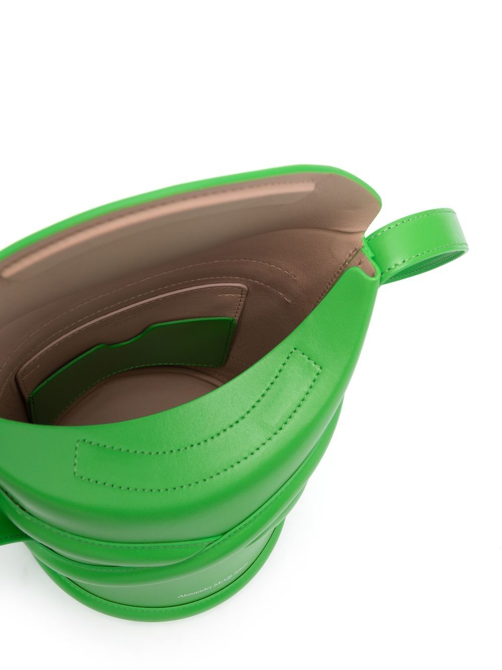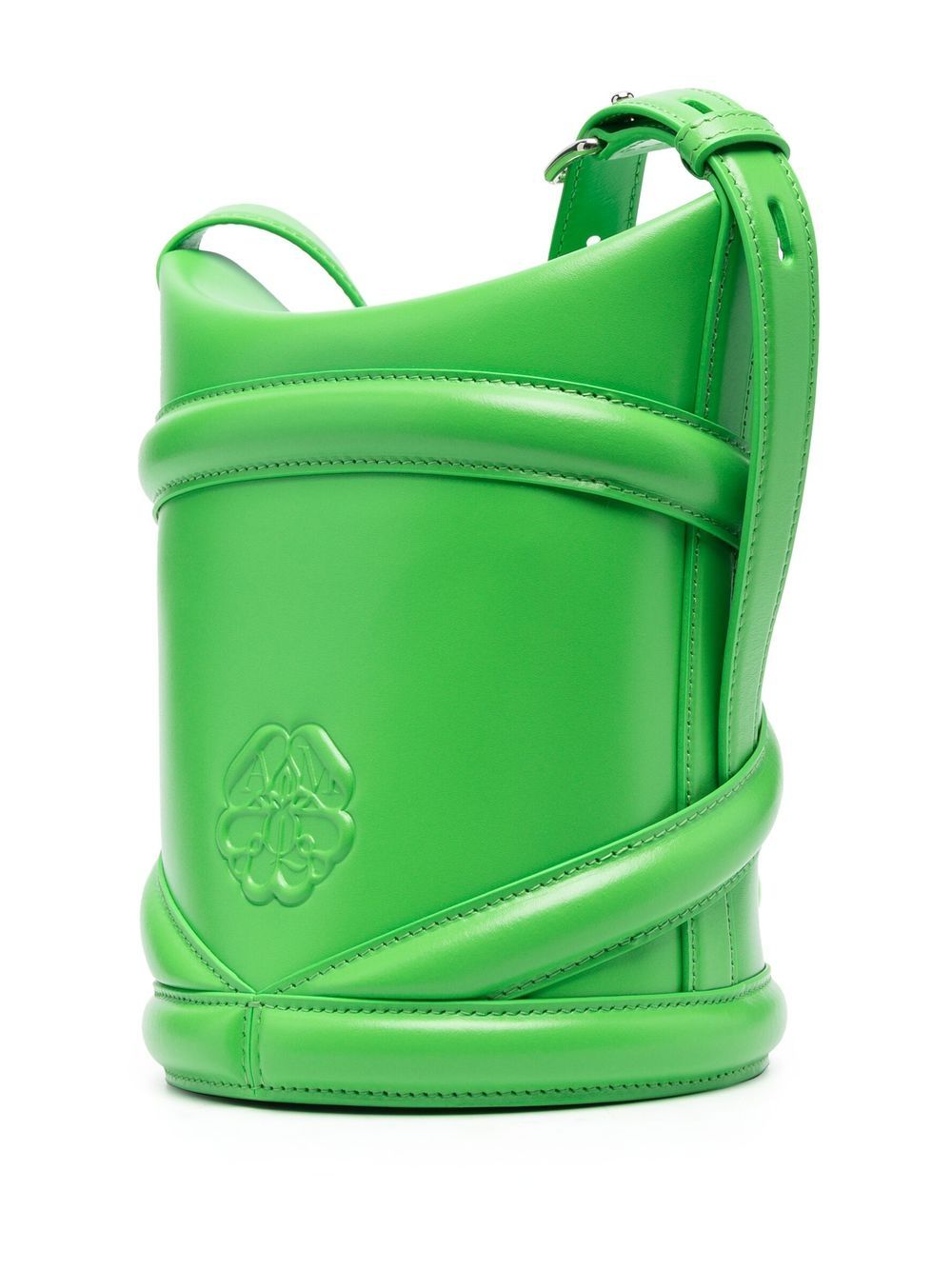 The Curve bucket bag from Alexander McQueen featuring apple green, leather, crossover strap detail, logo print to the front, debossed logo to the rear, internal logo stamp, main compartment, foldover top and adjustable shoulder strap. Size and Fit - Width 6,3 in / 16 cm