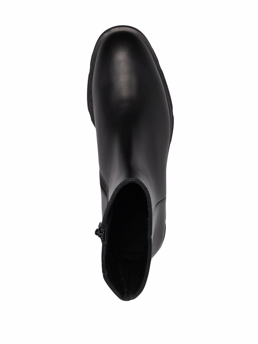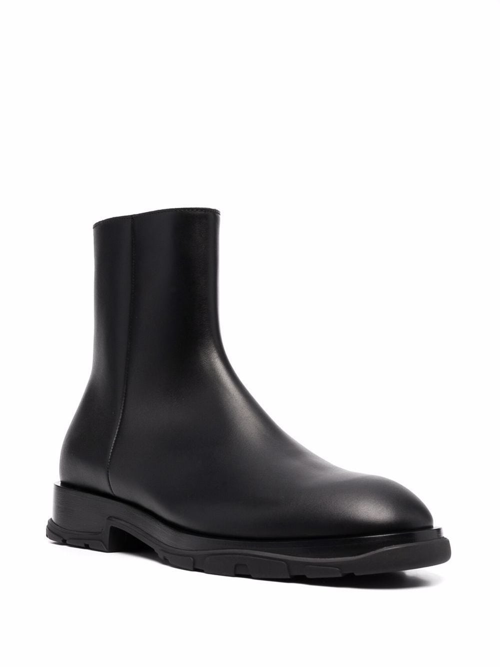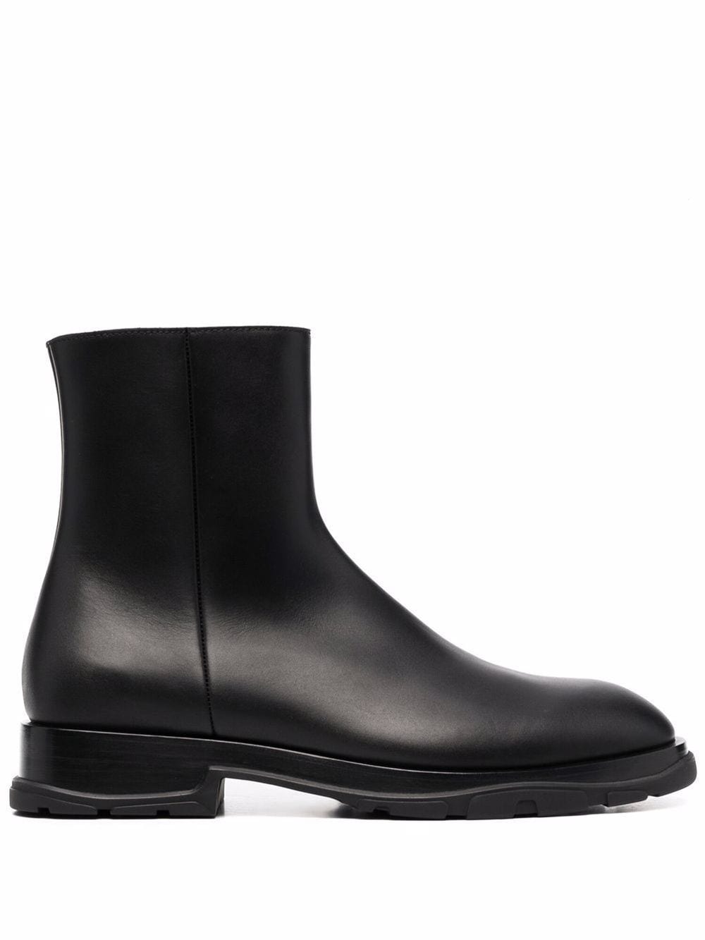 Black leather Slim Tread ankle boots from Alexander McQueen featuring square toe, ankle-length, side zip fastening, logo at the sole and flat leather sole. Size and Fit - Heel 1,6 in / 4 cm; Platform 1 in / 2,5 cm