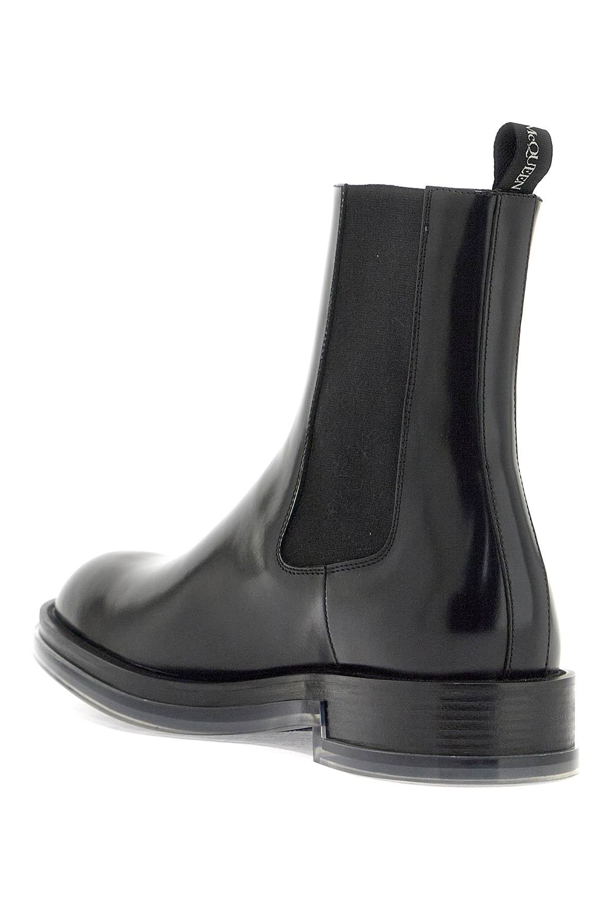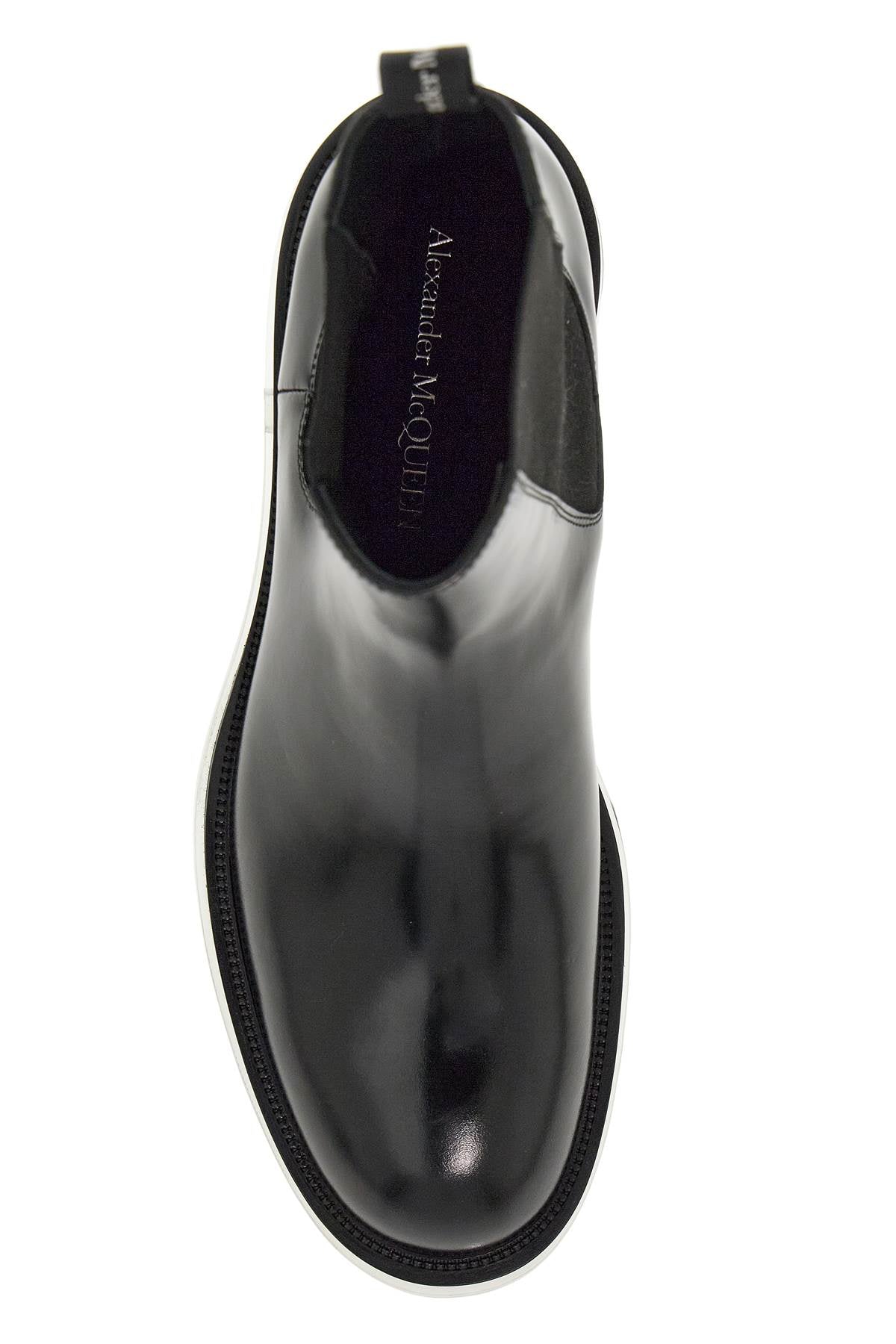 The Alexander McQueen Chelsea Float ankle boots are made of glossy leather with a thick welt and transparent sole that creates a floating effect. The back pull tab is branded with ribbon and the insole is made of leather. Size and Fit - Heel Height = 4 cm,