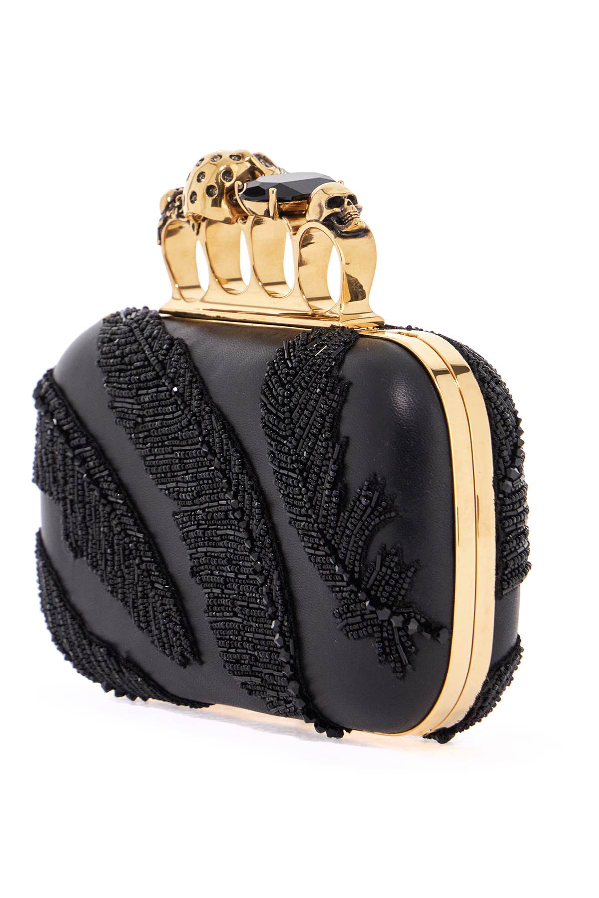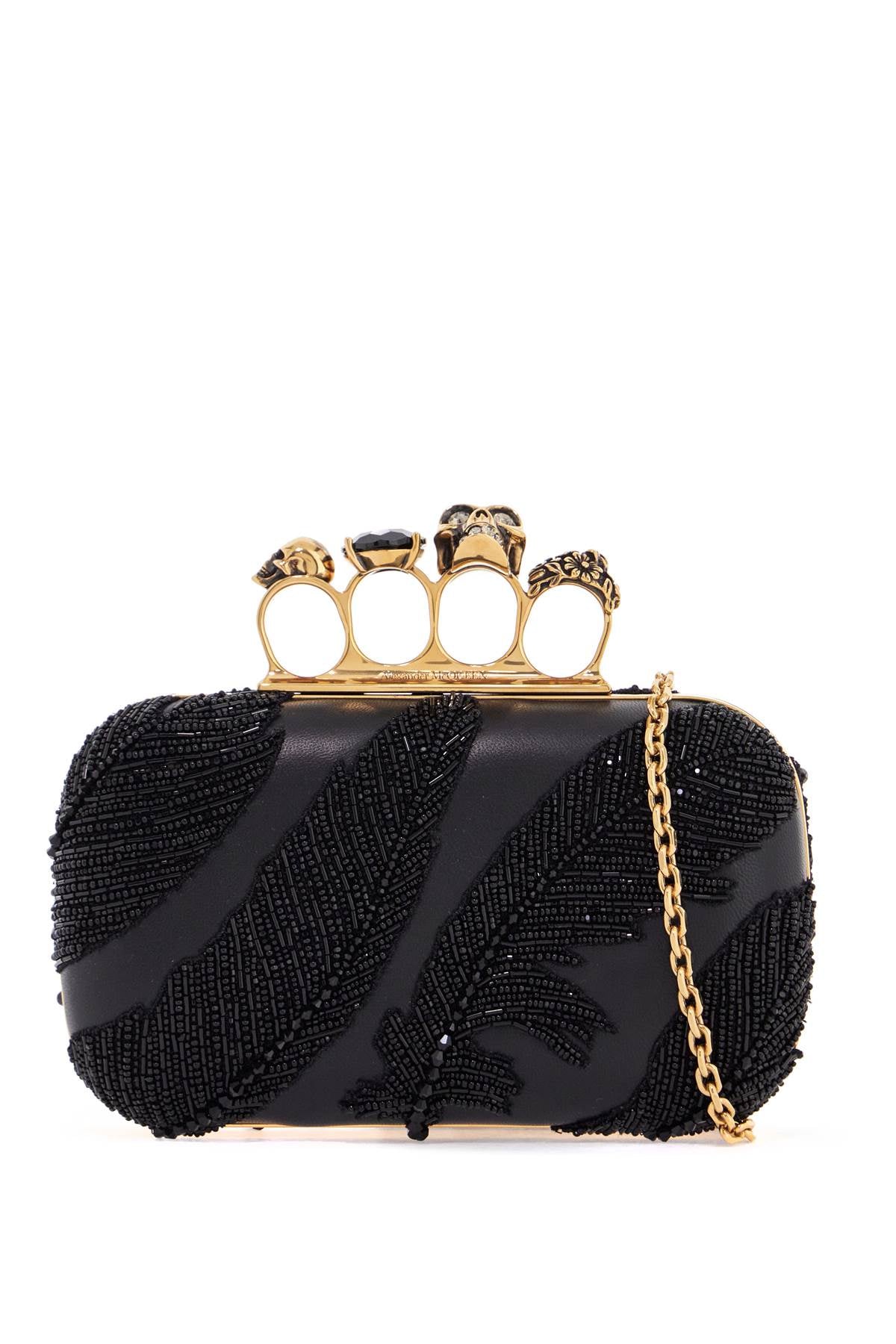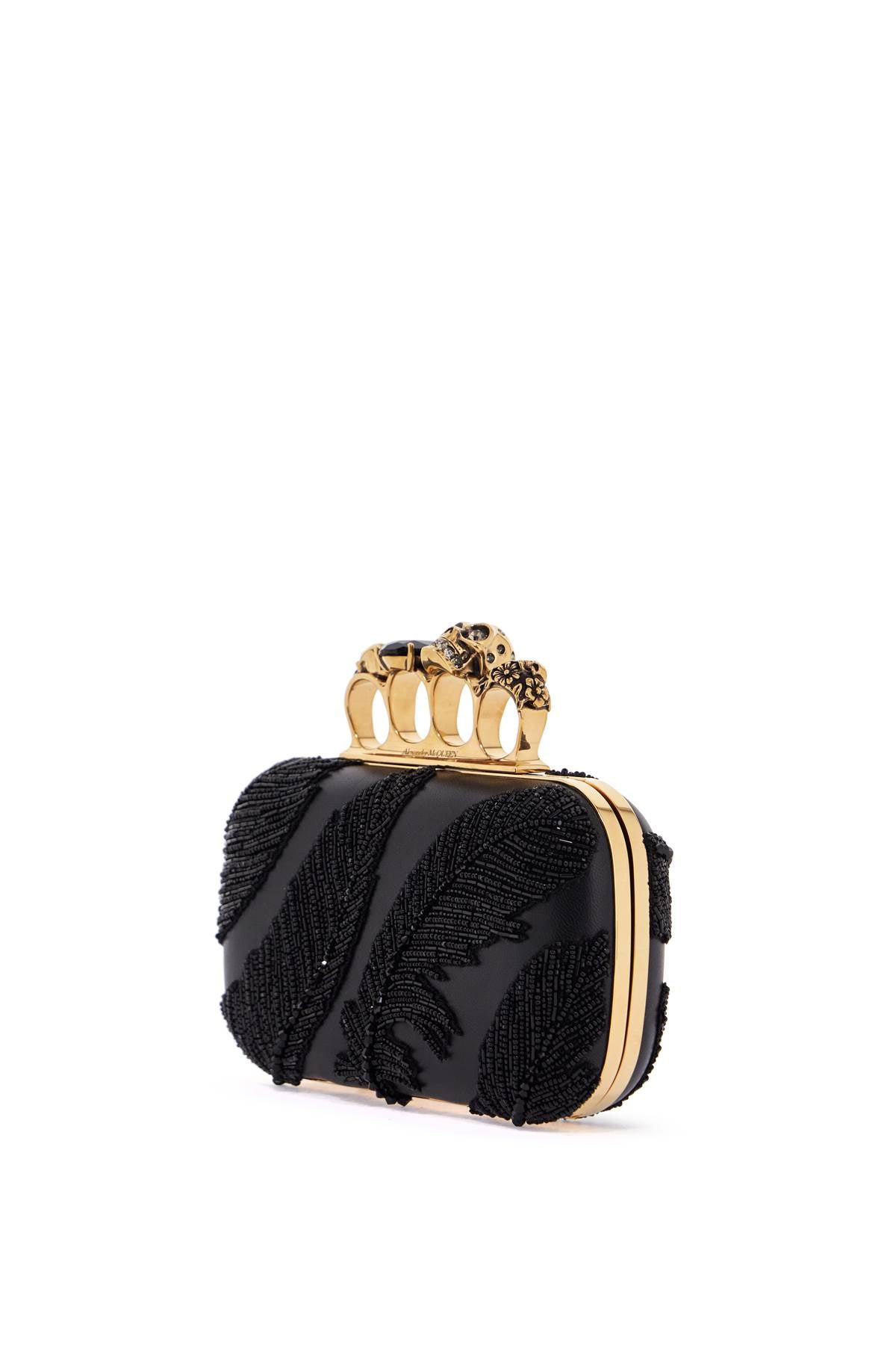 The Alexander McQueen Knuckle Clutch is made of soft leather and embellished with embroidered feathers and tonal beads. The iconic handle, adorned with rings and crystals, completes the design. The single compartment is lined in leather and comes with an additional chain strap. Brass accessories with an antique gold finish add a touch of luxury. Size and Fit - Bag Length = 18 cm, Bag Height = 10,5 cm, Bag Weight = 5 cm,