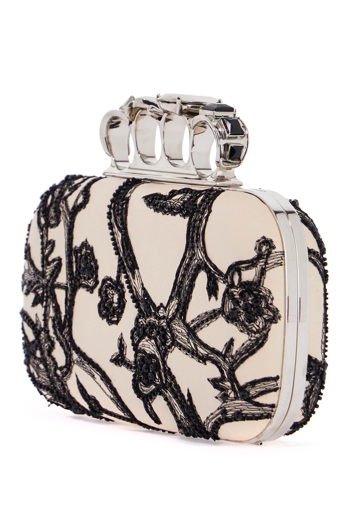 The Knuckle Clutch by Alexander McQueen is made of soft leather and embellished with Jet Blossom embroidery in contrasting metallic threads and beads. The iconic handle decorated with rings and studs completes the design. The single compartment is lined in leather, with an additional chain shoulder strap. Brass accessories with an antique silver finish. Size and Fit - Bag Length = 18 cm, Bag Height = 10,5 cm, Bag Weight = 5 cm,