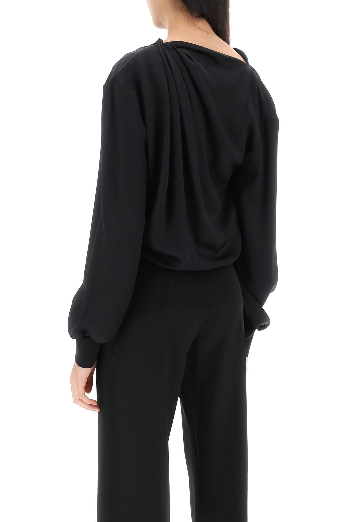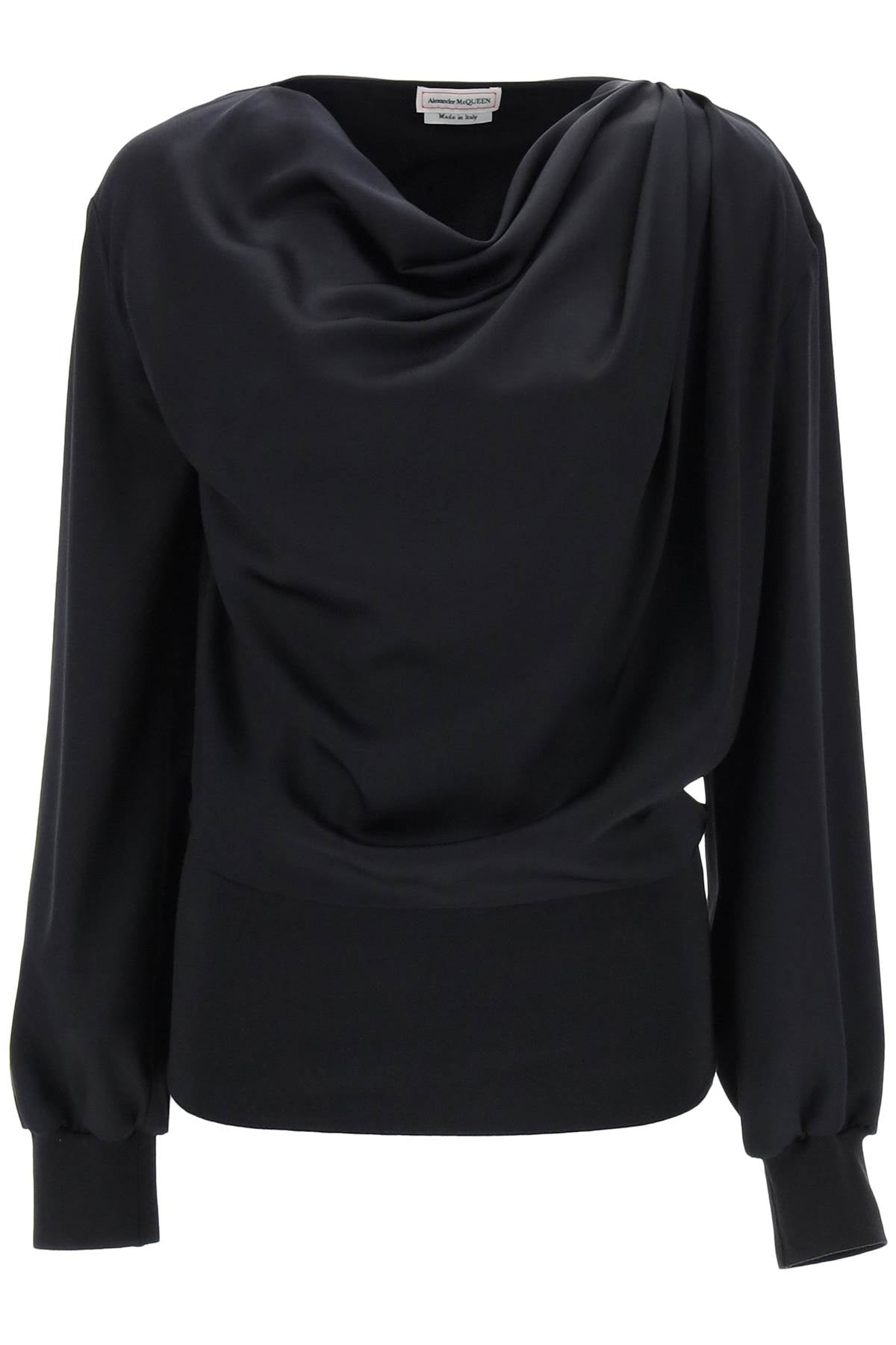 Alexander McQueen blouse crafted in silk satin, with cowl neck enriched by drapings. It features cuffs and hem in ribbed jersey. Loose fit. The model is 177 cm tall and wears size IT 40.