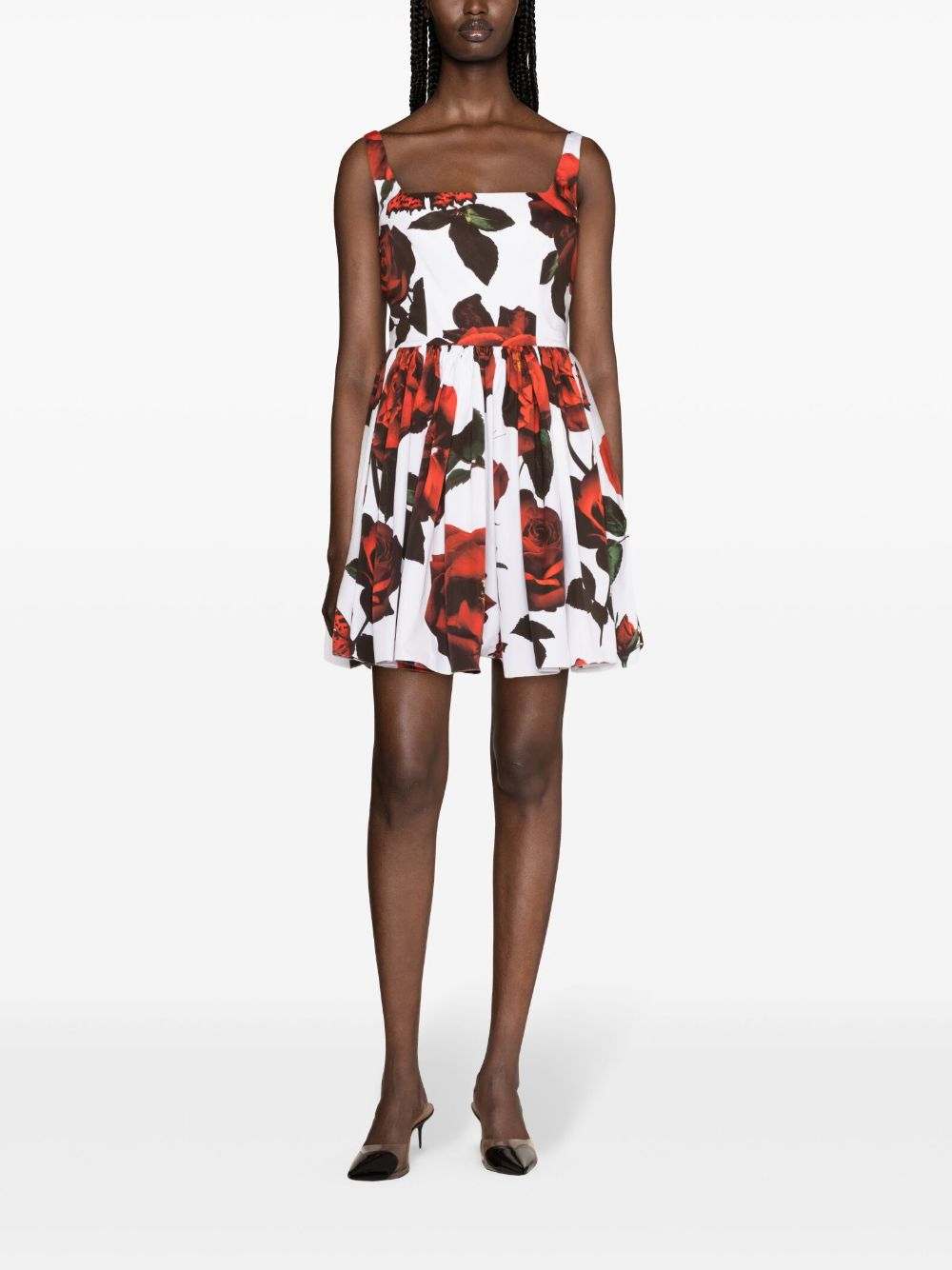 white/multicolour cotton poplin texture all-over floral print gathered detailing square neck sleeveless concealed rear hook and zip fastening fitted waistline flared skirt unlined straight hem thigh-length Size and Fit - This piece fits true to size. We recommend you get your regular size. Model is 1,75m / 5ft 8in wearing size 40 (IT)