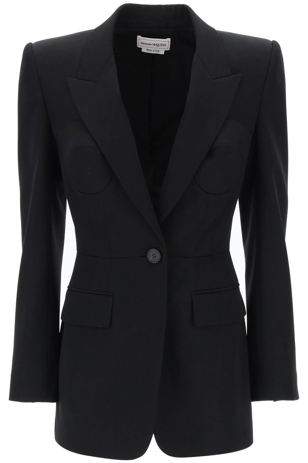 Crafted in pure wool grain de poudre and featuring a tailored cut enhanced by pointed padded shoulders, this Alexander McQueen jacket stands out for its single-breasted design adorned with bustier-inspired elements on the front. It features peak lapels, a single button closure, flap pockets, buttoned cuffs, and a central back vent. Lined in cupro. The model is 177 cm tall and wears an IT size 40.