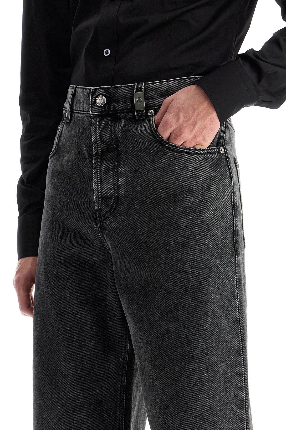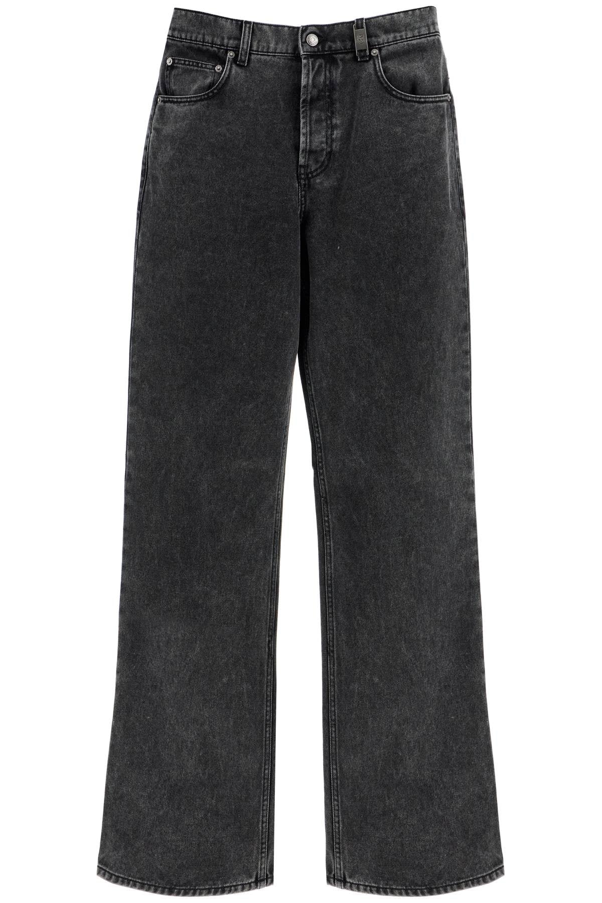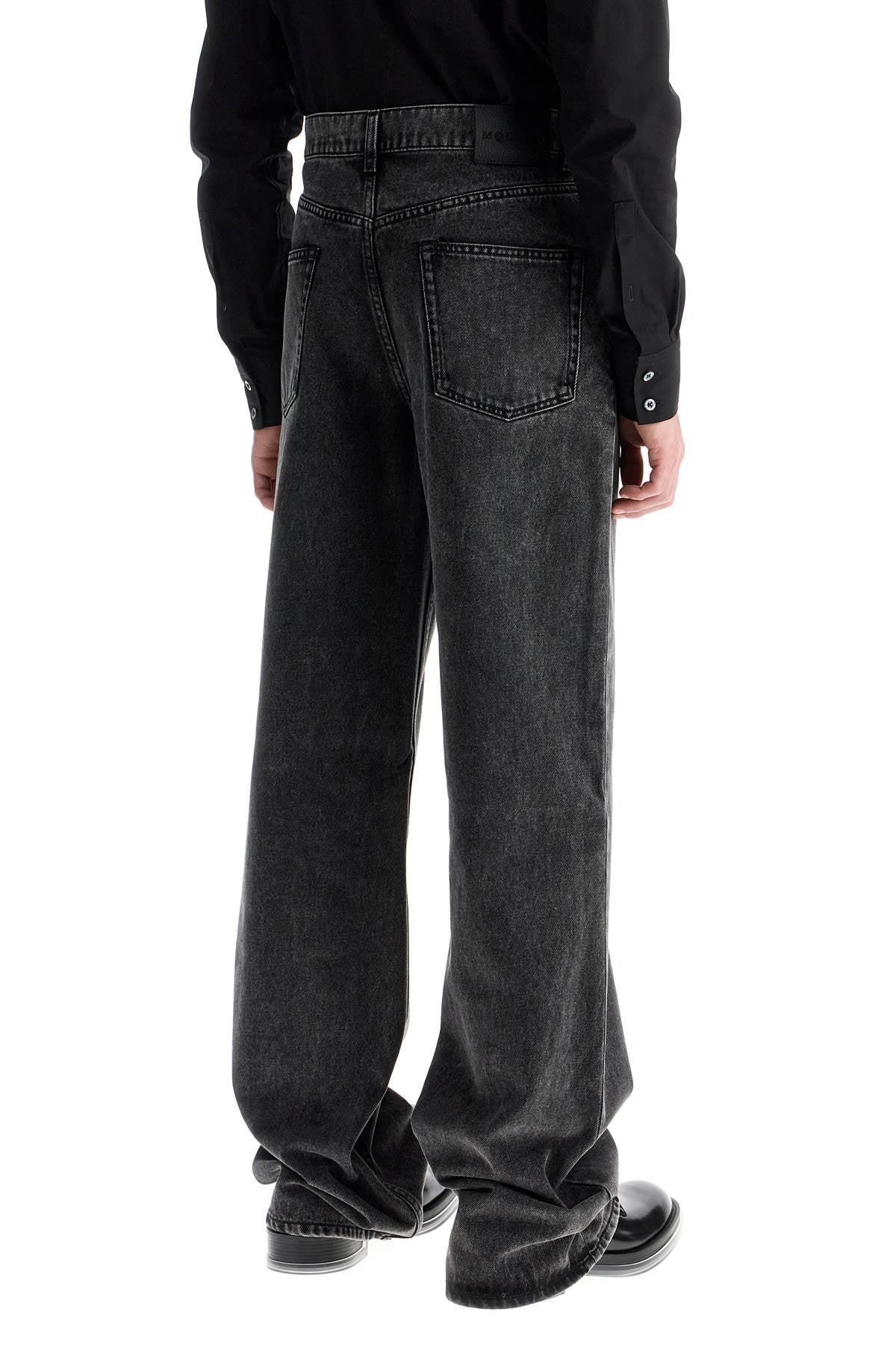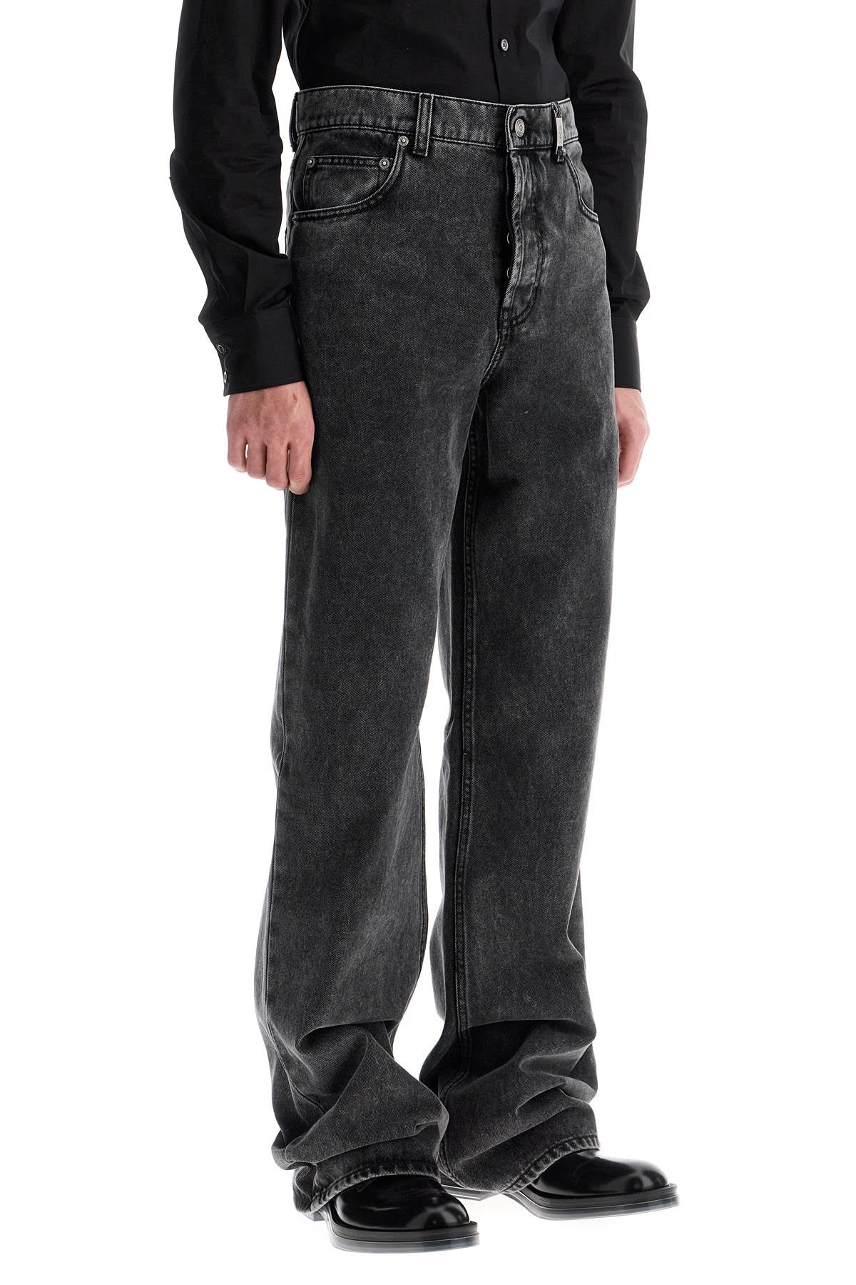 These Alexander McQueen five-pocket jeans have a baggy cut and low waist, made from black-washed pure cotton denim. The garment is detailed with a metal Skull-engraved plaque on one of the belt loops and a hammered leather jacron on the back. It features hidden buttons for closure. The model is 182 cm tall and wears an IT size 48.