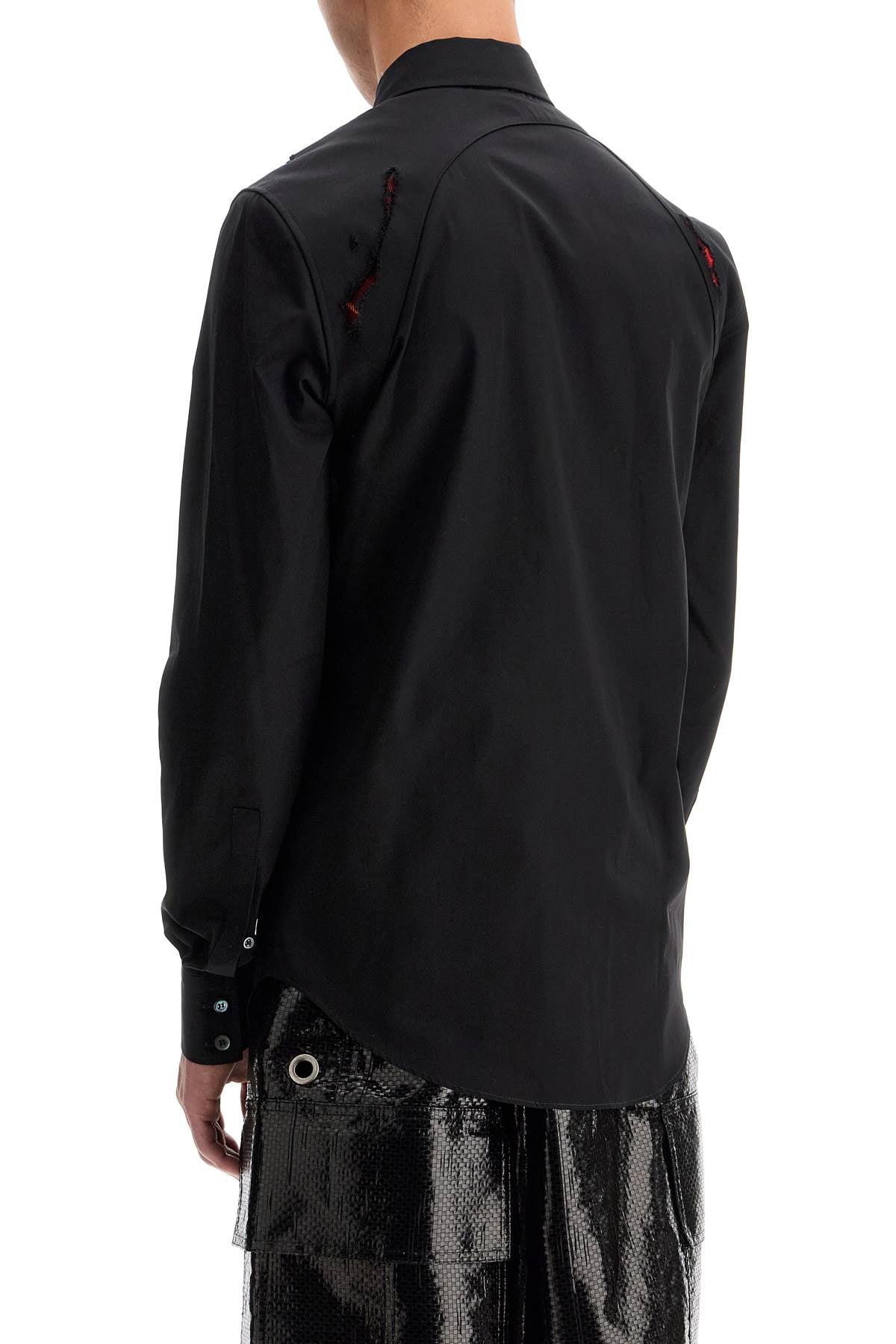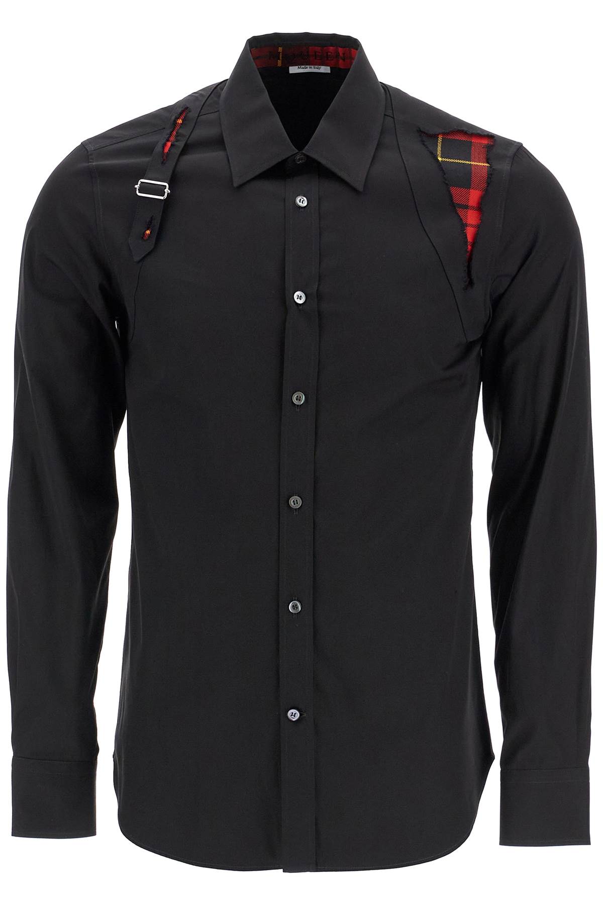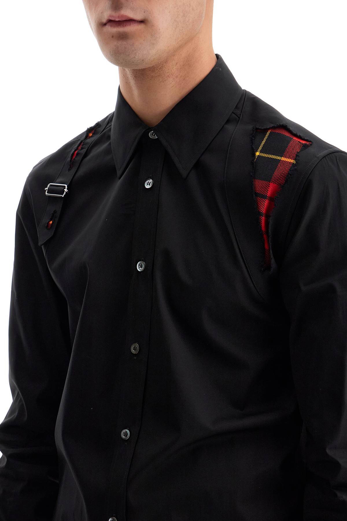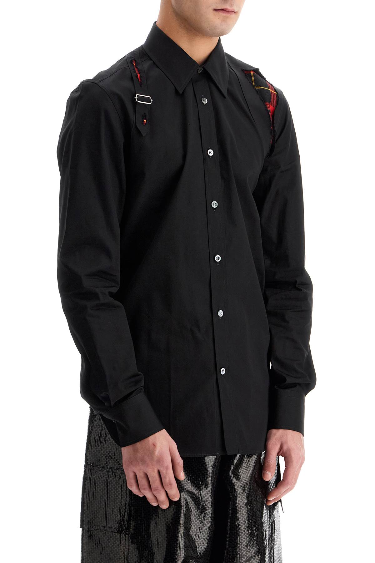 This Alexander McQueen long-sleeved shirt in organic cotton poplin stands out for its destroyed Harness details, with a strap on the right shoulder and a reinforcing insert on the left, revealing the MacQueen tartan motif in wool. Mother-of-pearl buttons and a rounded hem complete the garment. Regular fit. The model is 182 cm tall and wears size 15 1/2.