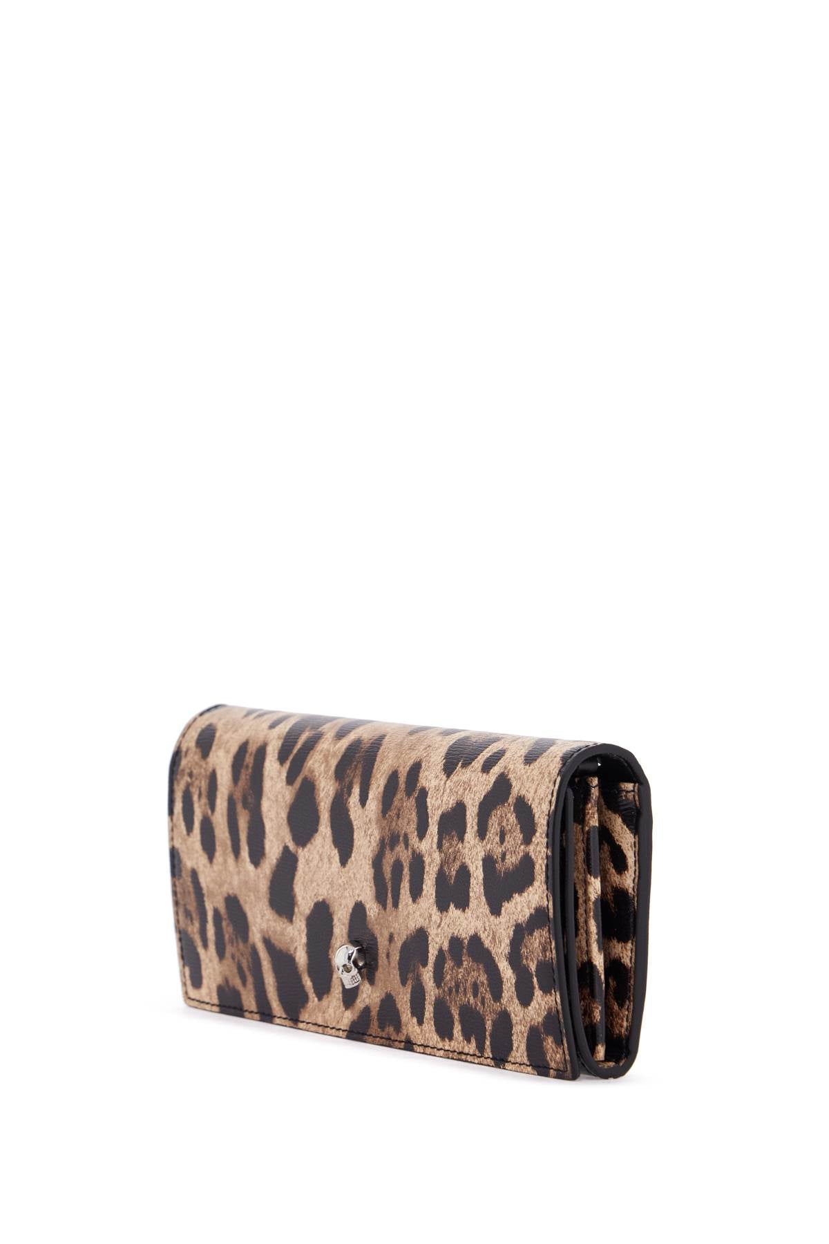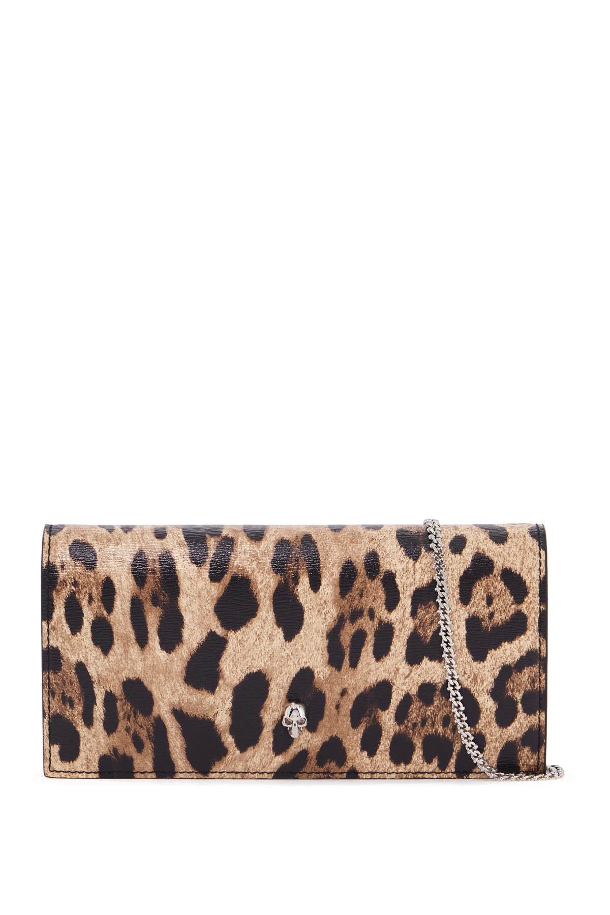 This Alexander McQueen mini shoulder bag is made of leopard print faux leather and features the iconic mini Skull applied on the flap. It has a thin chain strap, snap button closure, and an interior in faux leather with two expandable compartments separated by a central zip pocket, one slit compartment, and six credit card slots. The metal accessories are silver-toned. Size and Fit - Bag Length = 20 cm, Bag Height = 10 cm, Bag Weight = 4 cm,