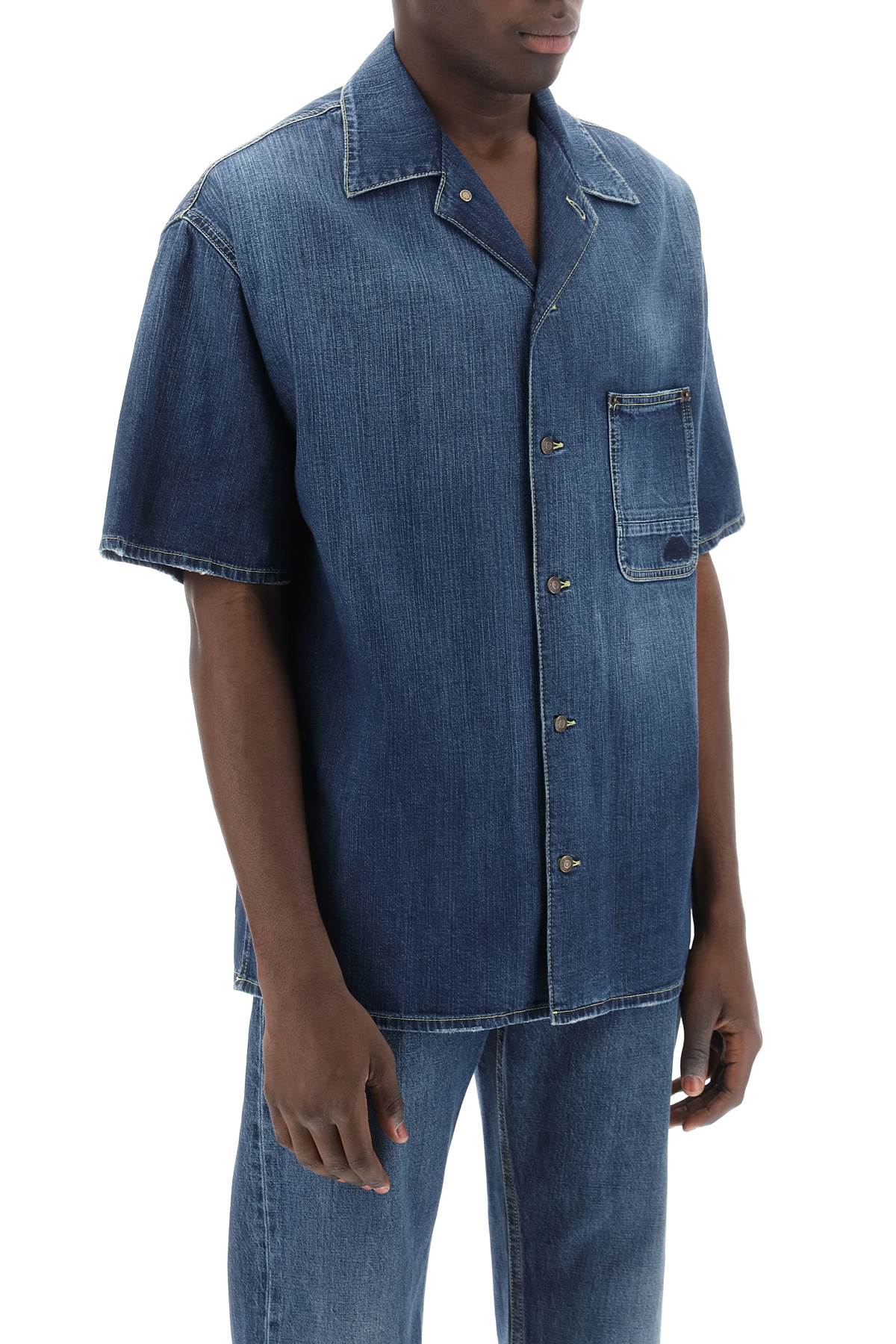 Made from lightweight organic denim to a boxy fit, this button-up shirt from Alexander McQueen features a short-sleeved design with a convertible collar and a chest pocket embroidered with a Seal logo. Small side vents on the straight hem. The model is 187 cm tall and wears a size IT 48.