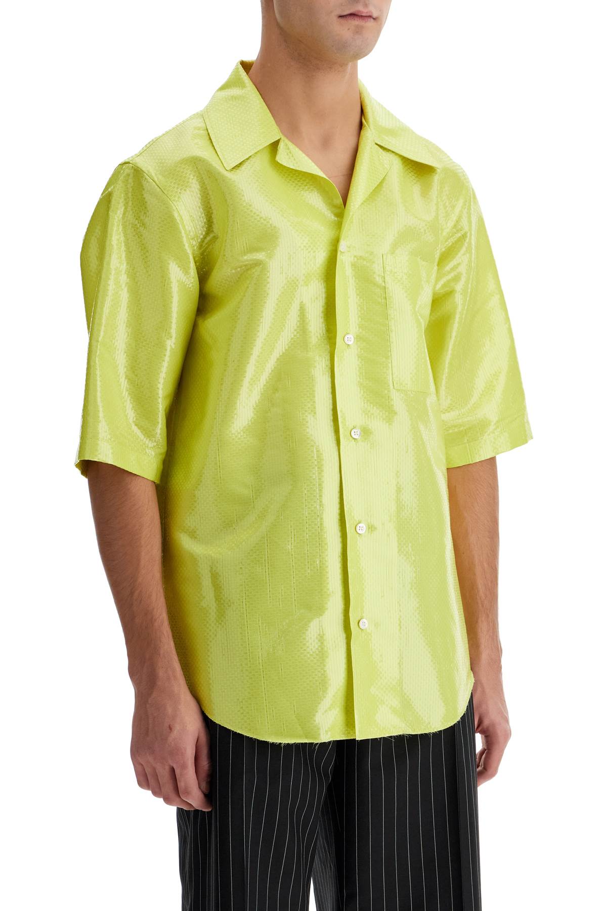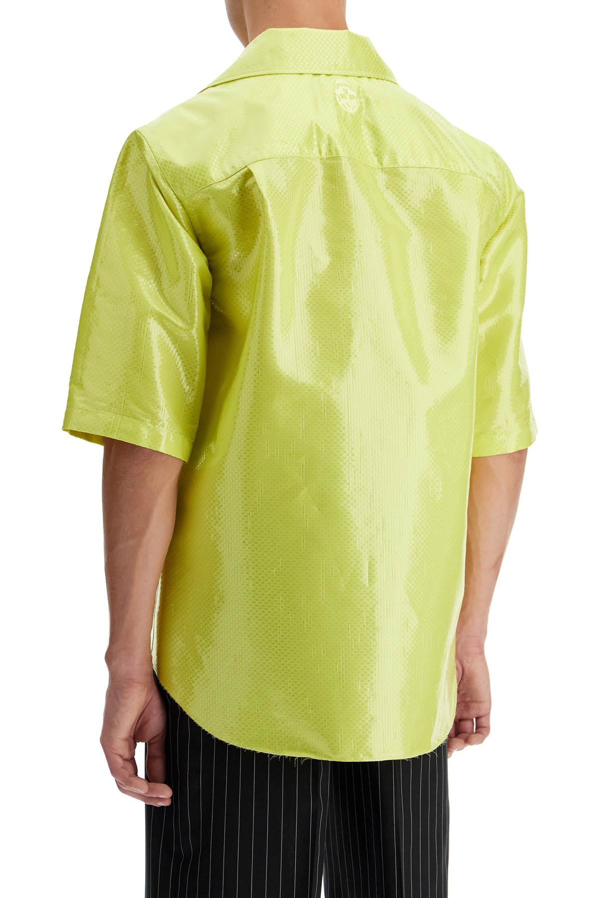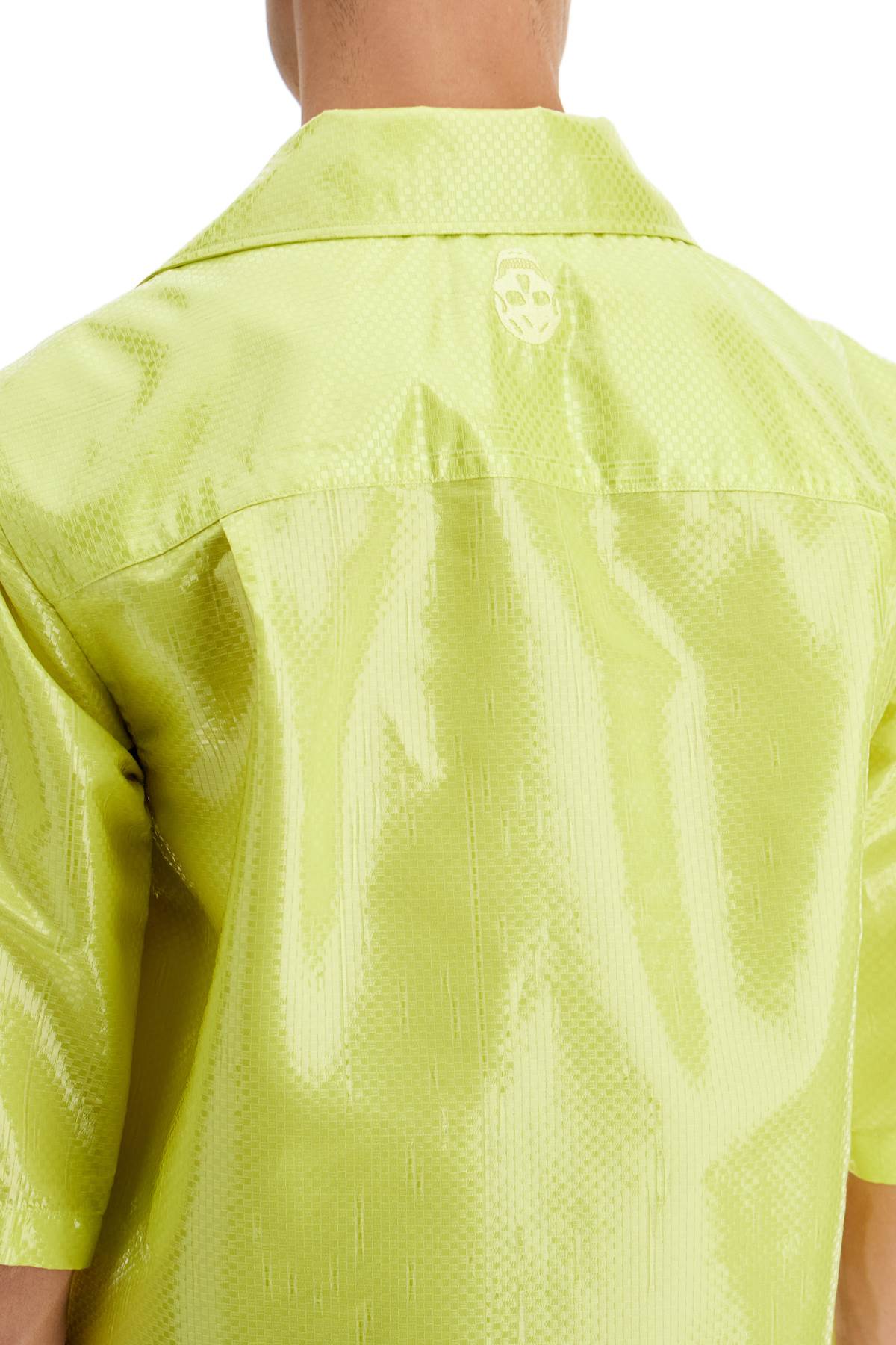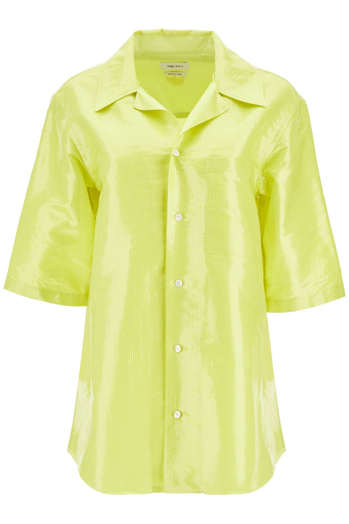Alexander McQueen presents a short-sleeved shirt with a Cuban collar, made of silk blend and tarred canvas for a shiny look. Classic button closure, chest pocket and rounded raw-cut hem complete the garment. Relaxed fit. The model is 182 cm tall and wears size 15 1/2.