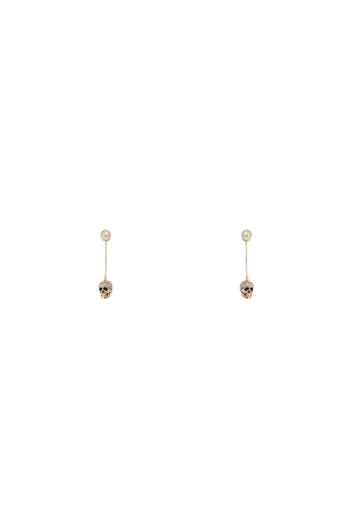 Alexander McQueen gold-tone brass stud earrings with decorative pearl and chain pendant with the iconic crystal-embellished Skull. Rear closure, for pierced earlobes. Size and Fit - Accessory Height = 3,5 cm,