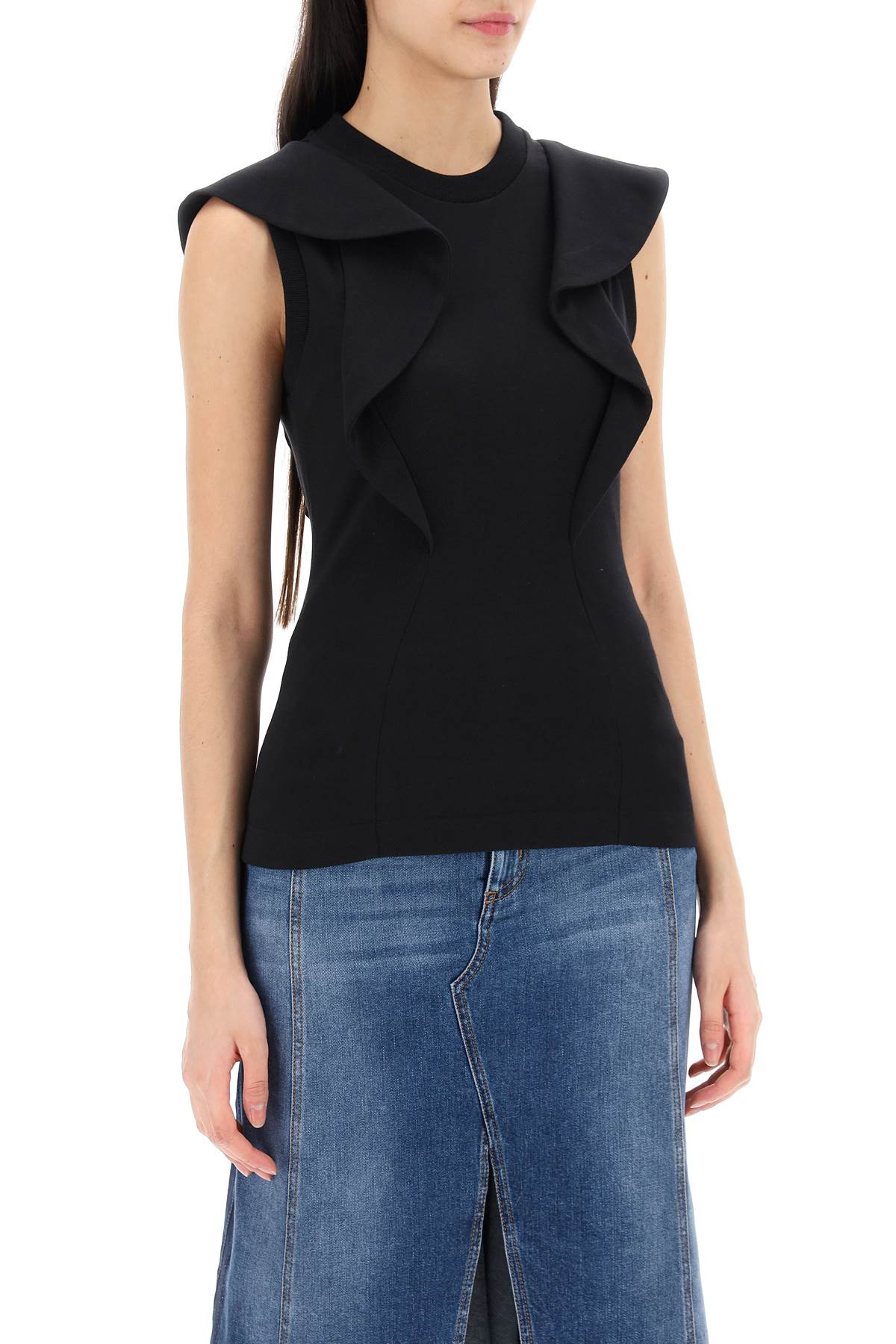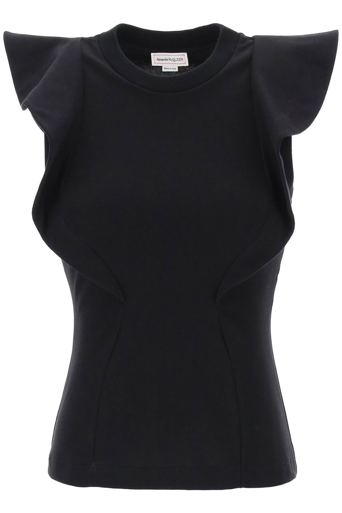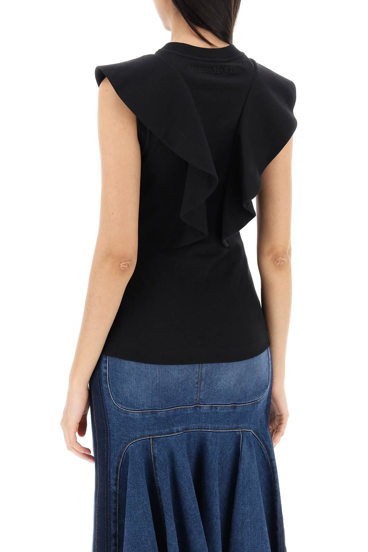 This Alexander McQueen sleeveless t-shirt is made of compact cotton jersey and features ruffles and flap details on the shoulders. It has a round neckline and ribbed armholes, and is signed with an embroidered logo in tone behind the neck. The fit is slim. The model is 177 cm tall and wears an IT size 38.