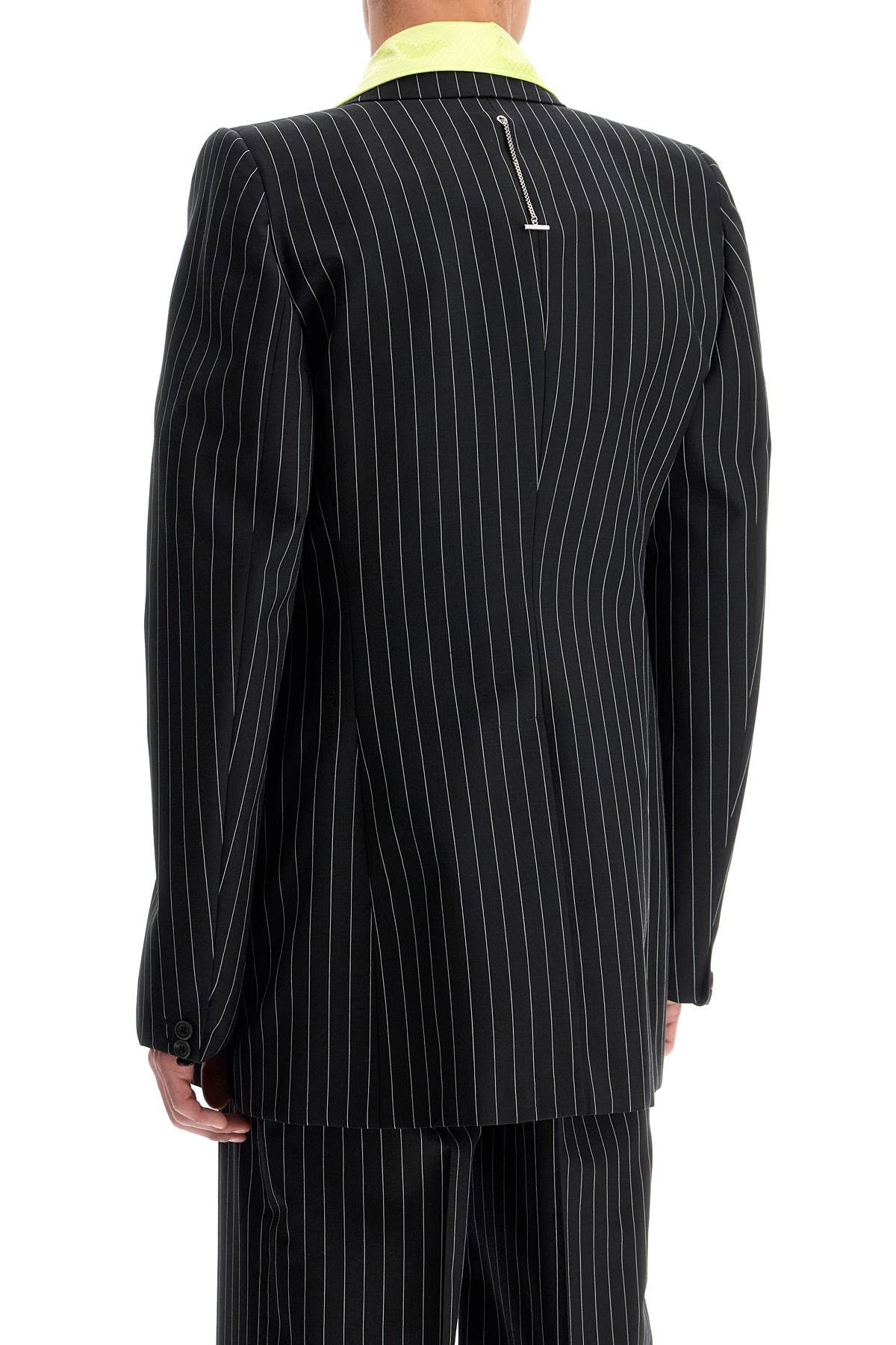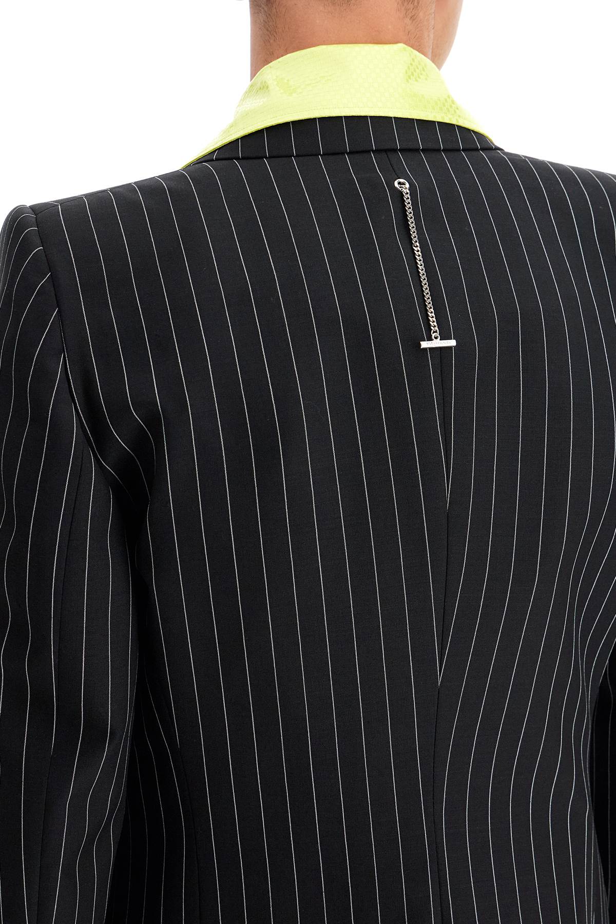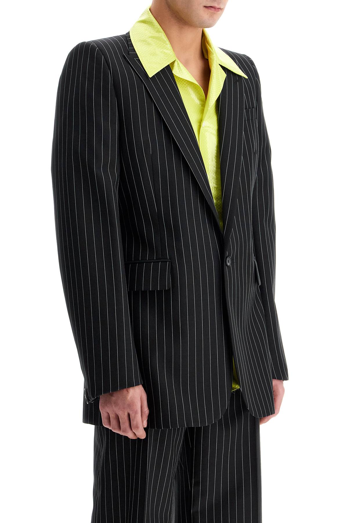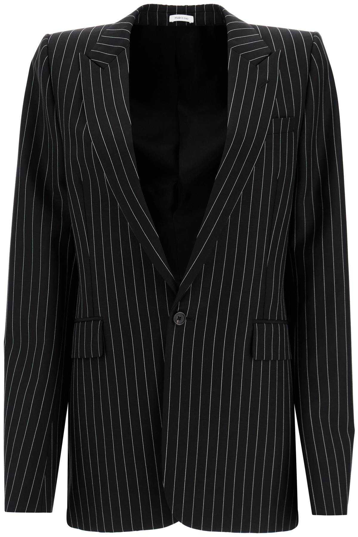 The Alexander McQueen single-breasted jacket is made of a blend of mohair and pinstriped fabric, featuring the iconic voluminous shoulders and the Cross-bar chain detail on the back. The design has a relaxed fit with peak lapels, a single button closure, a chest pocket, front pockets with flaps, and a back vent. It is lined with two additional pockets. The model is 182 cm tall and wears an IT size 48.