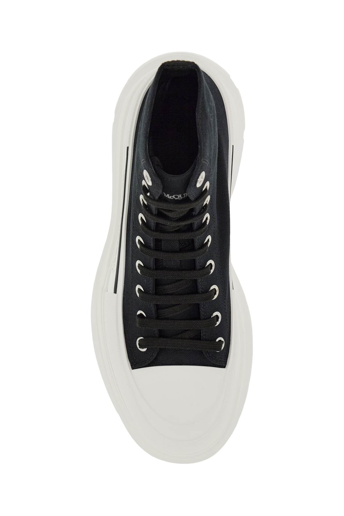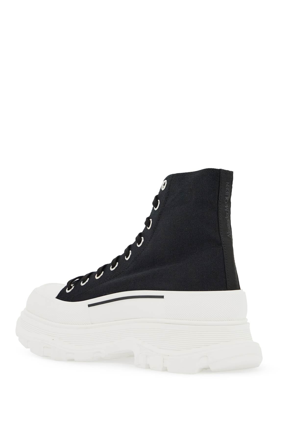 Canvas ankle boots by Alexander McQueen featuring upper wrapped at the base by a textured rubber with tone-on-tone logo and branded grosgrain tape at the back. Leather lining and oversized rubber sole. Extra laces included. Size and Fit - Heel Height = 4 cm,