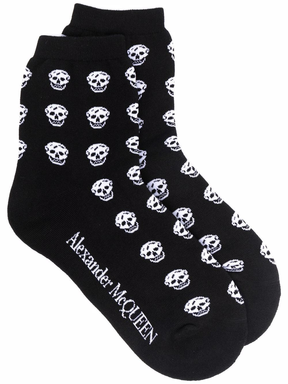 Black stretch-cotton intarsia-knit ankle socks from Alexander McQueen featuring jersey knit, intarsia knit, ankle-length and stretch-design. Be sure before opening, as socks and hosiery can only be returned in their original, unopened packaging..