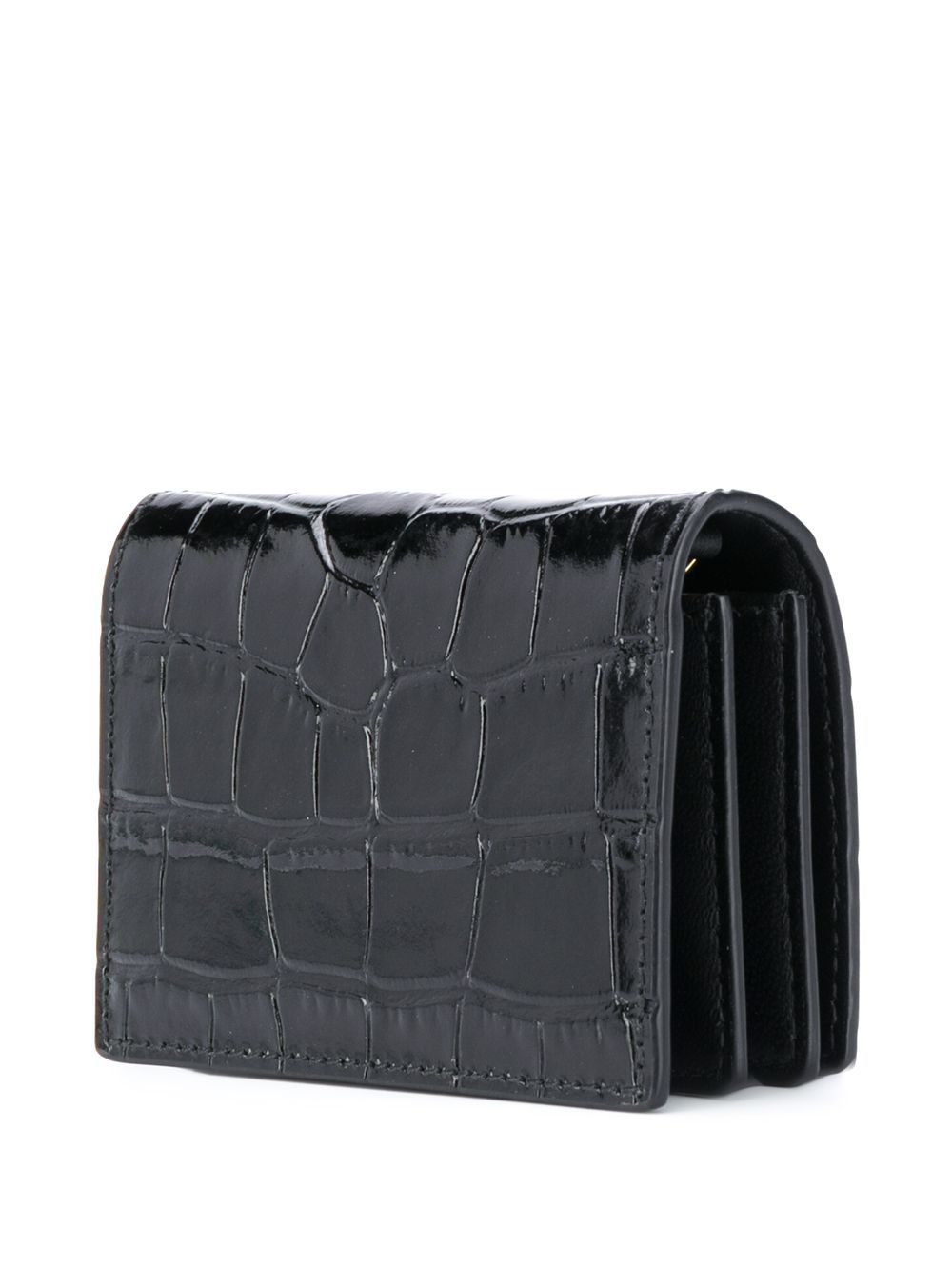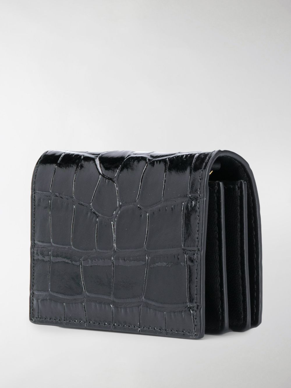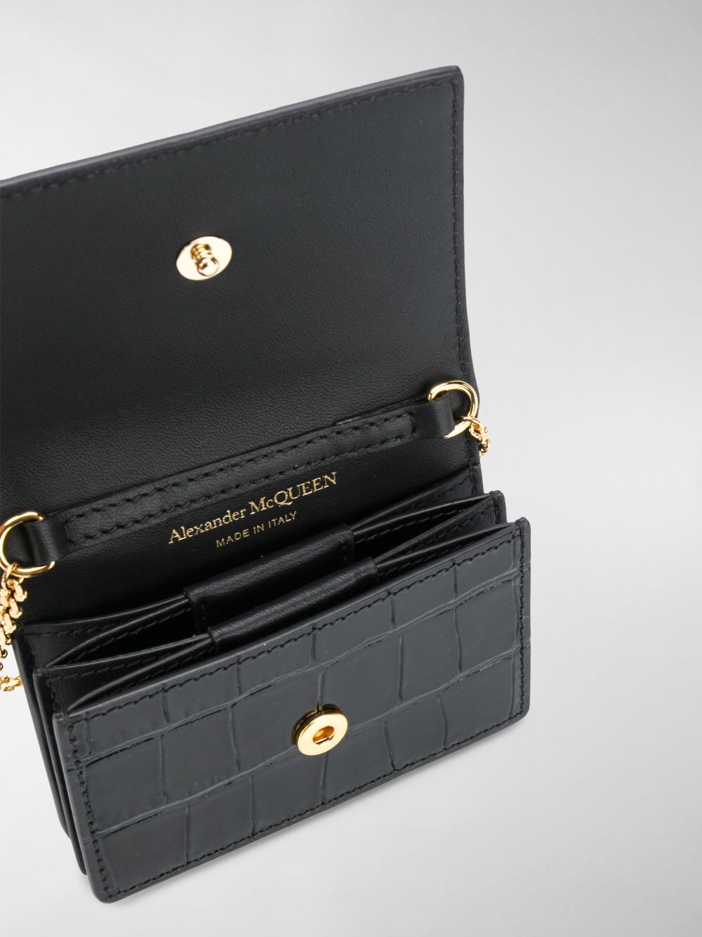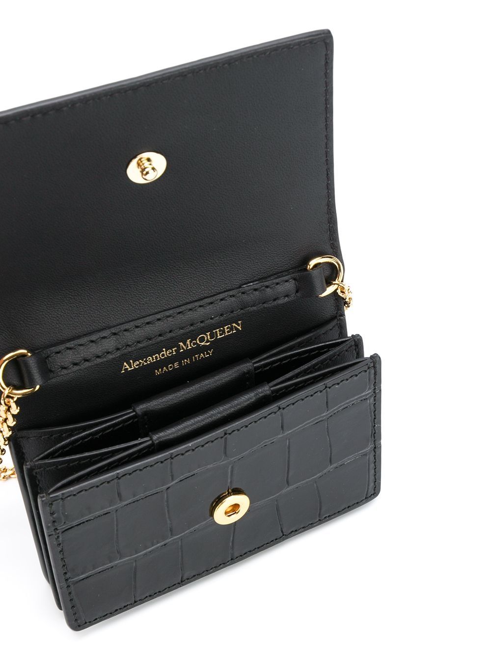Black leather skull-stud chain wallet from Alexander McQueen featuring embossed crocodile effect, skull stud detailing, foldover top with snap fastening, chain-link shoulder strap, internal logo stamp and partitioned compartment. Size and Fit - Depth 0.6 in.