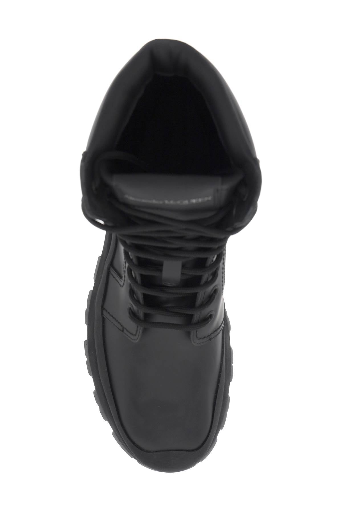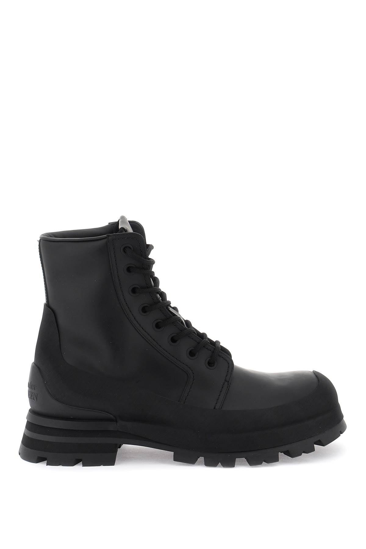 Wander ankle boots by Alexander McQueen made of rubberized leather and characterized by a galoshes-style rubber overlay and an oversize flared notched rubber sole. Lace-up closure, silver-tone lettering logo print on tongue, padded ankle, embossed logo on back, rubber lining. Size and Fit - Heel Height = 4 cm,