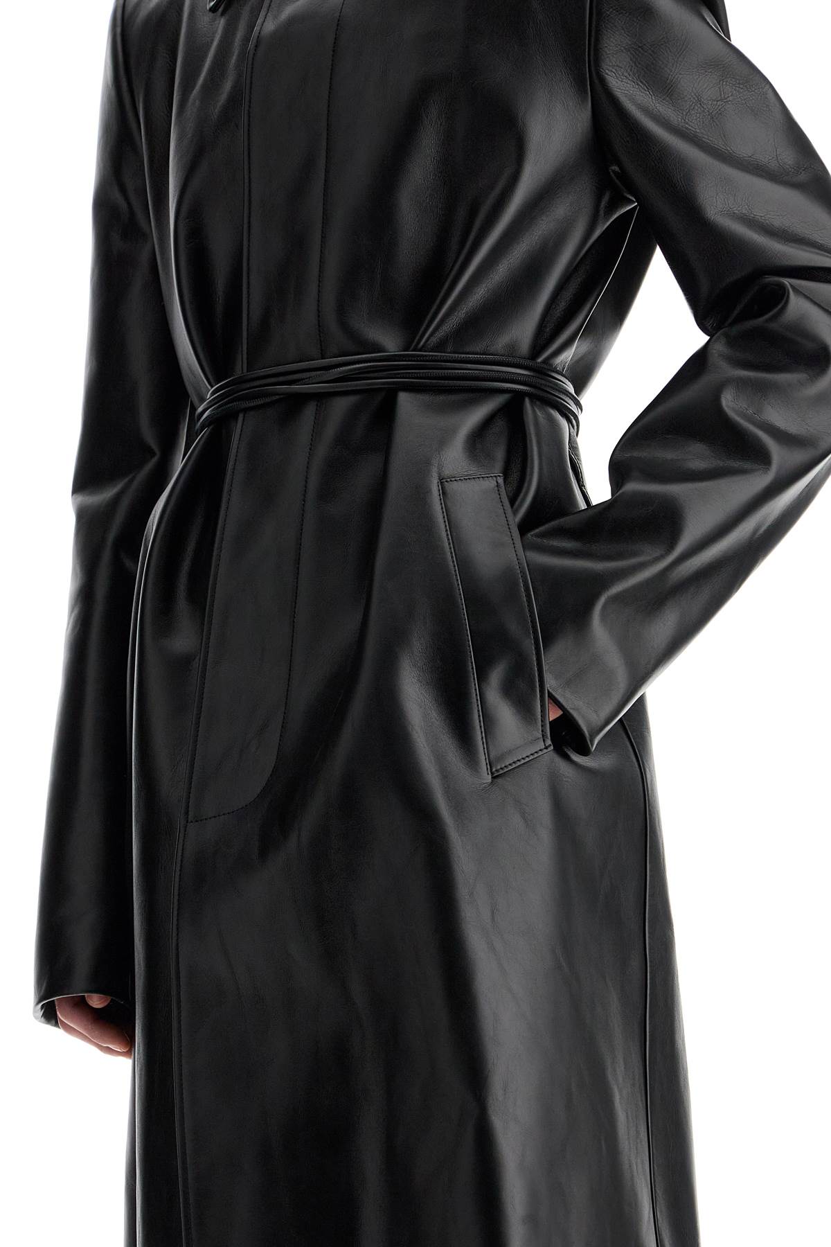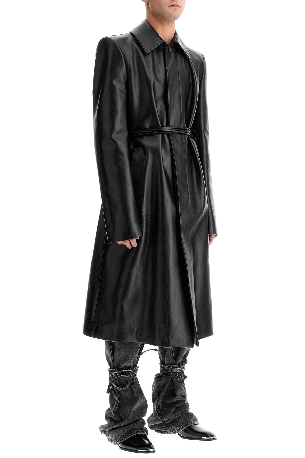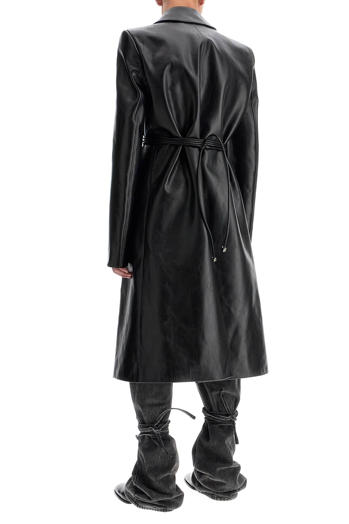 This Alexander McQueen leather waterproof coat is customized with voluminous shoulders and a thin tubular belt to tie at the waist. It features a spread collar, single-breasted hidden button closure, front welt pockets, and a back vent. Fully lined. The model is 182 cm tall and wears size IT 48.