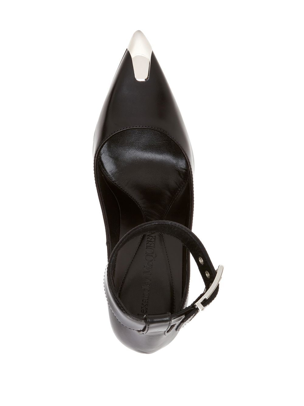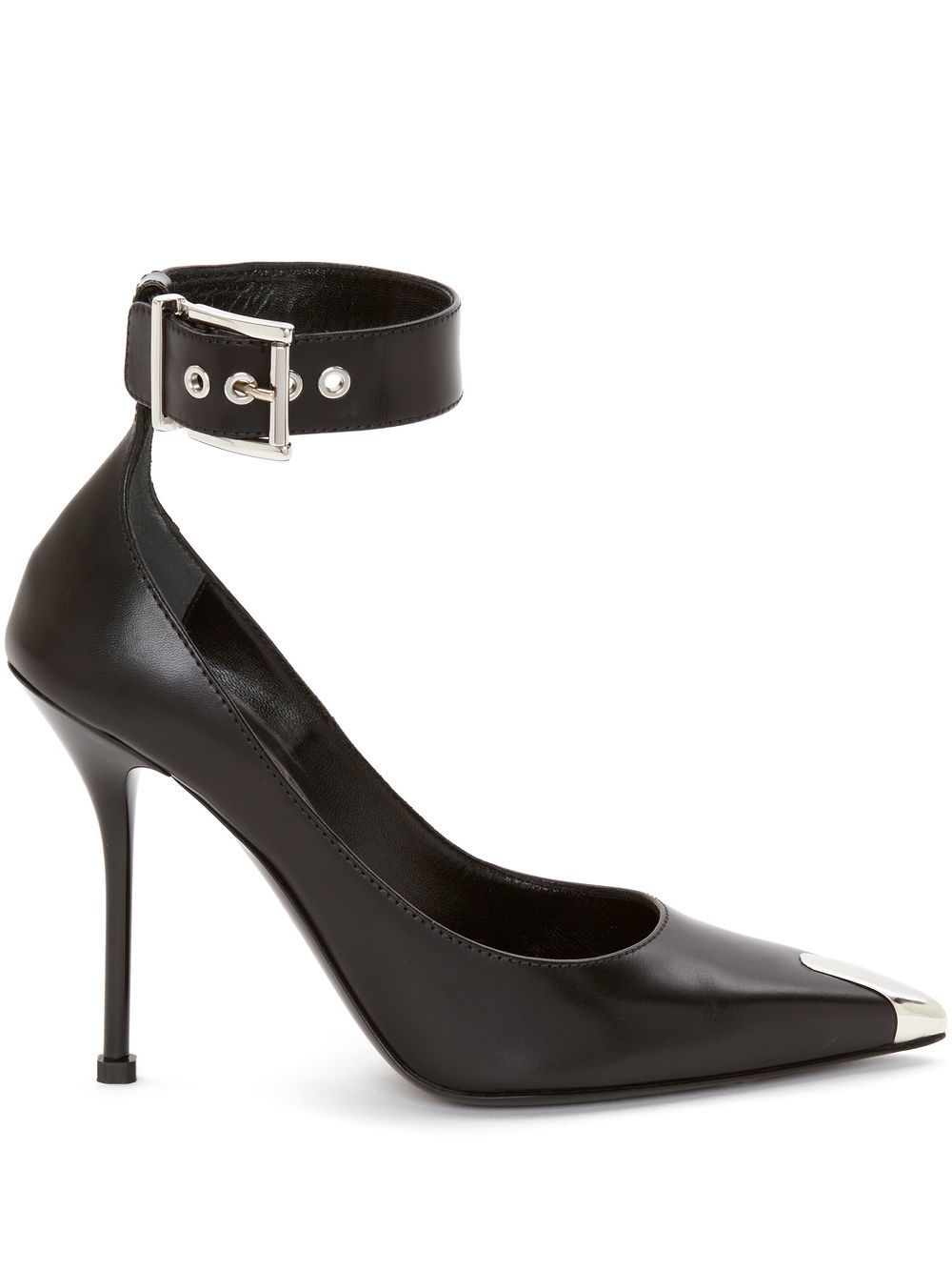 pointed-toe 105mm pumps from Alexander McQueen featuring black, calf leather, silver-tone hardware, branded insole, buckle-fastening ankle strap and high stiletto heel. Size and Fit - Heel 4,1 in / 10,502 cm