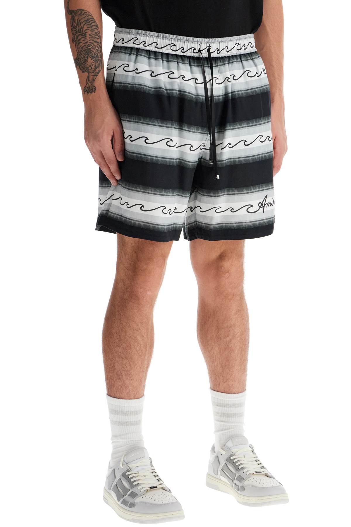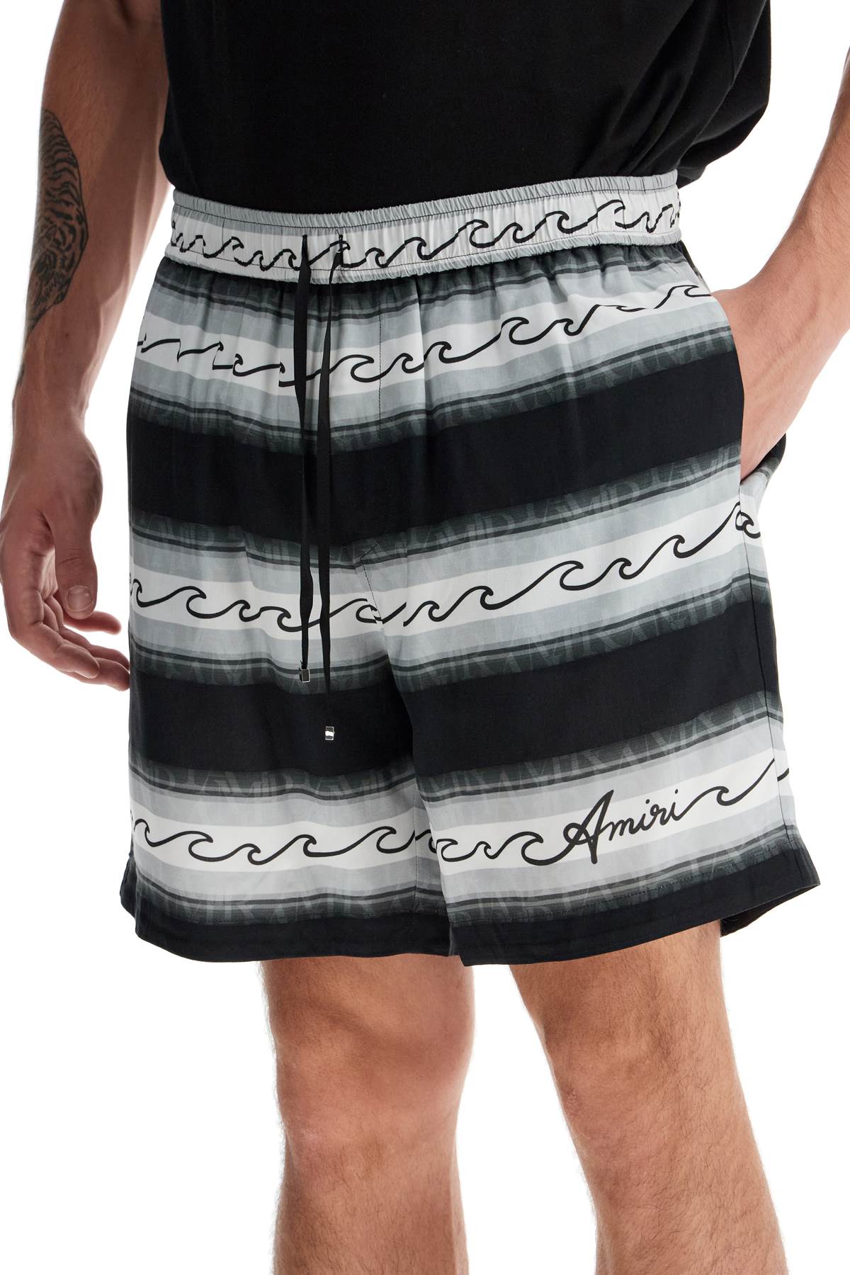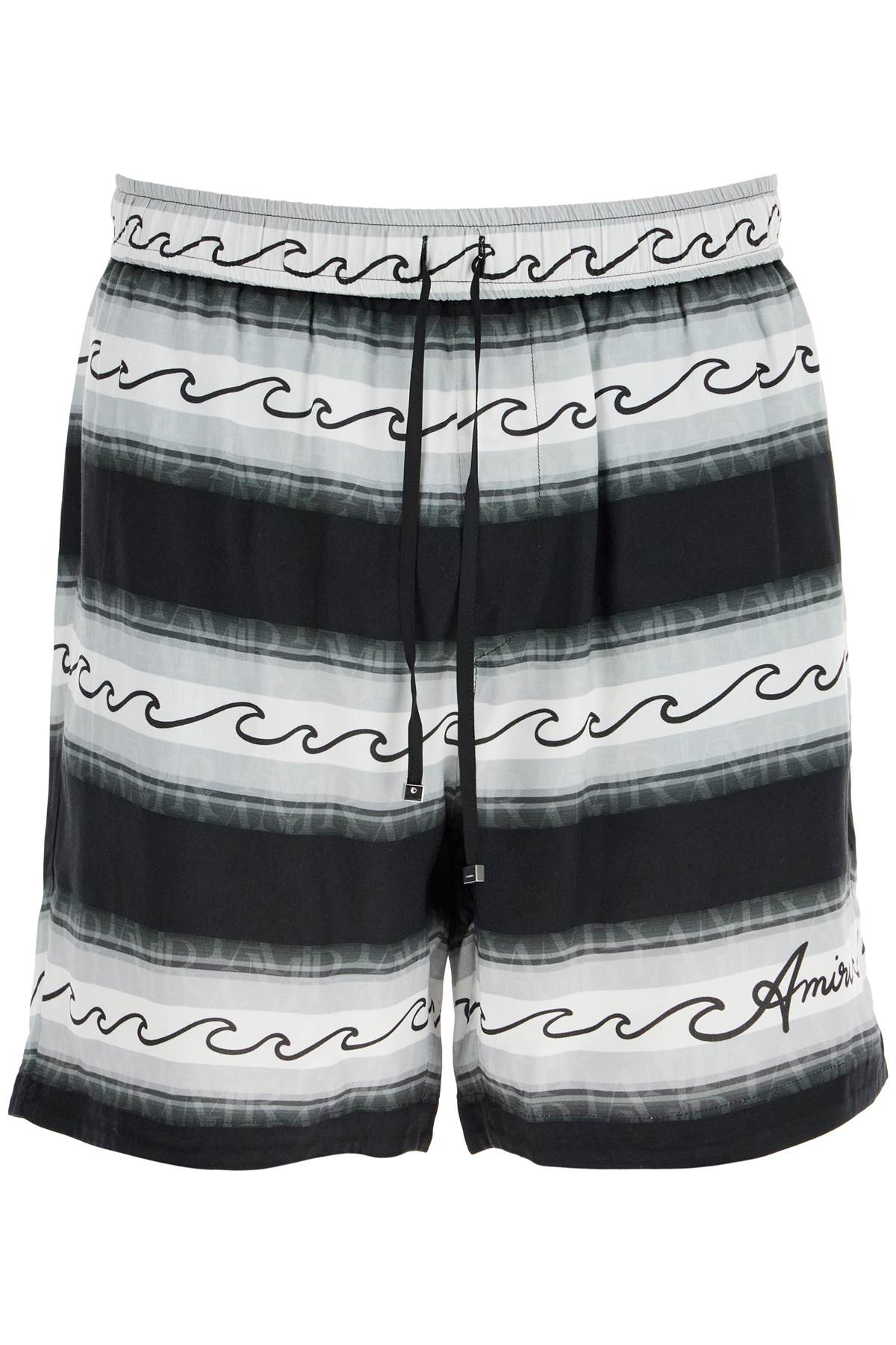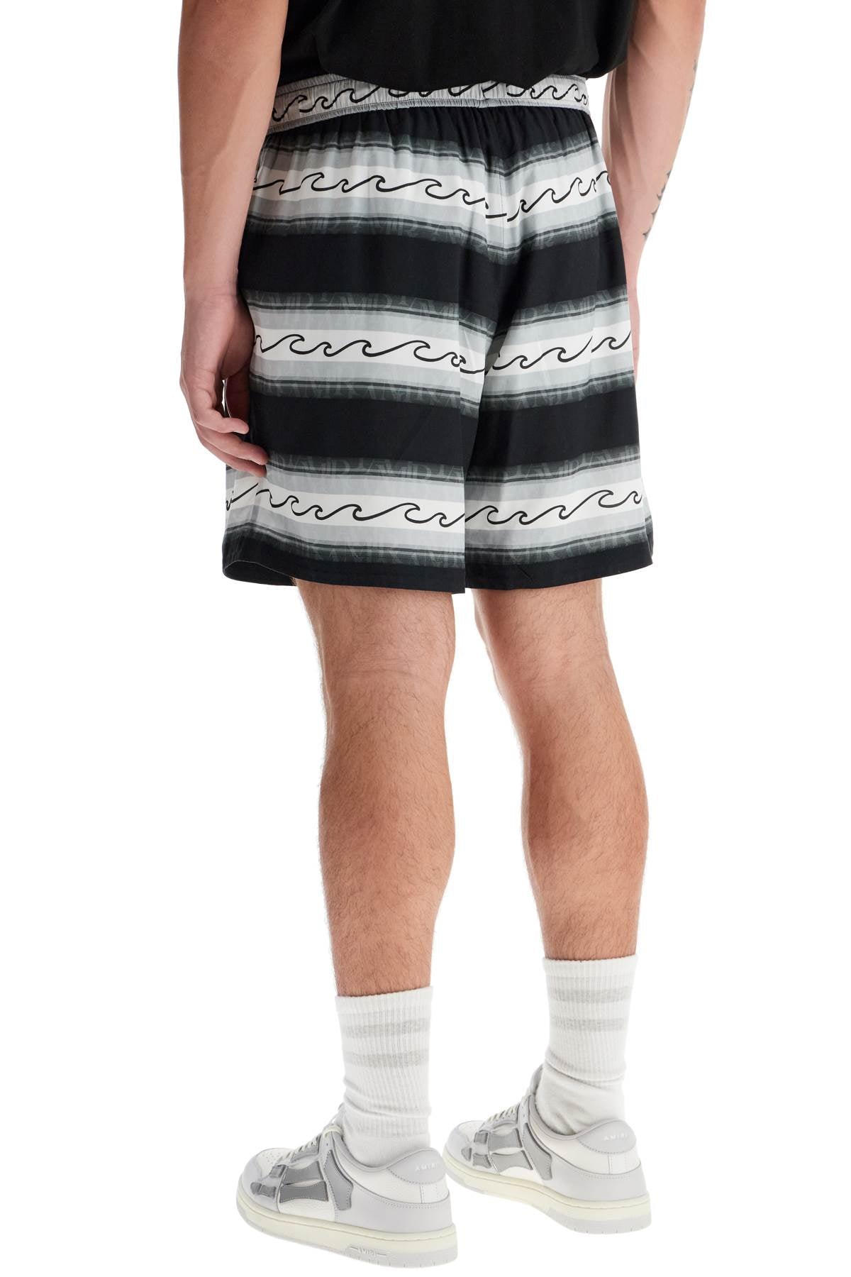 Amiri drawstring Bermuda shorts in lightweight viscose fabric, featuring the all-over Baja Stripe Wave pattern. The fit is relaxed, with an elasticated waistband and side seam pockets. Inner lining. The model is 182 cm tall and wears size M.