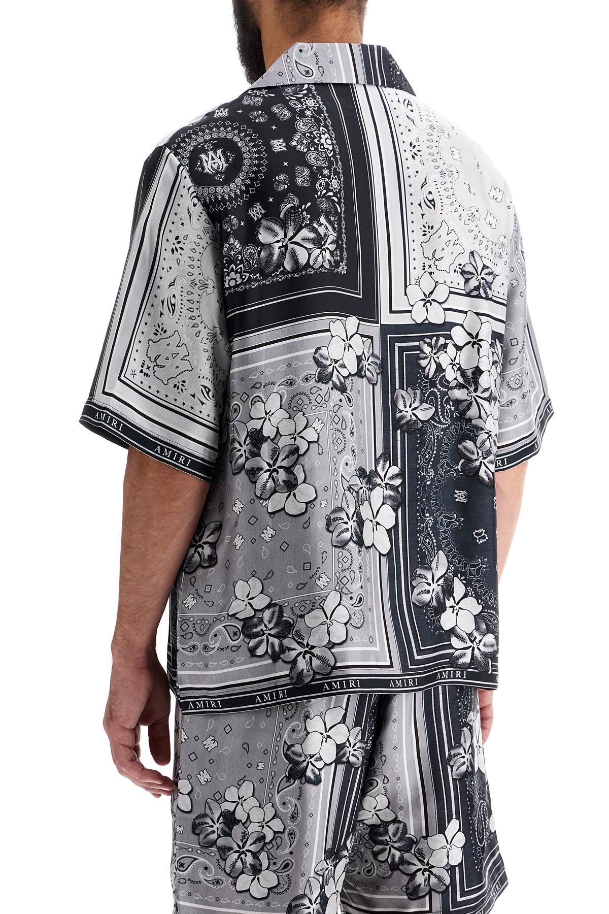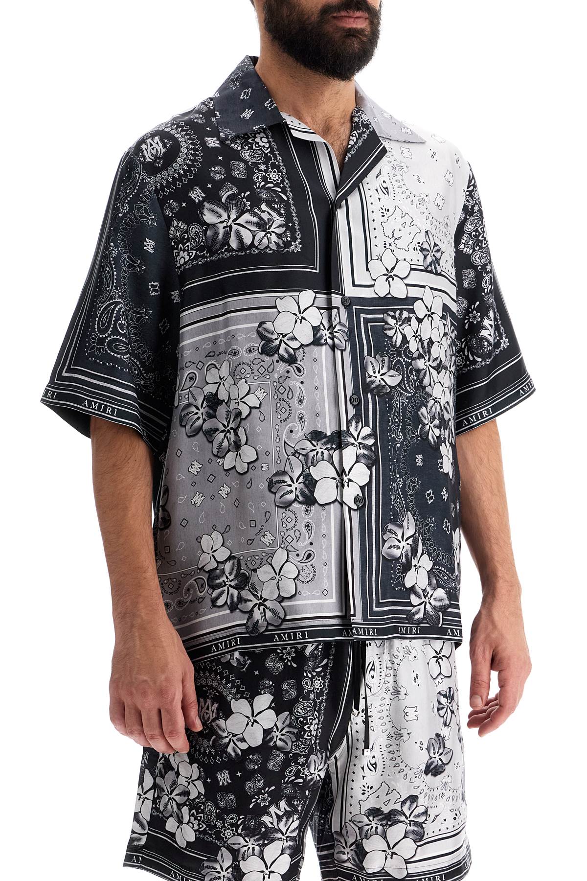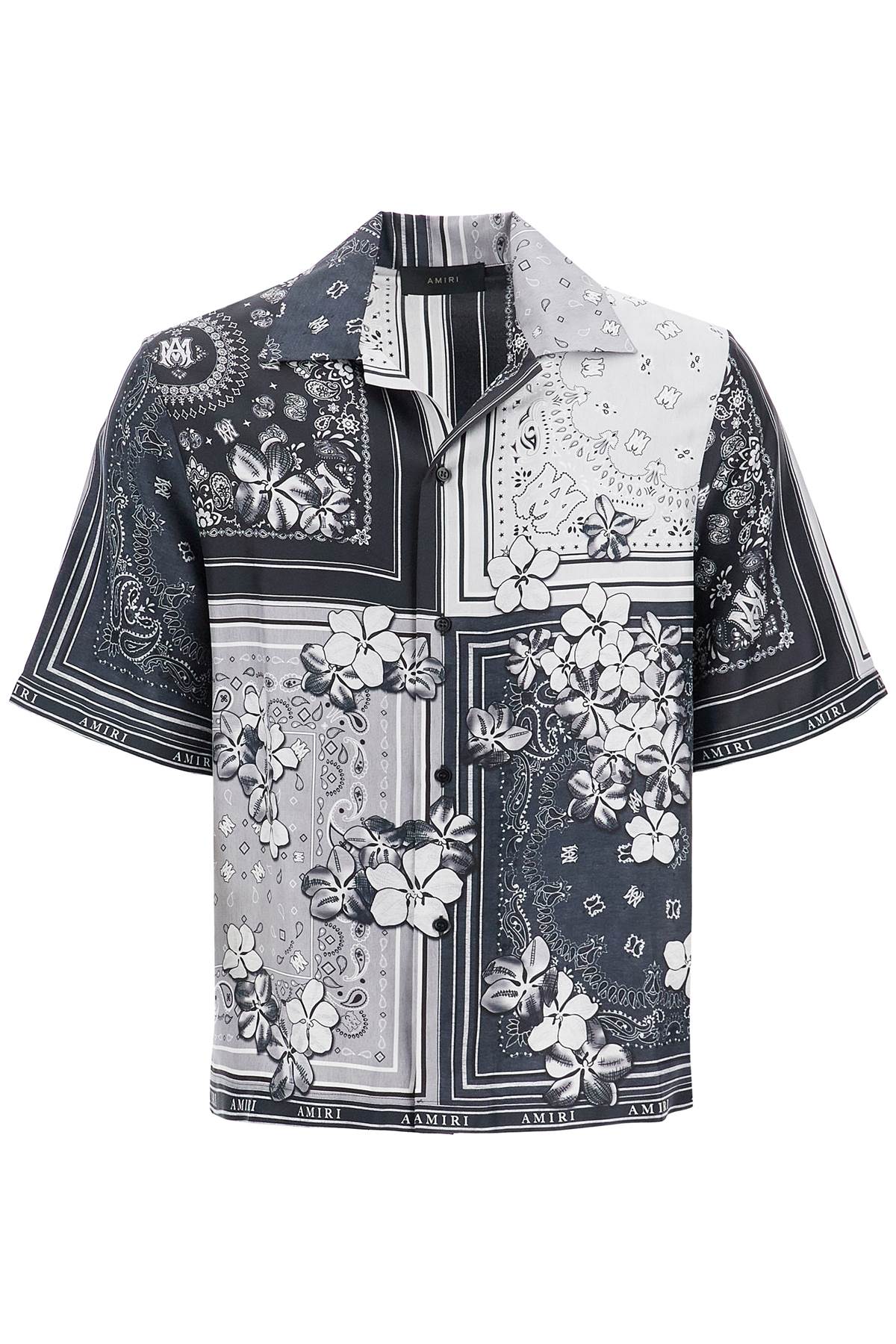 The Amiri short-sleeved shirt is made of pure silk twill with a floral bandana print and logo borders. It has a boxy cut for a relaxed fit, with a Cuban collar and classic button closure. The model is 187 cm tall and wears size L.