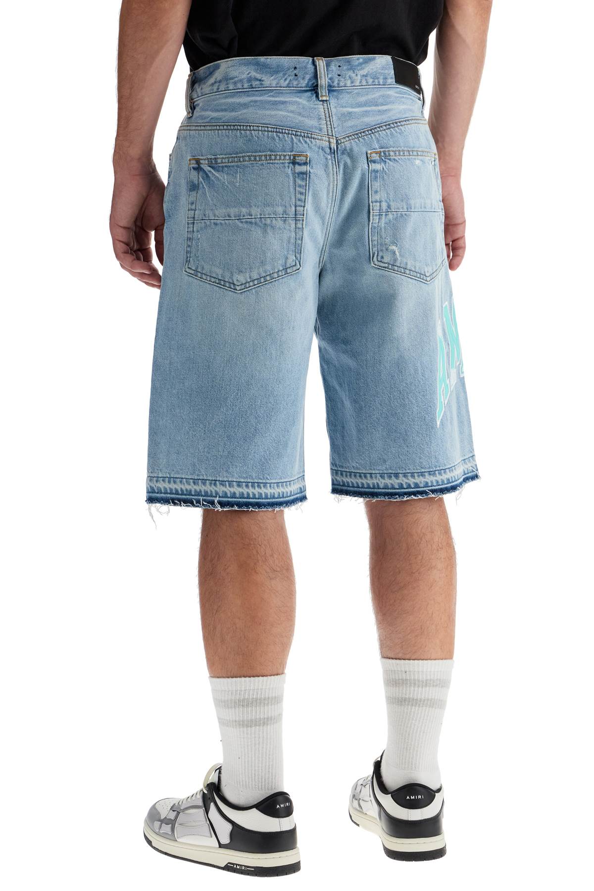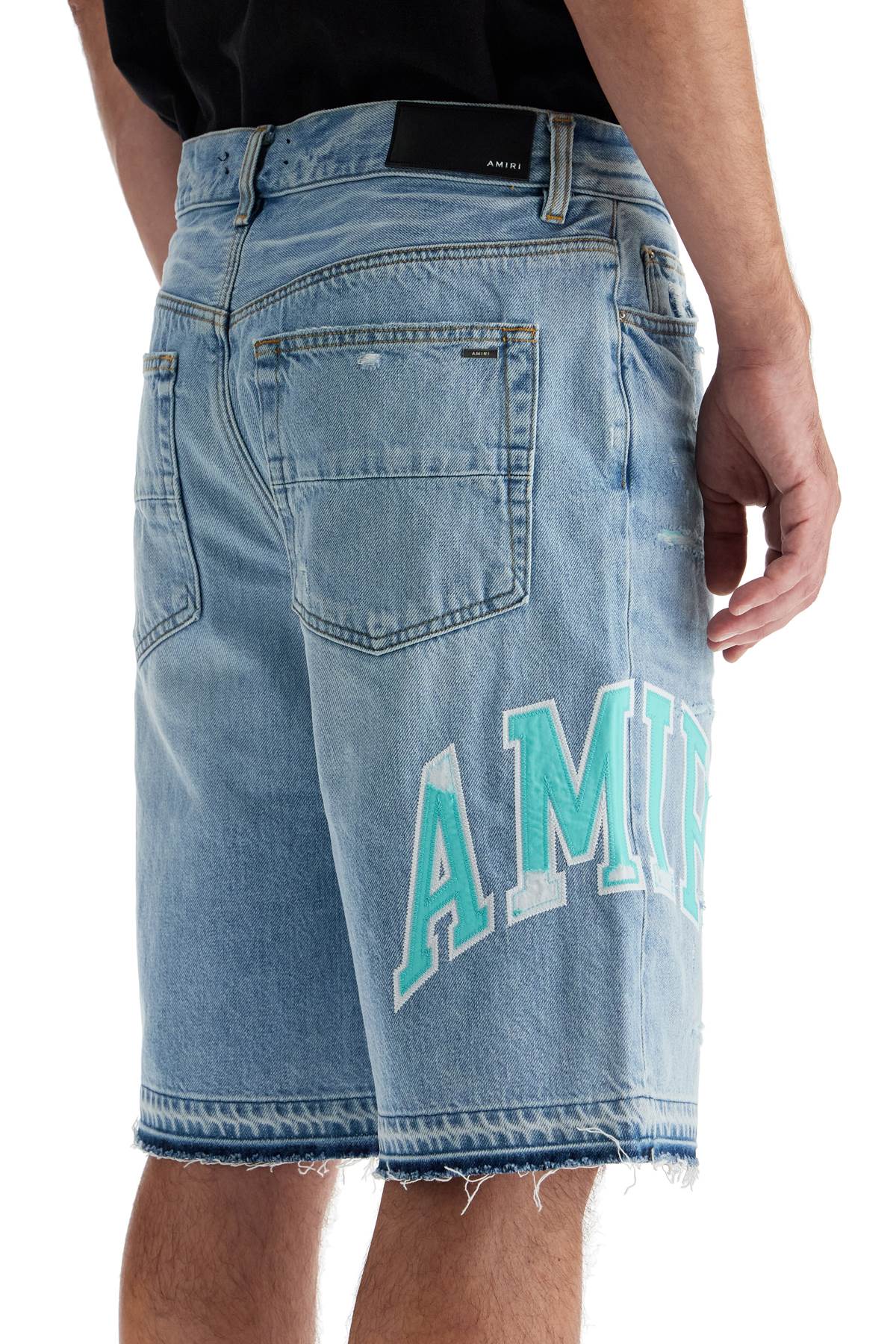 The Amiri Bermuda shorts in distressed denim are characterized by mended details and a varsity logo application. This five-pocket model has a wide, low-waisted cut with belt loops and button closure. The model is 187 cm tall and wears size 31.