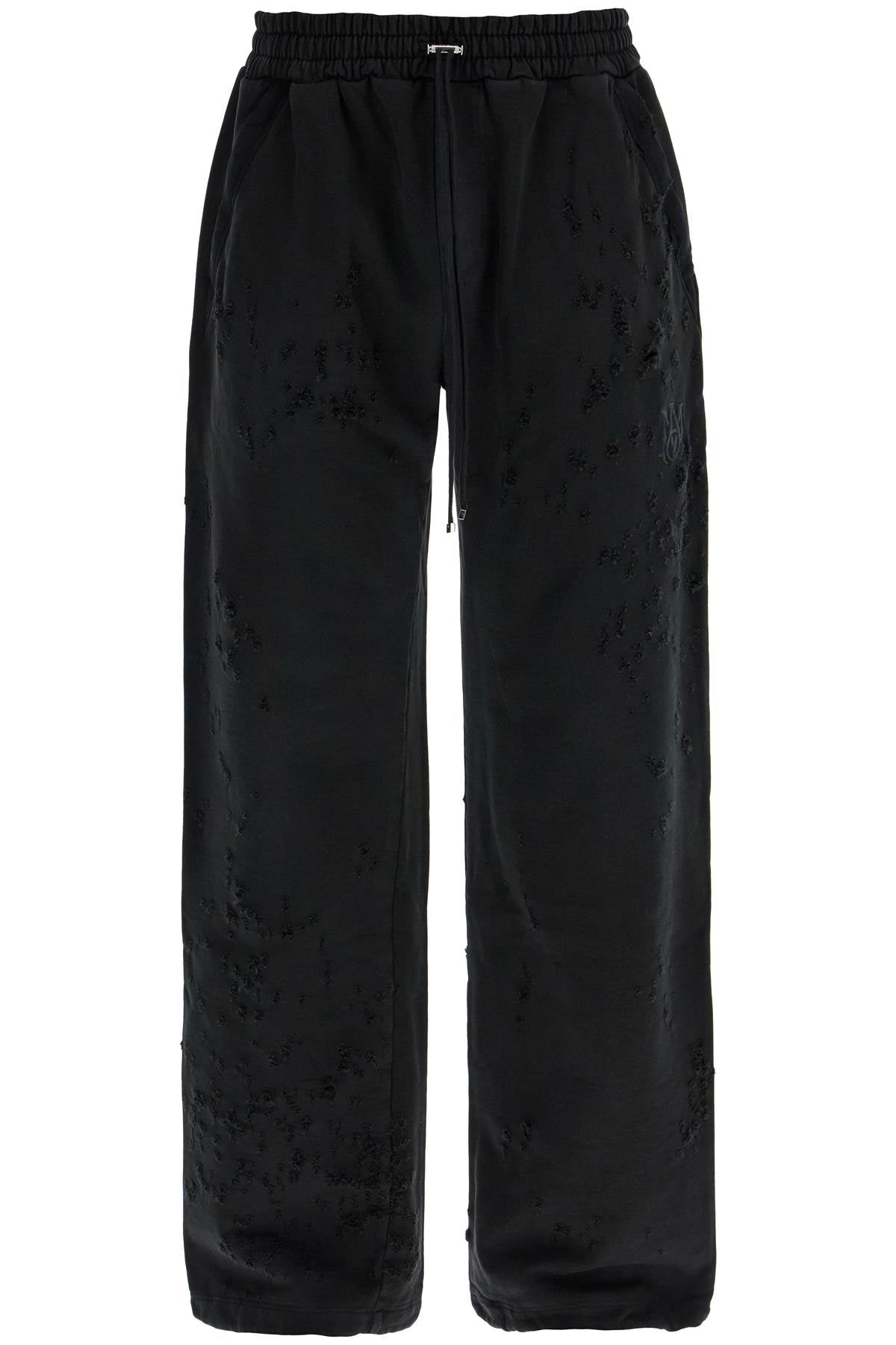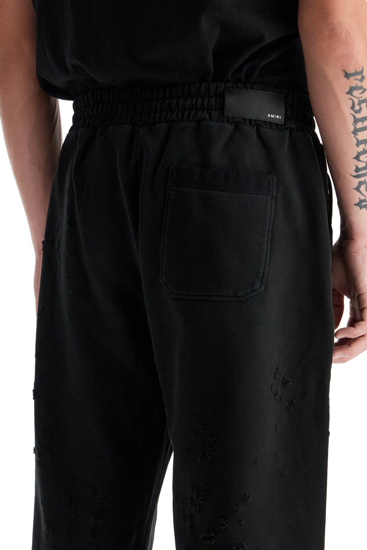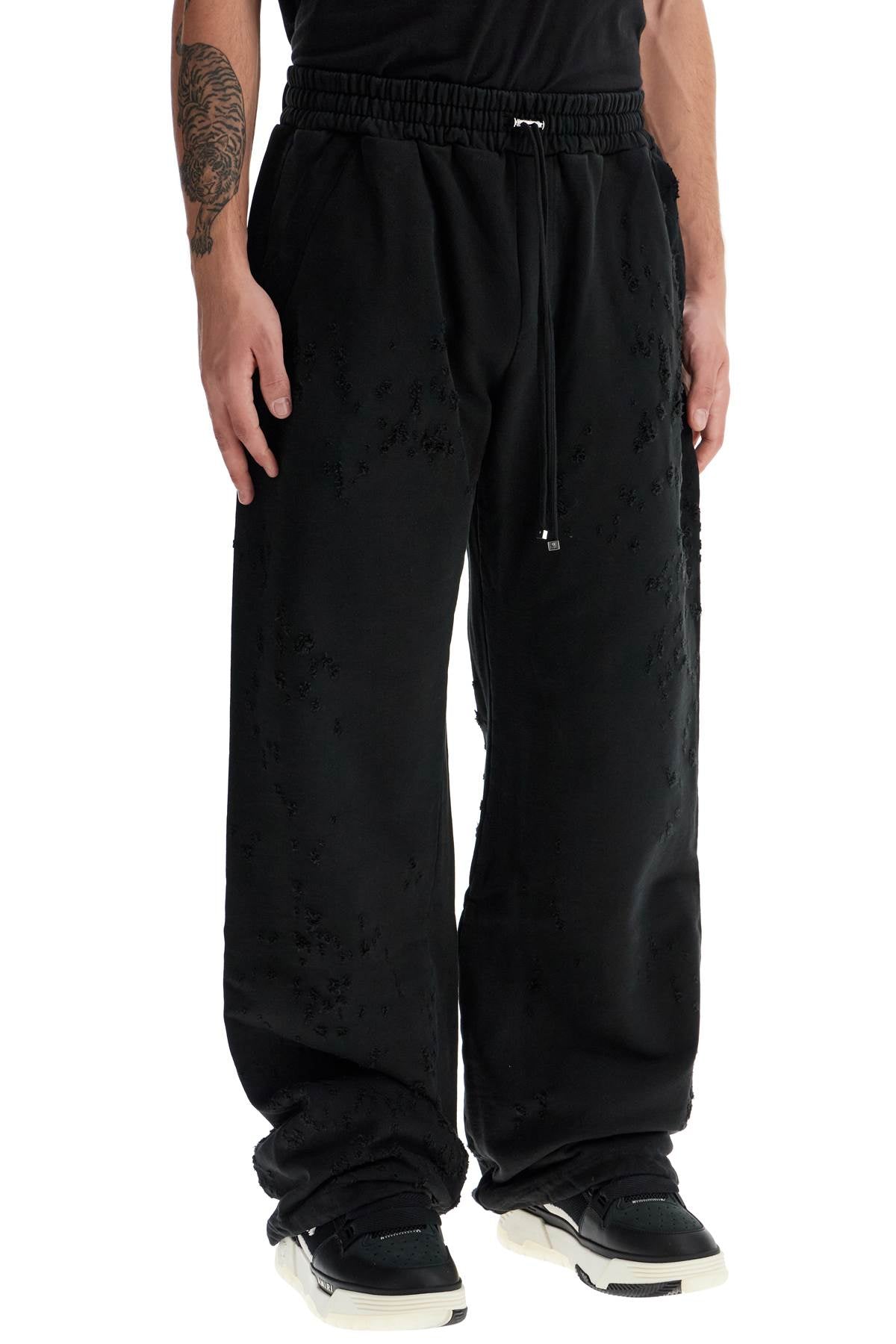 Amiri straight and wide-cut joggers with an adjustable elasticated waistband featuring a drawstring, made of soft French terry cotton with distressed finishes and embroidered MA logo. They have profiled side pockets in grosgrain and a patch pocket on the back. Logo patch on the back. The model is 182 cm tall and wears size L.