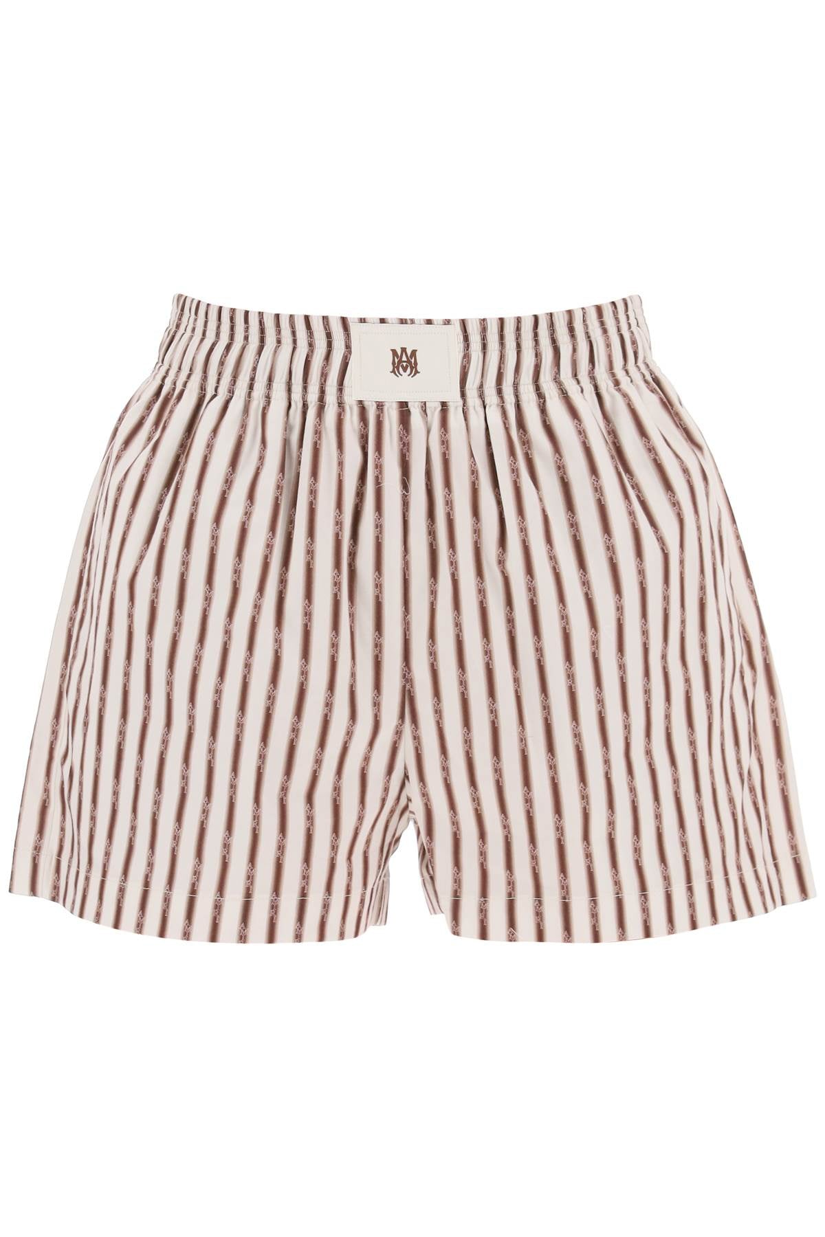 Pajama-inspired sweatshorts by Amiri, made from pure cotton voile with striped logo motif all over. They feature elasticated waistband enriched by MA label on the front, inseam pockets and a back patch pocket. Loose fit. The model is 177 cm tall and wears size S.