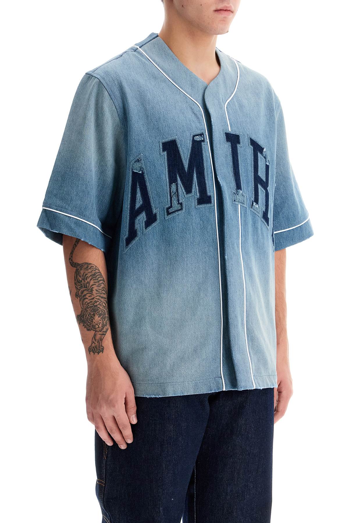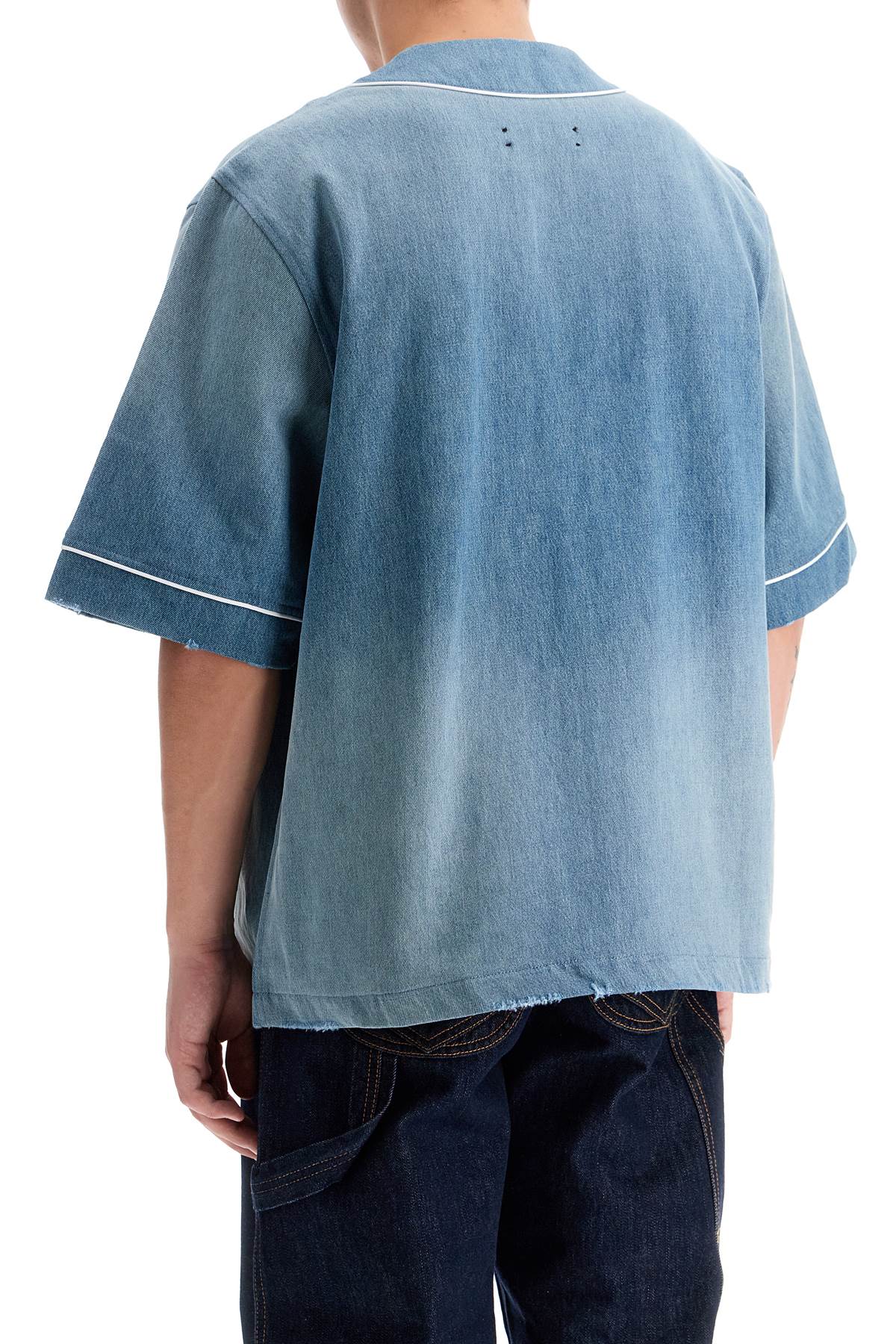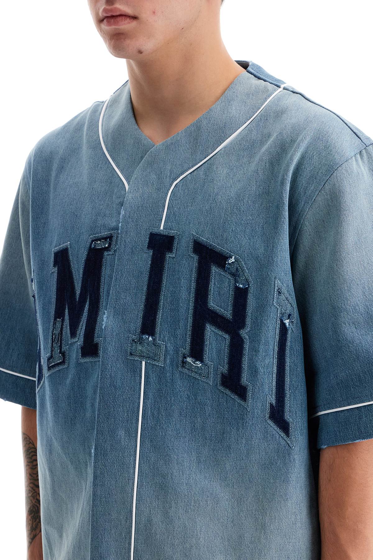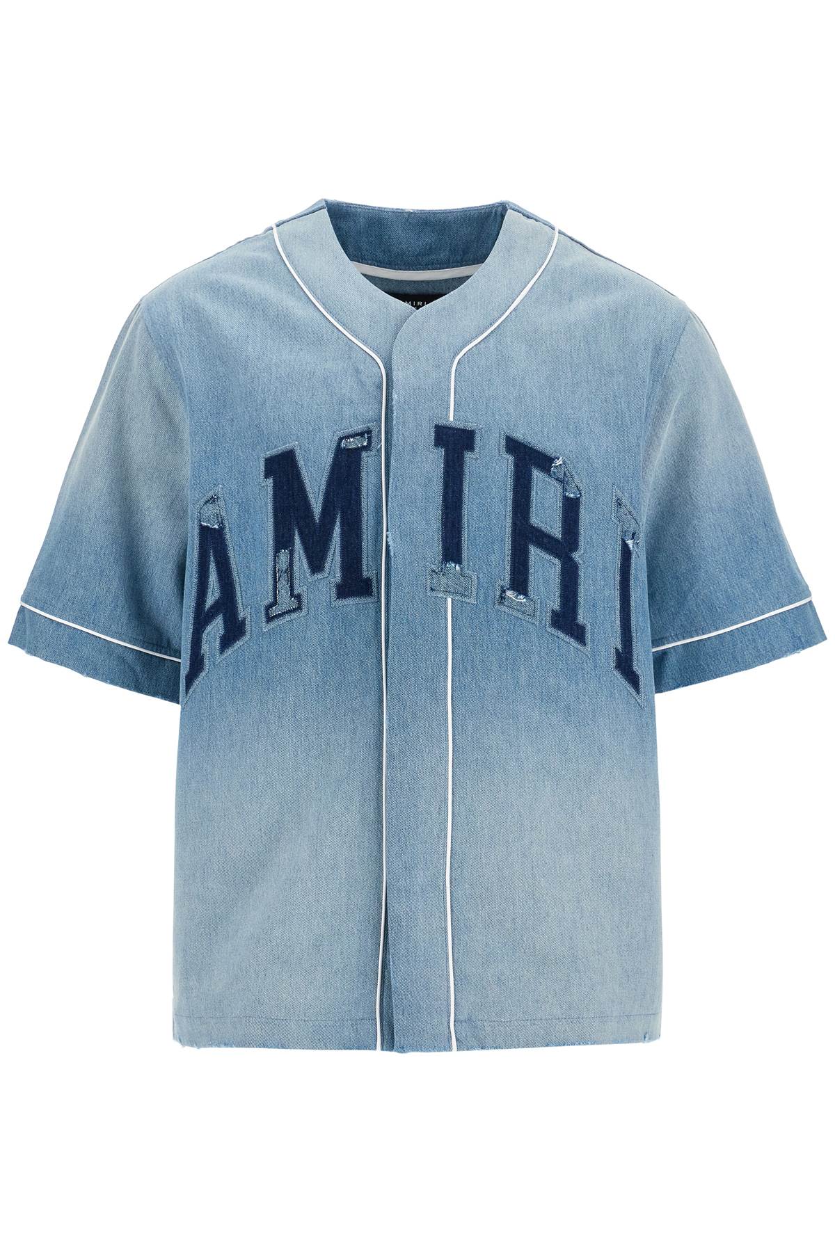 The Amiri short-sleeved baseball shirt is made of stone-washed denim for a lived-in look, enhanced by the decortiqué effect logo patch and distressed hems. Finished with contrasting piping, it features hidden snap closures. Boxy fit. The model is 182 cm tall and wears size L.