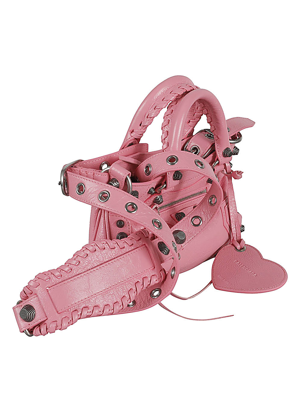 Handbag neo -pink, trapezoidal shape, two hand wrapped leather handles, adjustable and removable shoulder strap, antique silver finishes, frontconcon pocket with knotted leather tire, closing with hinge with knotted leather tire, an internal pocket with z Size and Fit - Width 9,84 in / 25 cm