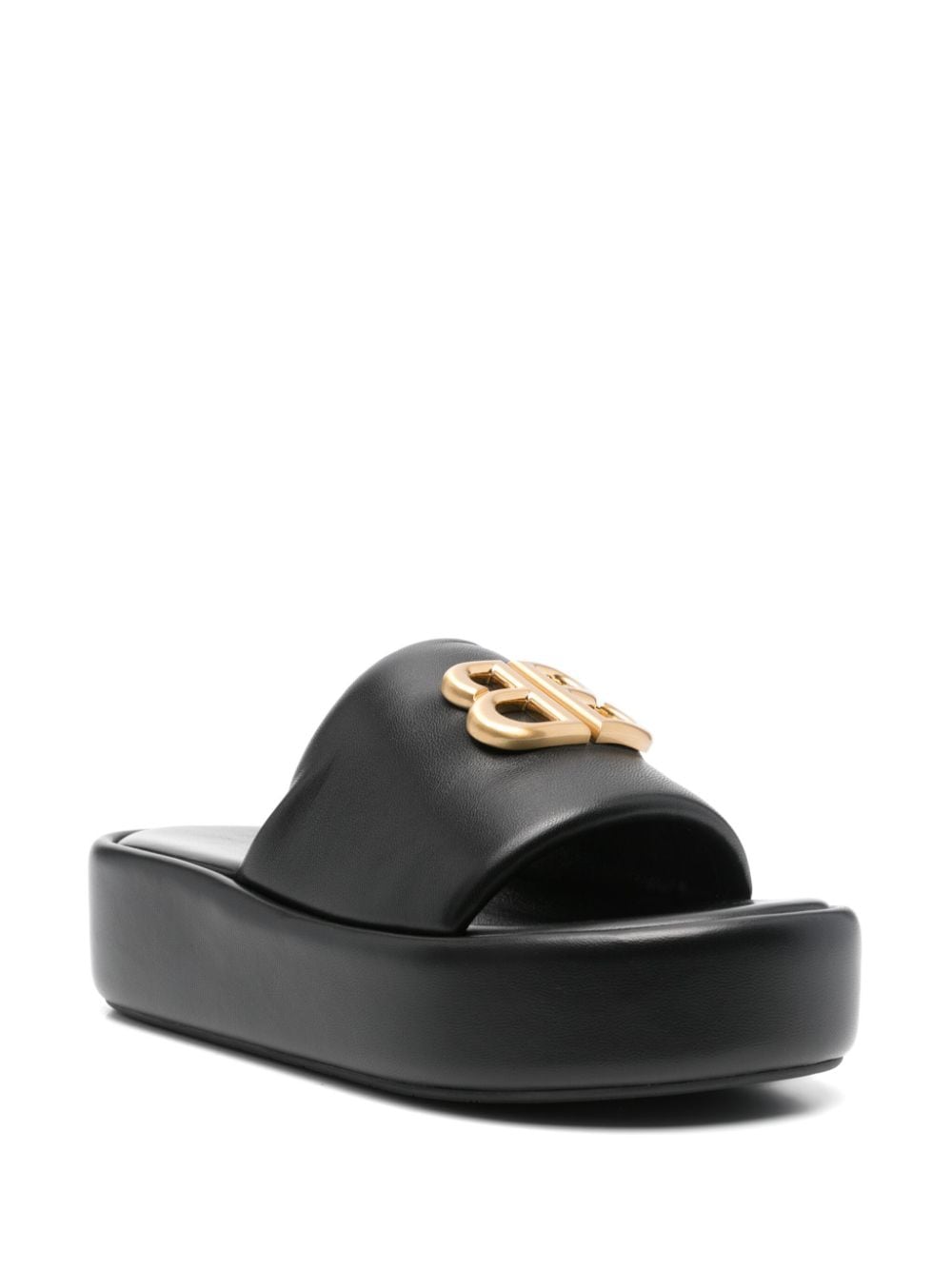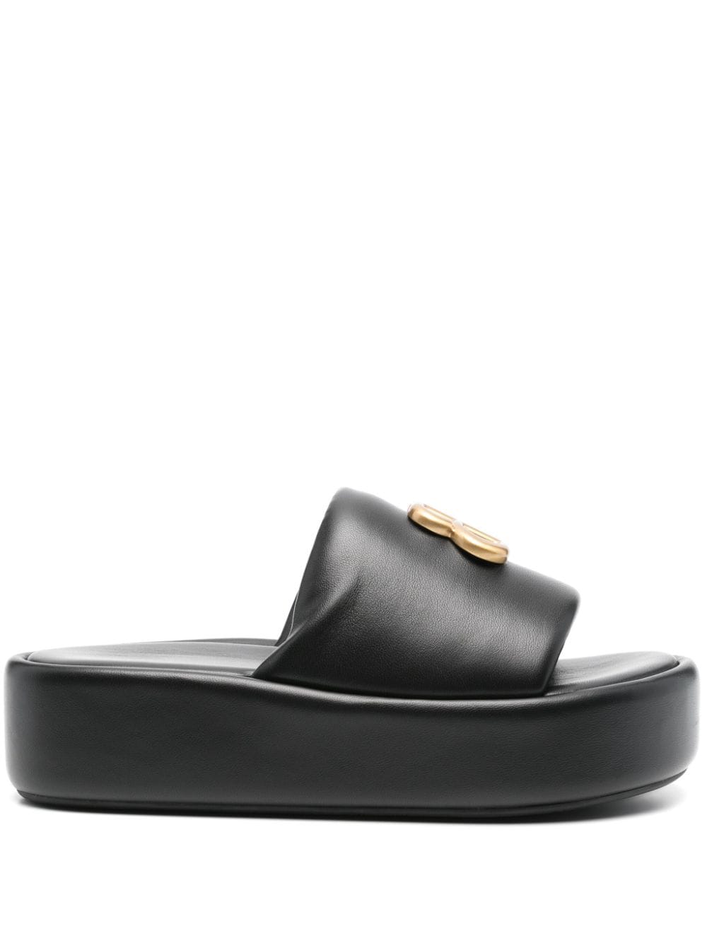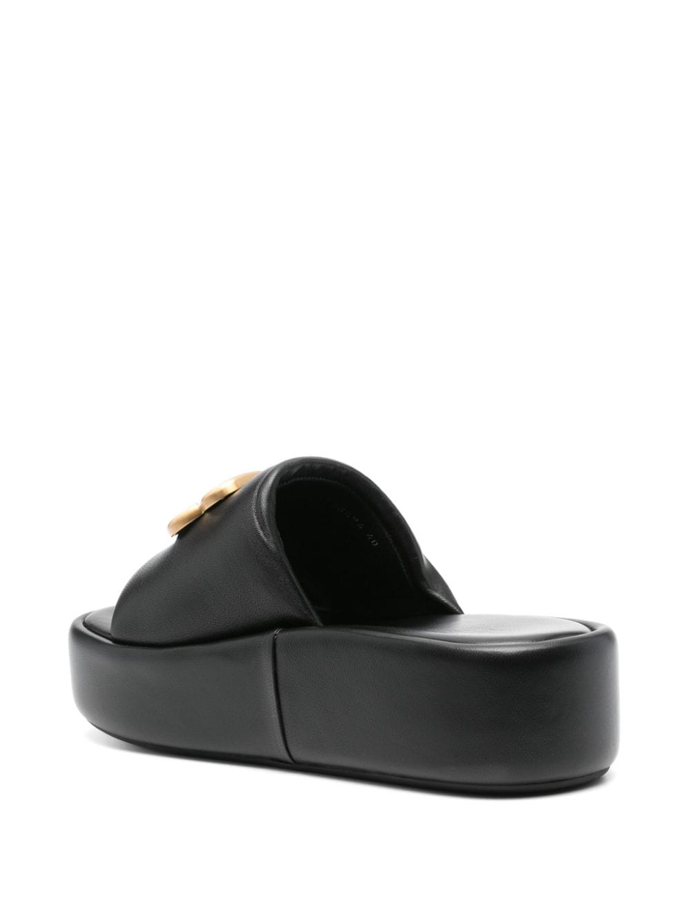 black lambskin smooth grain gold-tone logo plaque slip-on style open toe branded leather insole platform sole We've partnered with Good On You — an independent agency that rates how brands perform in relation to their impact on the planet, people and animals, with a multi-criteria rating simplified to a five points scale. In order to be awarded our conscious label, larger brands need to score a minimum of four out of five ('Good'), while smaller brands must score at least three out of five ('It's a start'). This item comes from a brand rated four out of five ('Good') by Good on You at the time it was added on FARFETCH. Please note, this is a brand-level rating and does not guarantee that this product is made with conscious materials. Learn more about what makes a product Conscious on our Conscious Criteria page Size and Fit - Heel 2,8 in / 7 cm; Platform 1,6 in / 4 cm