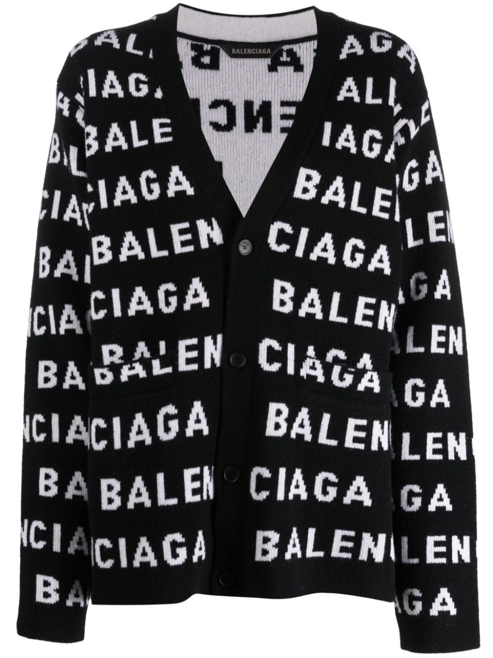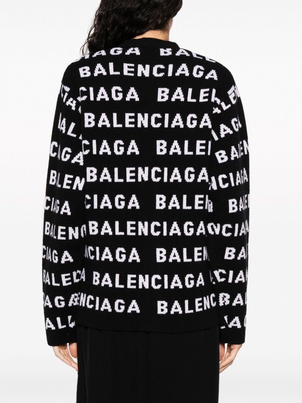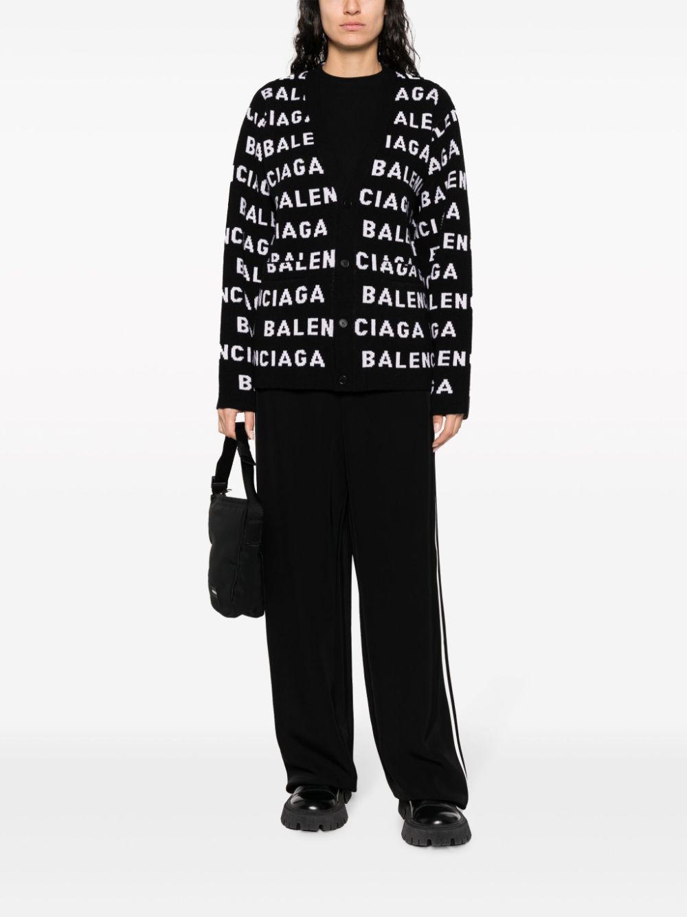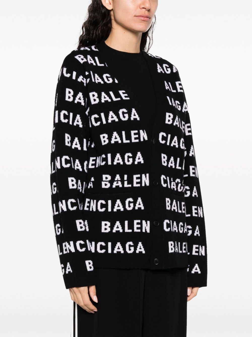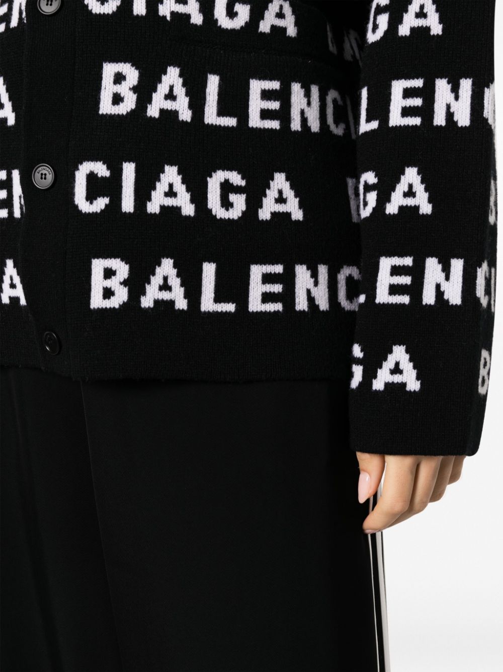 intarsia-knit logo-motif cardigan from BALENCIAGA featuring intarsia-knit logo, V-neck, two front welt pockets, ribbed cuffs and hem, black/white, wool blend, front button fastening and long sleeves. We've partnered with Good On You — an independent agency that rates how brands perform in relation to their impact on the planet, people and animals, with a multi-criteria rating simplified to a five points scale. In order to be awarded our conscious label, larger brands need to score a minimum of four out of five ('Good'), while smaller brands must score at least three out of five ('It's a start'). This item comes from a brand rated four out of five ('Good') by Good on You. Please note, this is a brand-level rating and does not guarantee that this product is made with conscious materials.. Learn more about what makes a product Conscious on our Conscious Criteria page. Size and Fit - This piece fits true to size. We recommend you get your regular size. Model is 1,75m / 5ft 8in wearing size 1 (NUM)