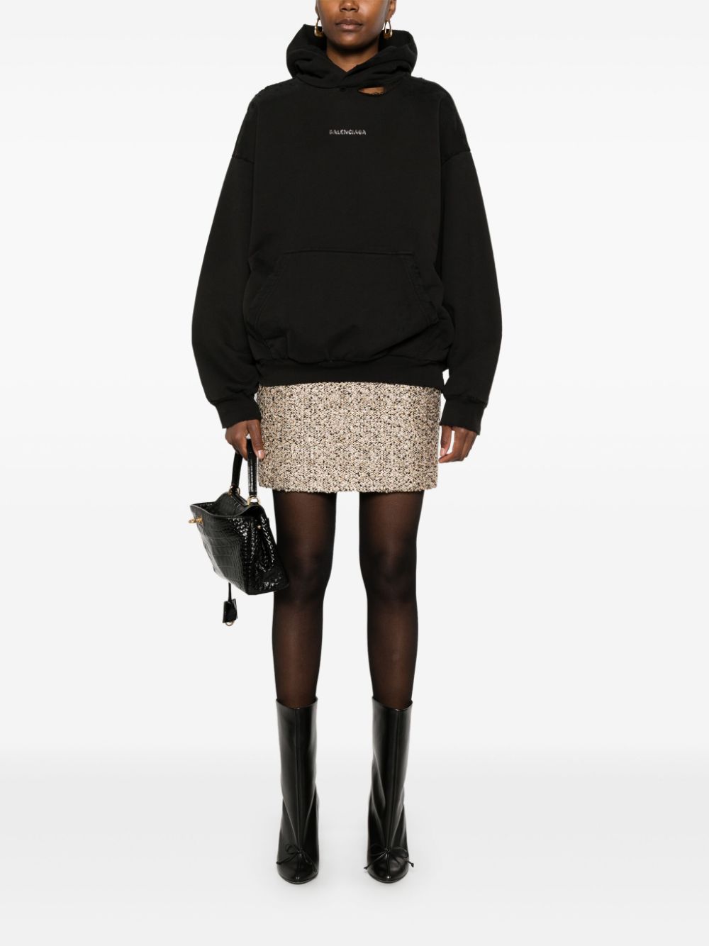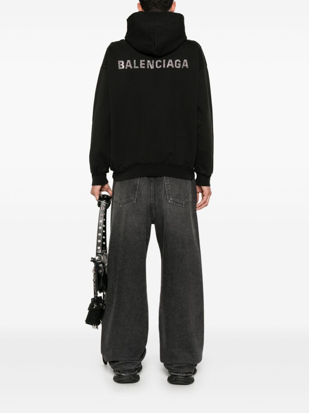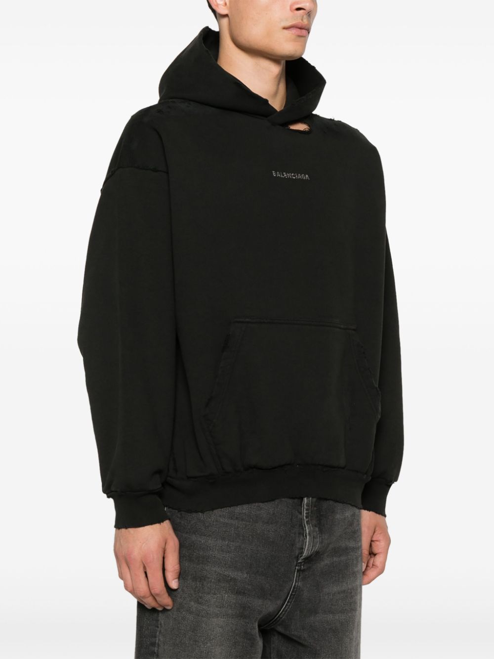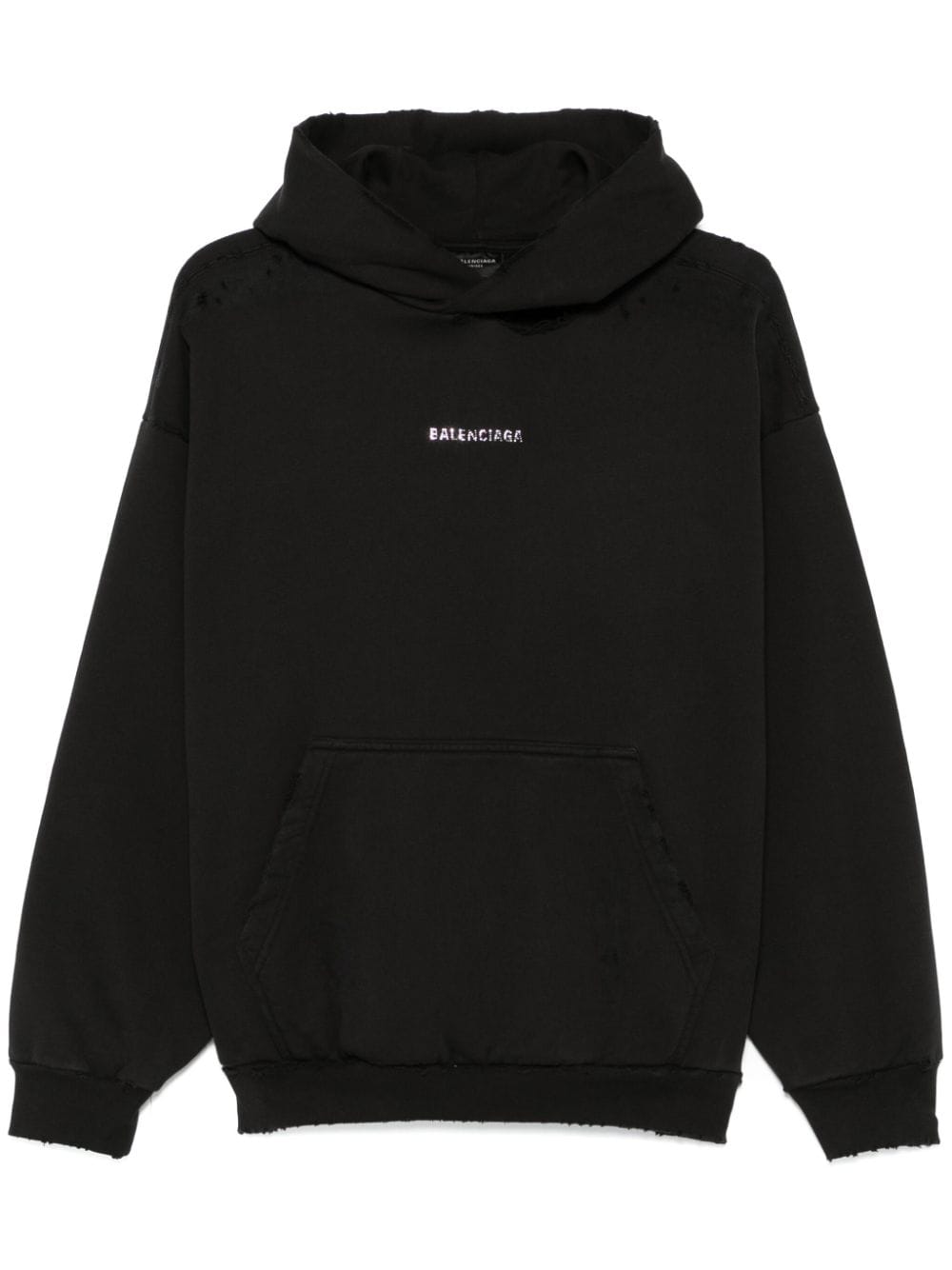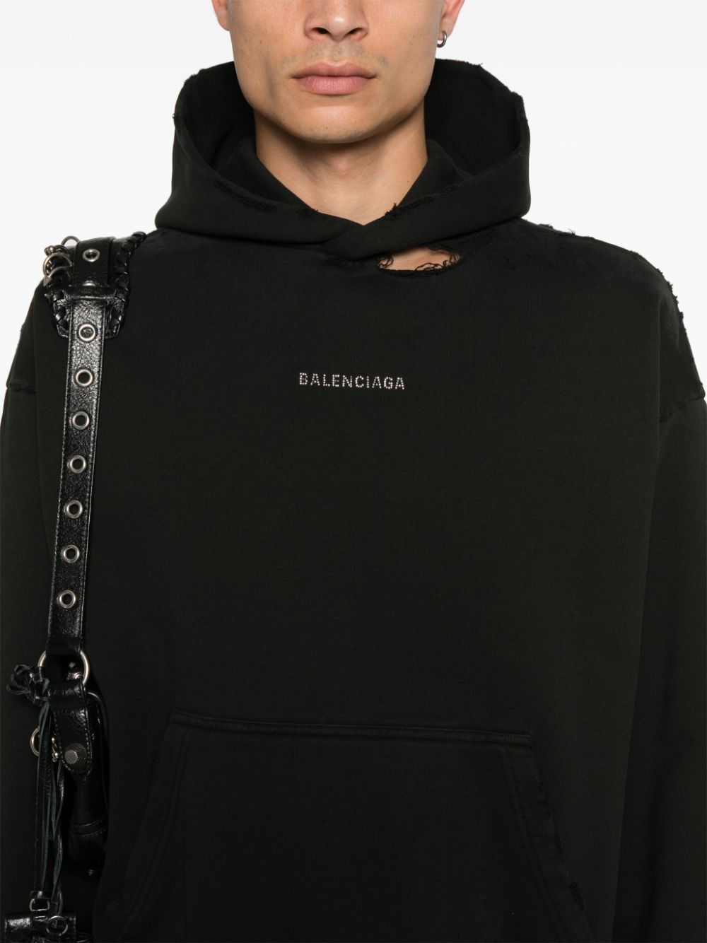 black cotton jersey texture distressed effect rhinestone logo embellishment to the front and back slouchy hood ripped detailing drop shoulder long sleeves front pouch pocket French terry lining ribbed cuffs and hem When buying this unisex item, keep in mind that it is graded in standard men's sizing. Size and Fit - This piece fits true to size. We recommend you get your regular size. Model is 1,75m / 5ft 8in wearing size S