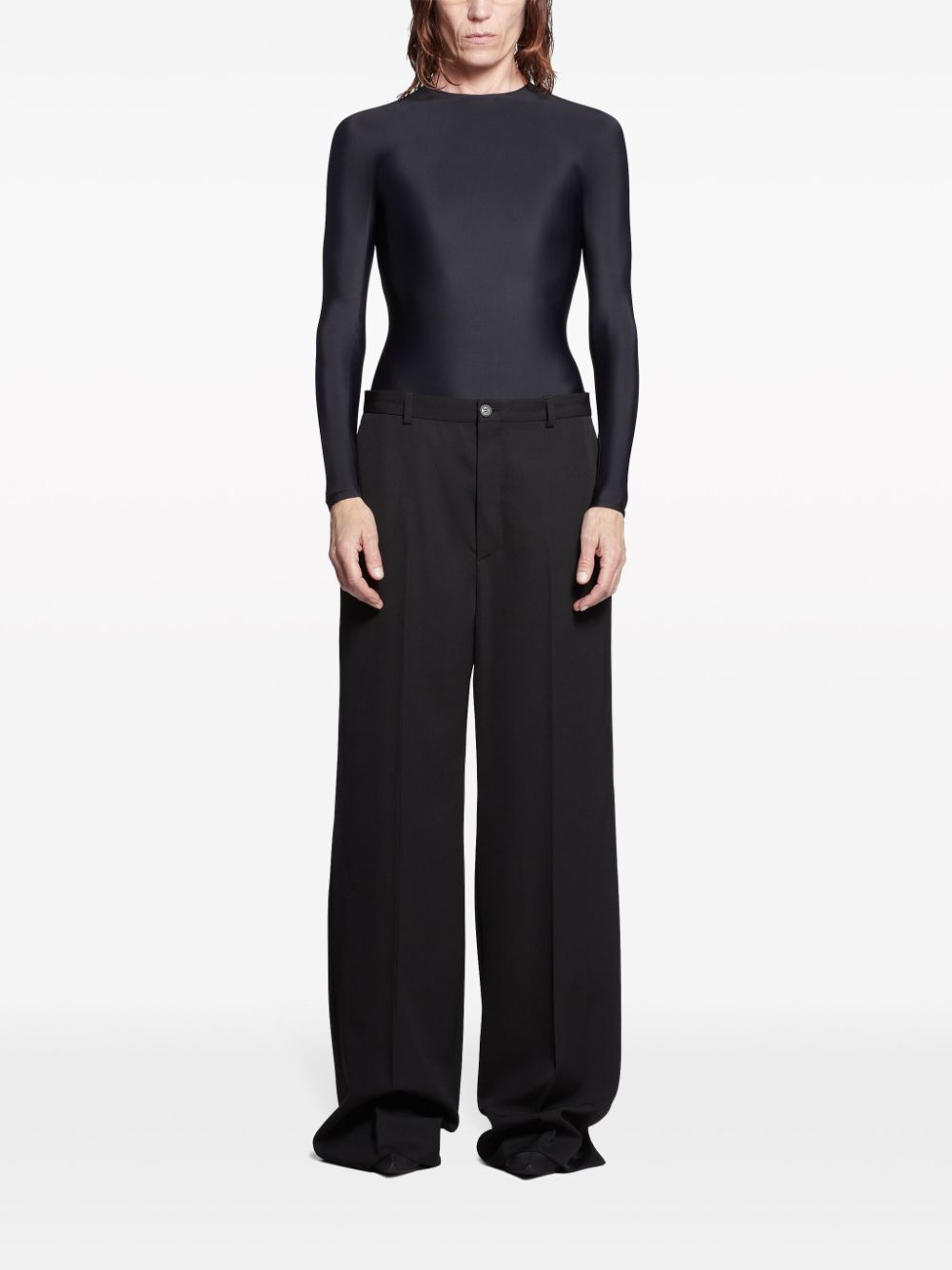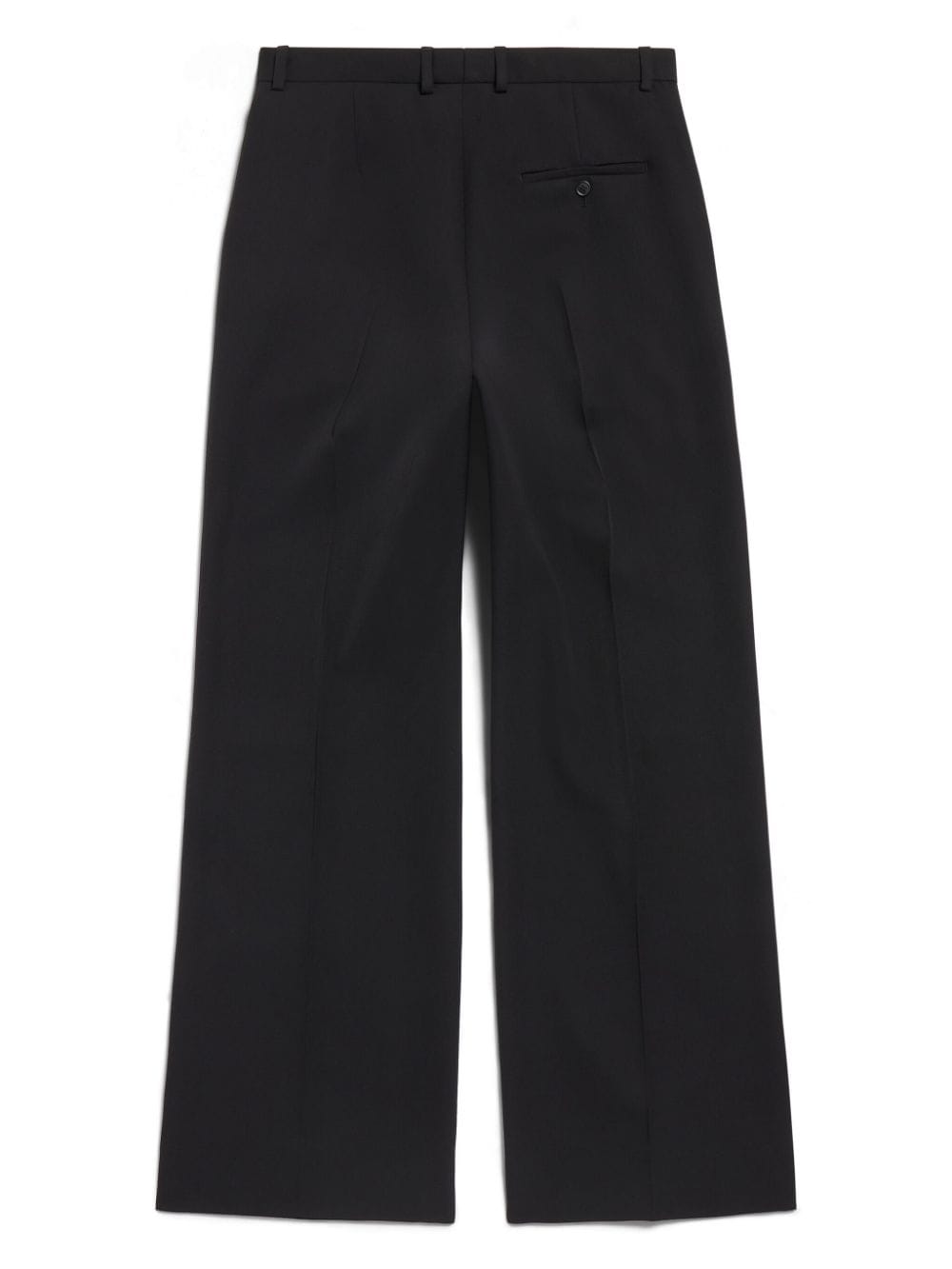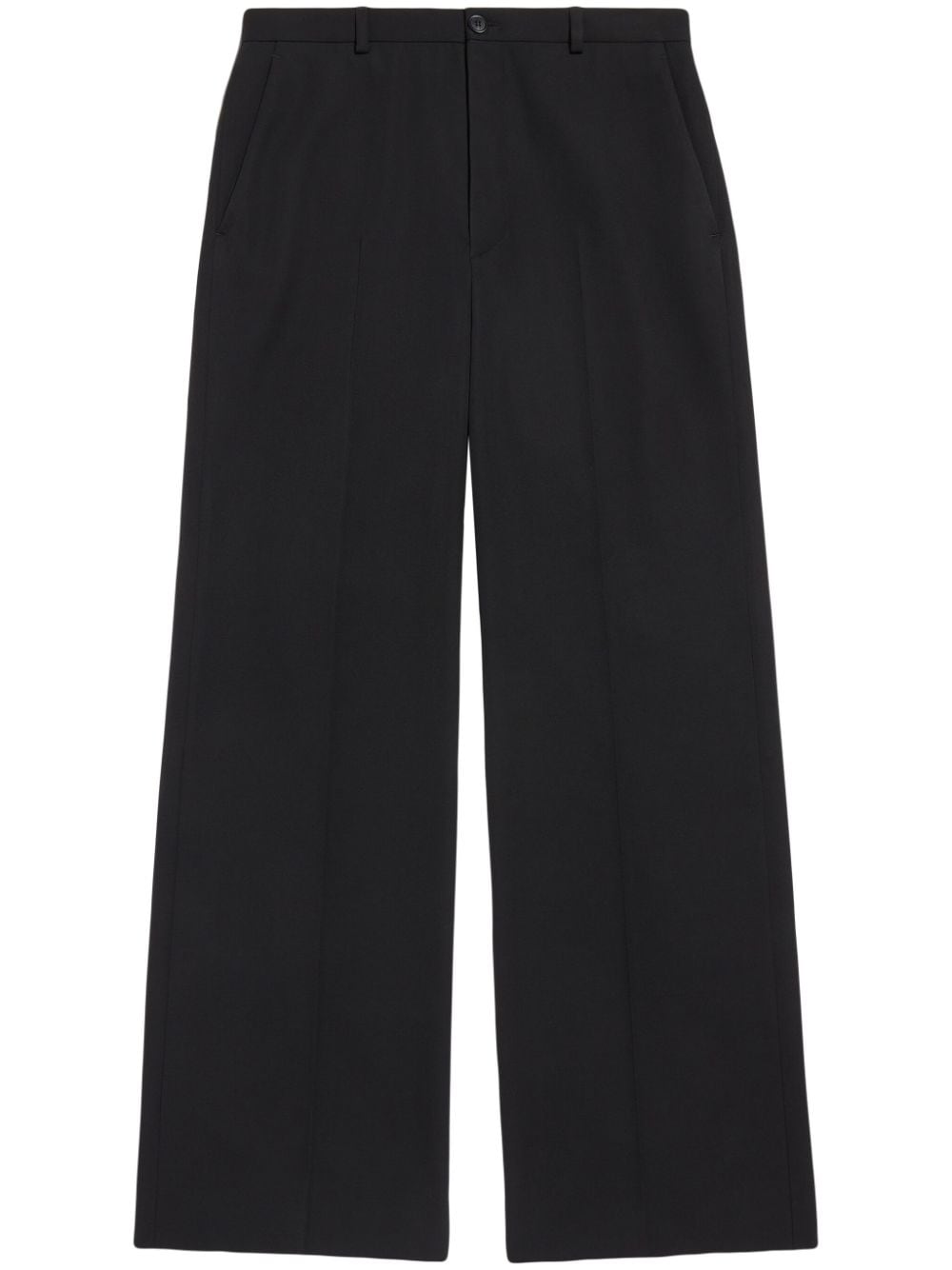 black wool pressed crease belt loops mid-rise wide leg front button and zip fastening two side slit pockets rear jetted pocket extra-long length When buying this unisex item, keep in mind that it is graded in standard men's sizing. Size and Fit - This piece fits true to size. We recommend you get your regular size. Model is 1,84m / 6ft 1in wearing size M