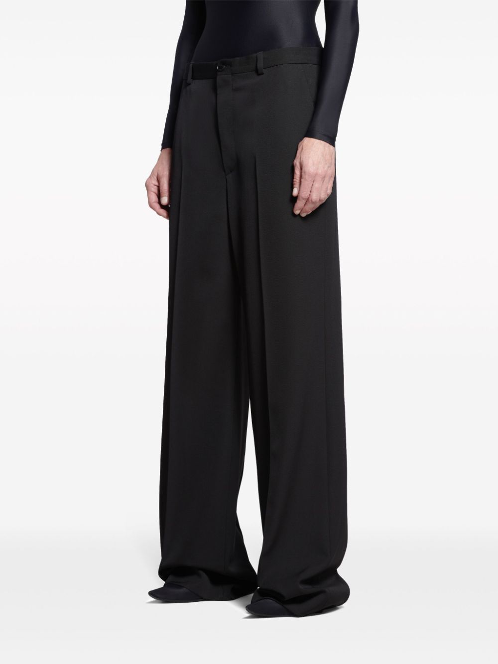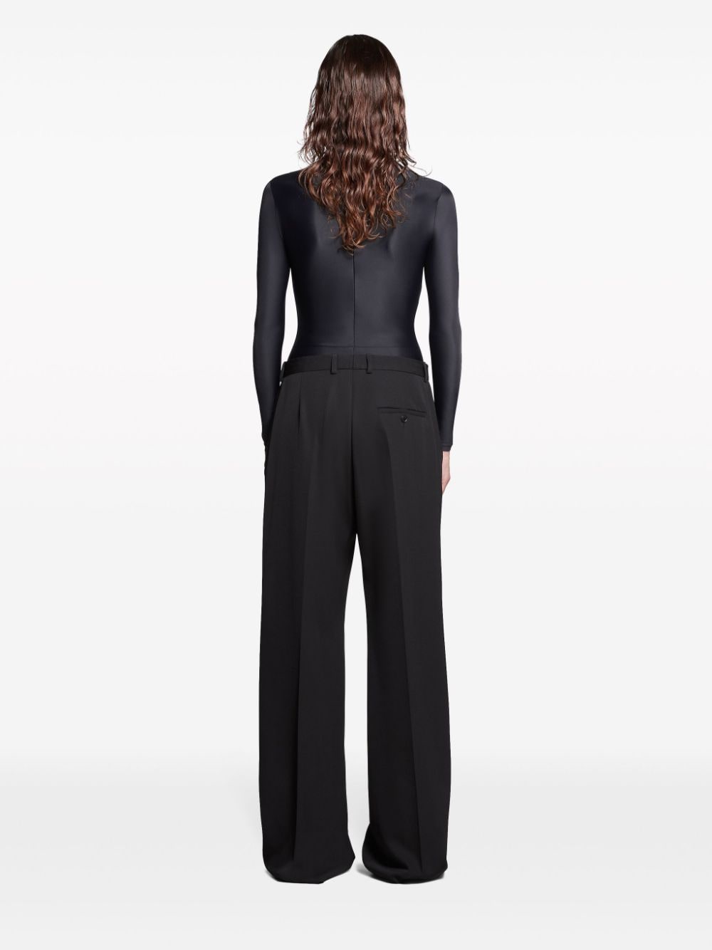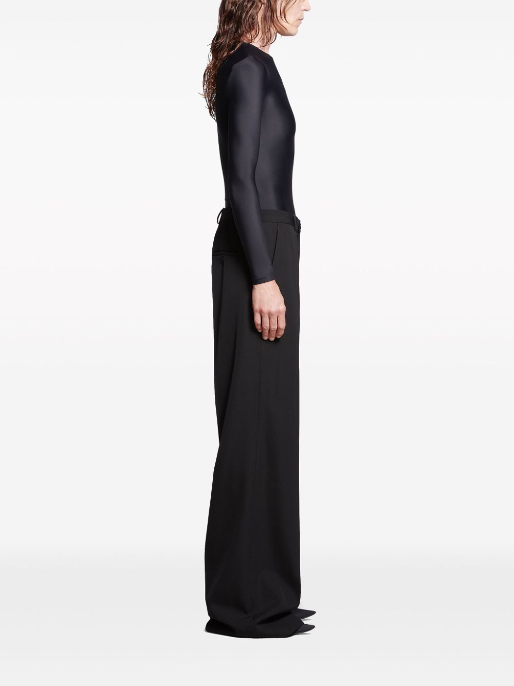 black wool pressed crease belt loops mid-rise wide leg front button and zip fastening two side slit pockets rear jetted pocket extra-long length When buying this unisex item, keep in mind that it is graded in standard men's sizing. Size and Fit - This piece fits true to size. We recommend you get your regular size. Model is 1,84m / 6ft 1in wearing size M