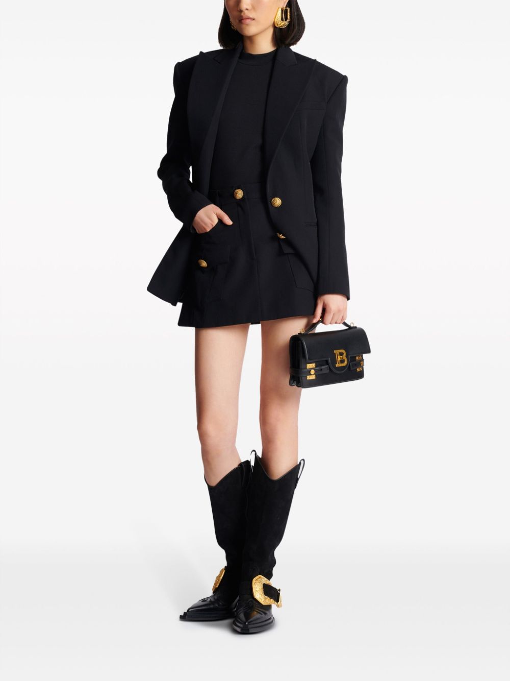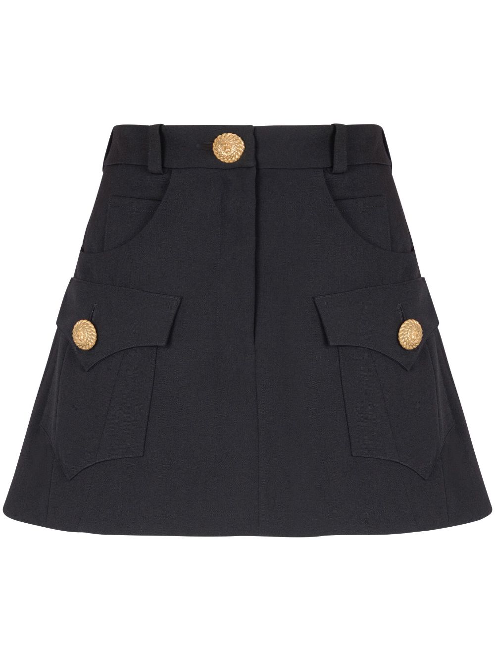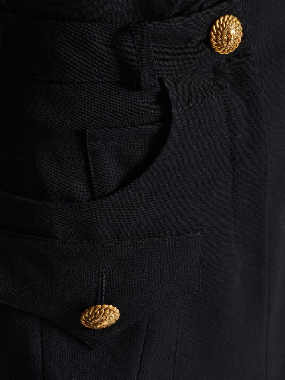 black wool Western-style panelling lion head-embossed buttons belt loops high-waisted A-line concealed fly and button fastening multiple patch pockets two front flap pockets thigh-length This item is certified to high animal welfare standards, ensuring that no animals have been subjected to any unnecessary harm for the purposes of making this item and that there is traceability in the supply chain. Learn more about what makes a product Conscious on our Conscious Criteria page. Size and Fit - This piece fits true to size. We recommend you get your regular size. Model is 1,75m / 5ft 8in wearing size 36 (FR)