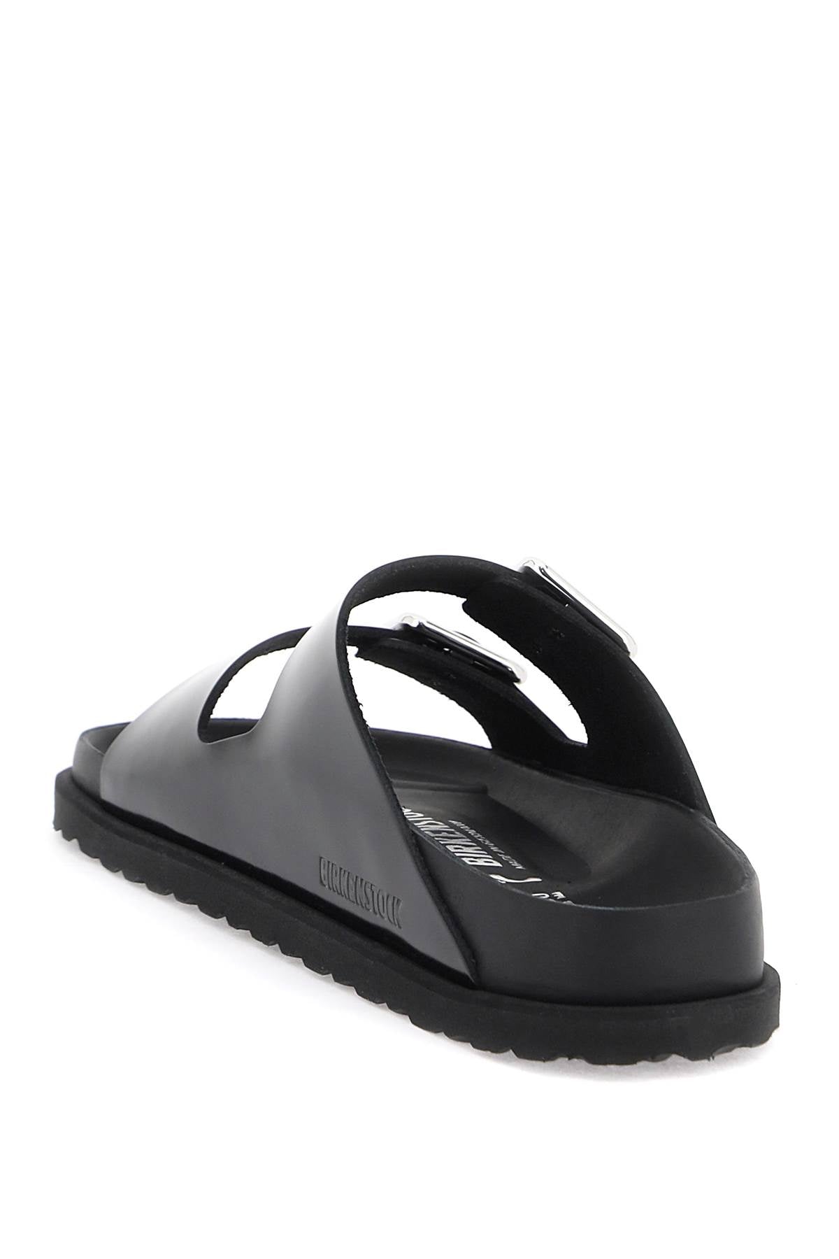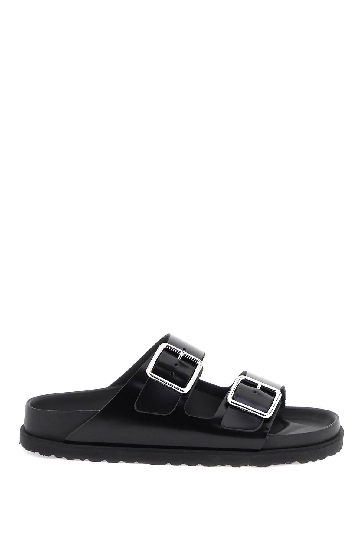 The Arizona Avantgarde slides from the BIRKENSTOCK 1774 collection feature a double strap in glossy leather, embellished with a silver metal buckle engraved with the brand's logo. The anatomically shaped cork and latex footbed is covered in premium nappa leather, while the sole is made of EVA for added comfort.