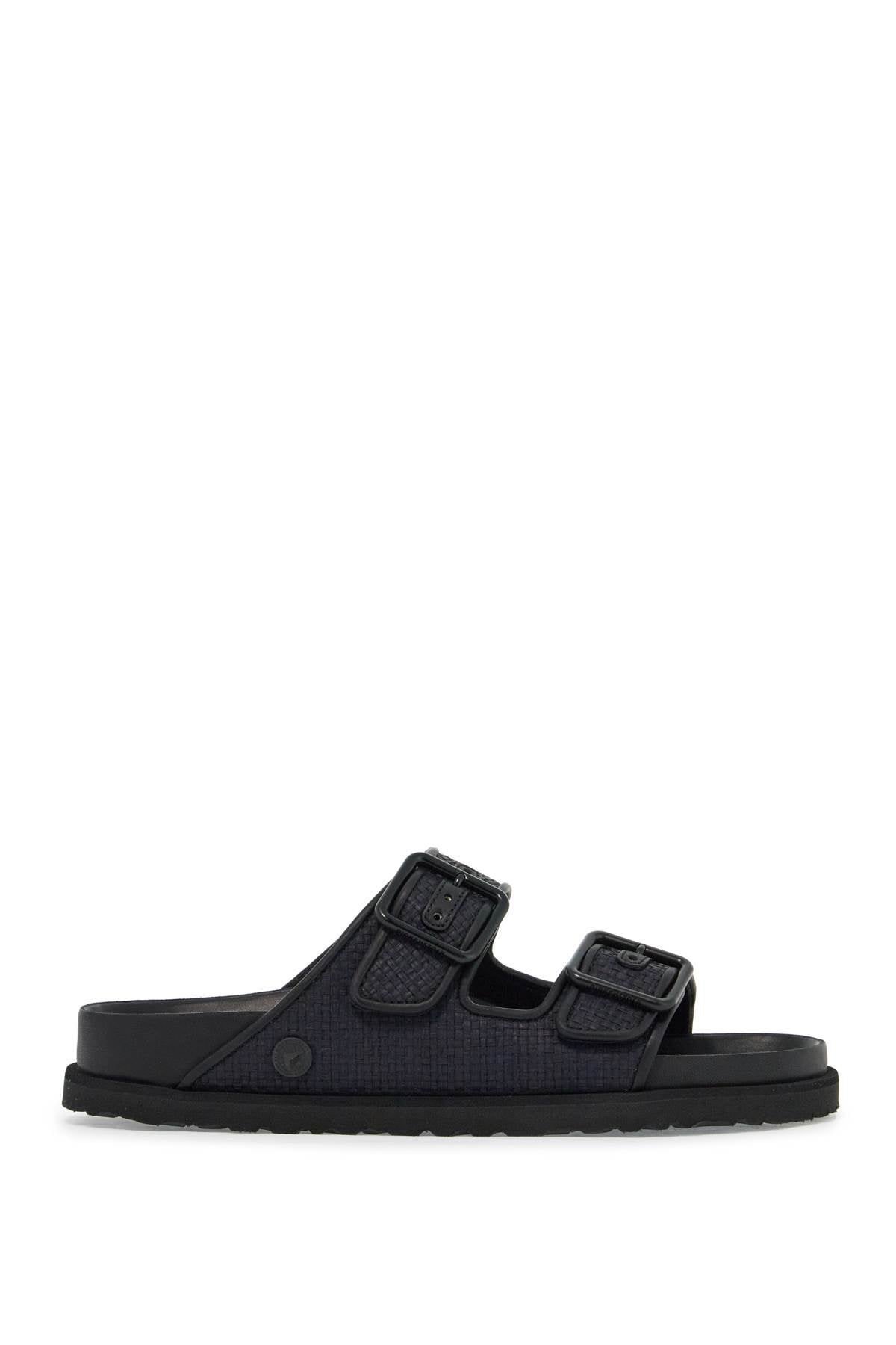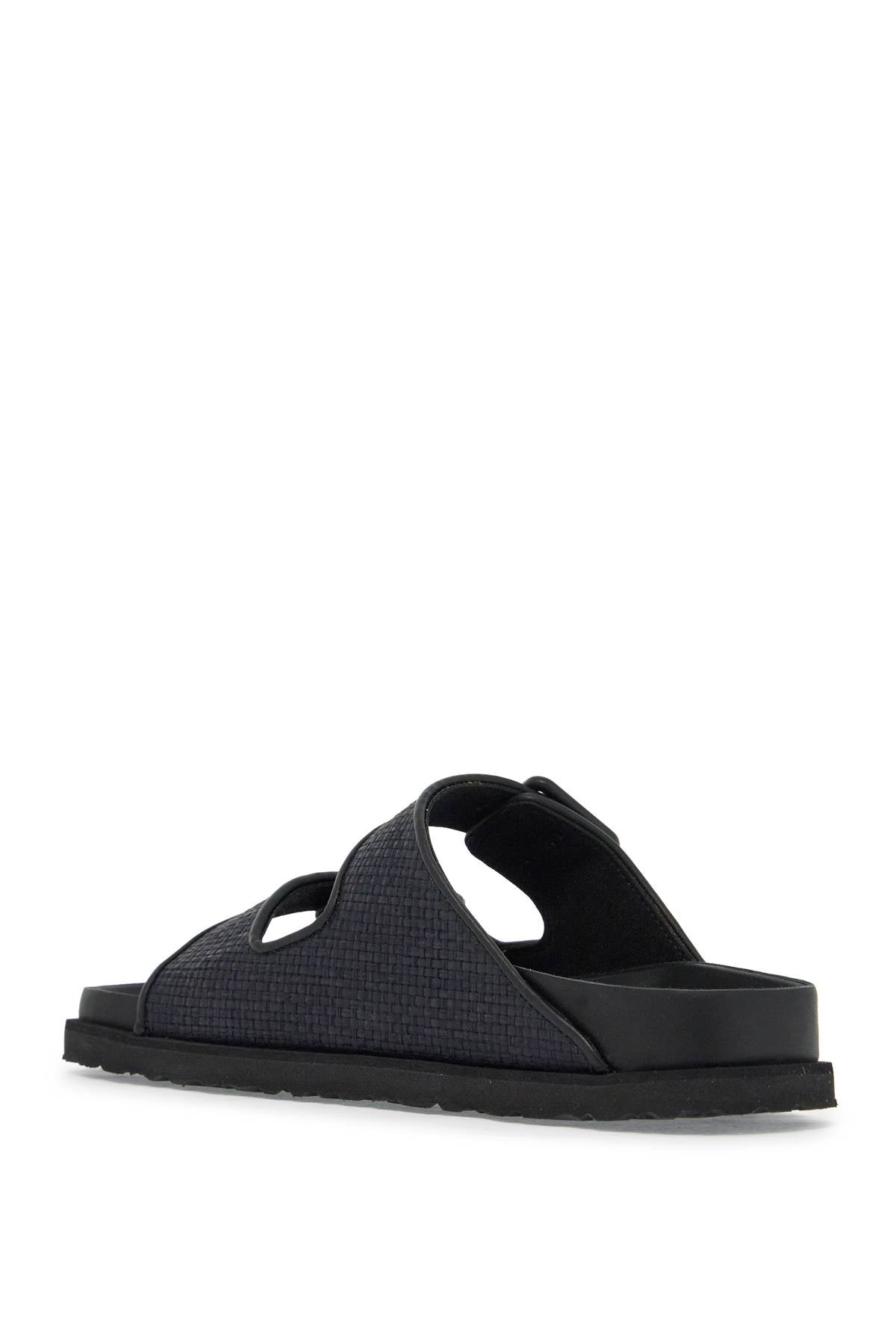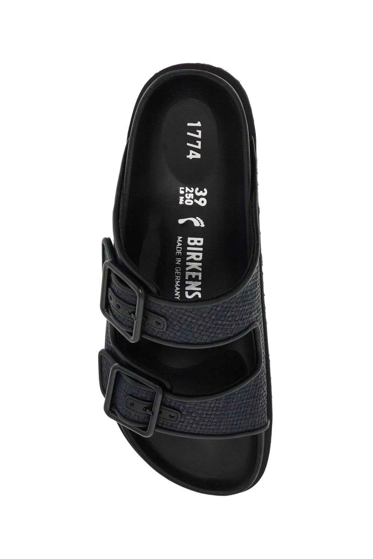 The Arizona slides from the Eternal Sunshine collection by BIRKENSTOCK 1774 feature adjustable straps made of profiled raffia and leather, complete with a tonal engraved buckle. They also have a cotton blend lining, leather insole, cork-covered footbed, and EVA sole. The fit is narrow. Size and Fit - Heel Height = 2,5 cm,