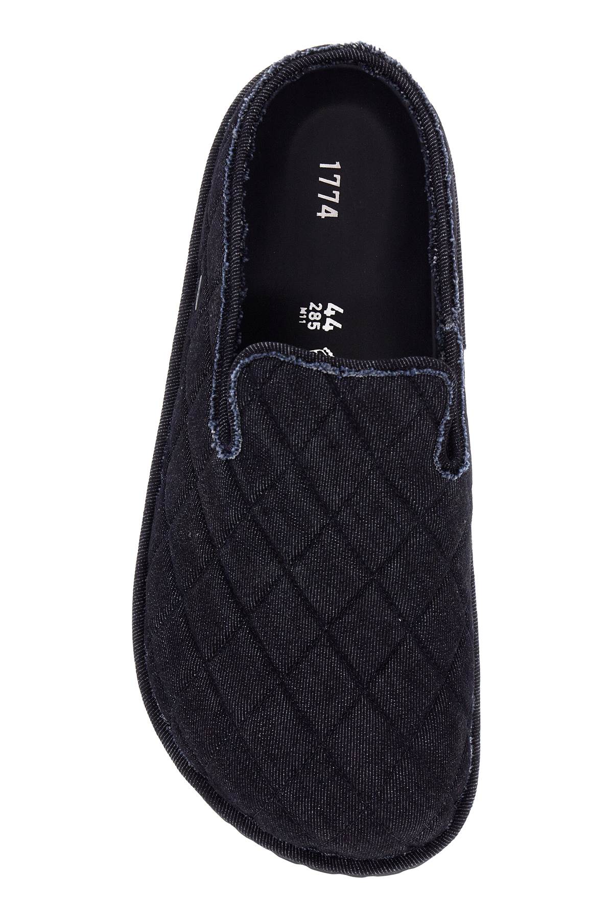 The Eliscu Mules from the 1774 collection by Birkenstock are made in Italian dark stone-washed denim with diamond quilting and distressed edges. They feature a nubuck lining, an anatomical cork and latex footbed covered in Piumato leather, and an EVA sole. Size and Fit - Heel Height = 3 cm,