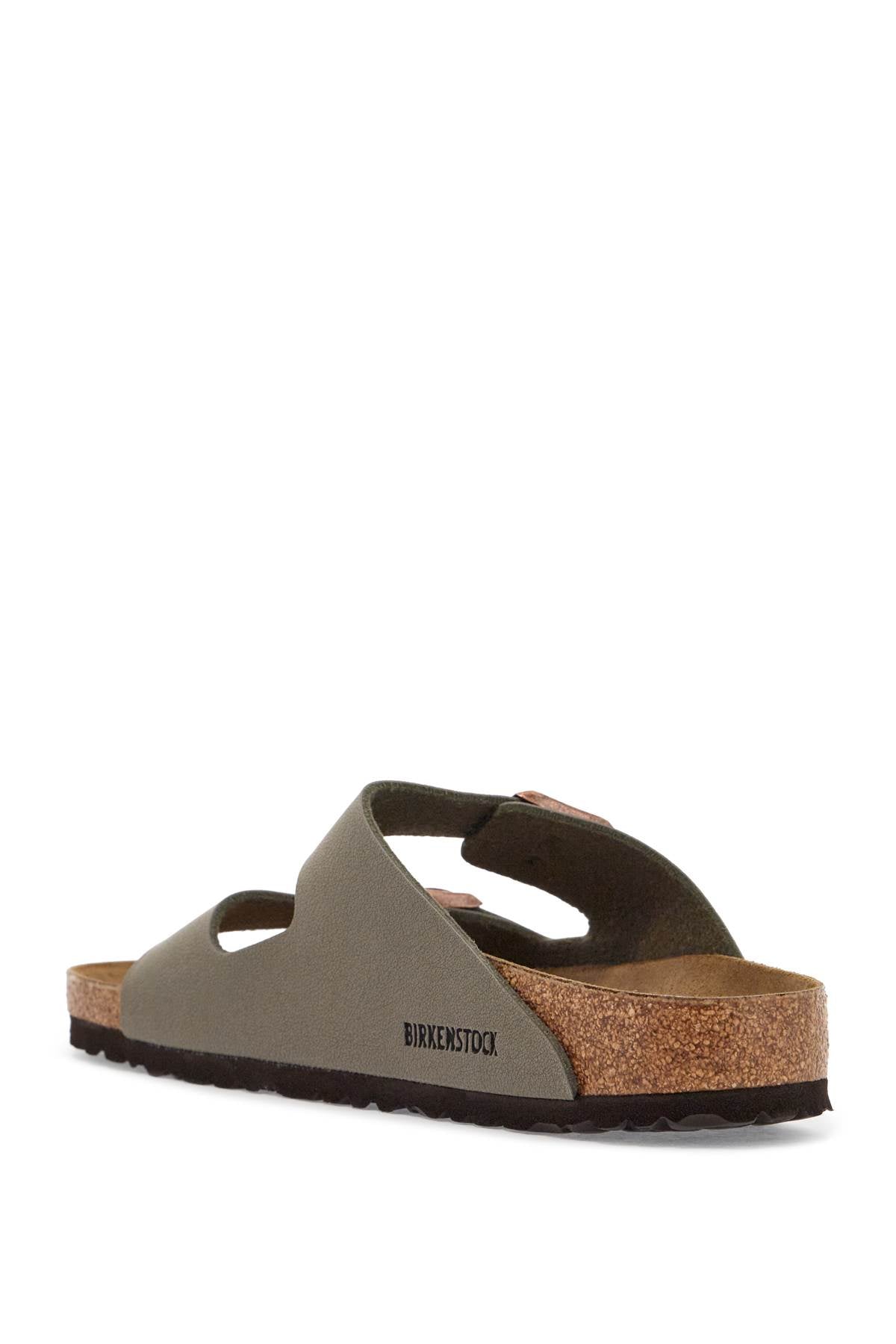 BIRKENSTOCK Arizona slides crafted in Birko-Flor with Nubuck leather surface featuring double adjustable strap with oxidized-effect metal buckle with debossed logo. Suede leather footbed, moulded cork and latex sole and EVA tread. Narrow fit.