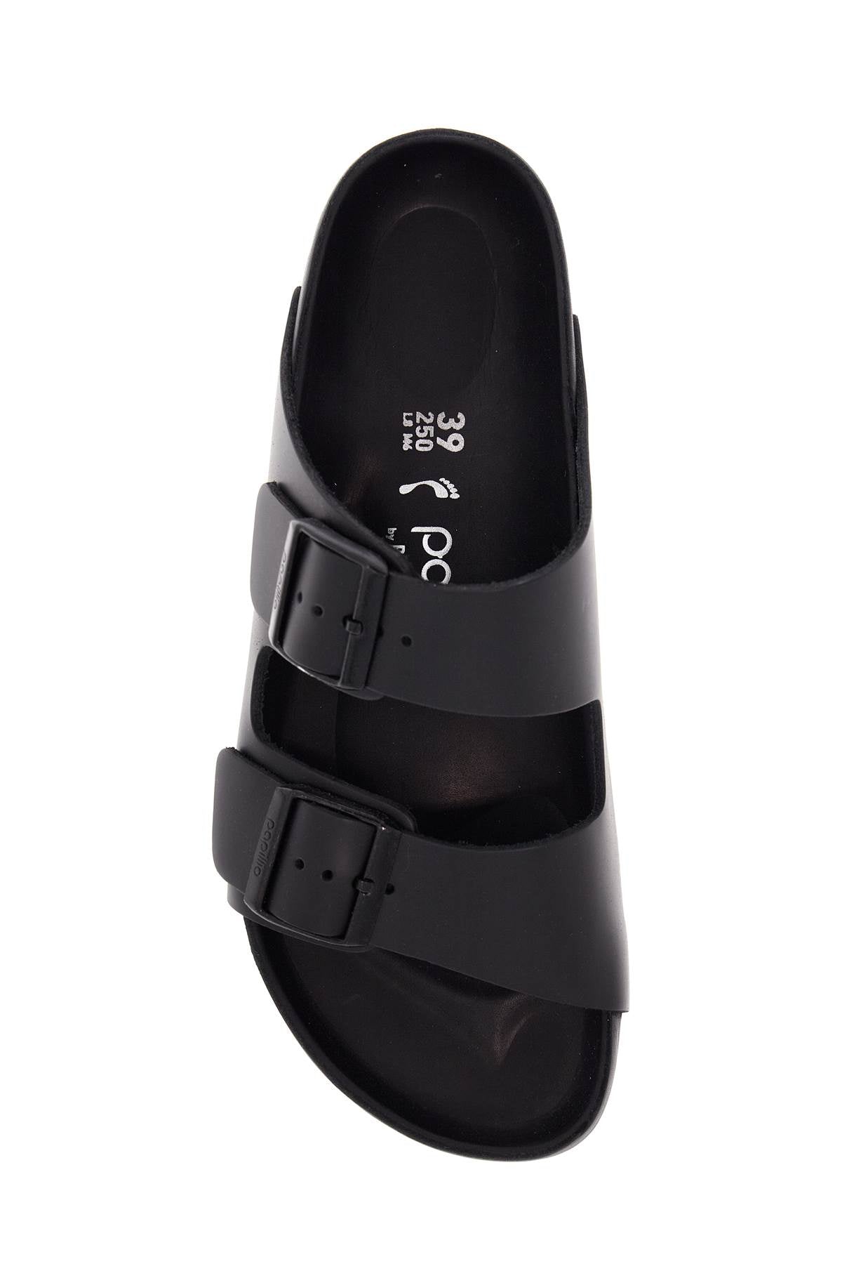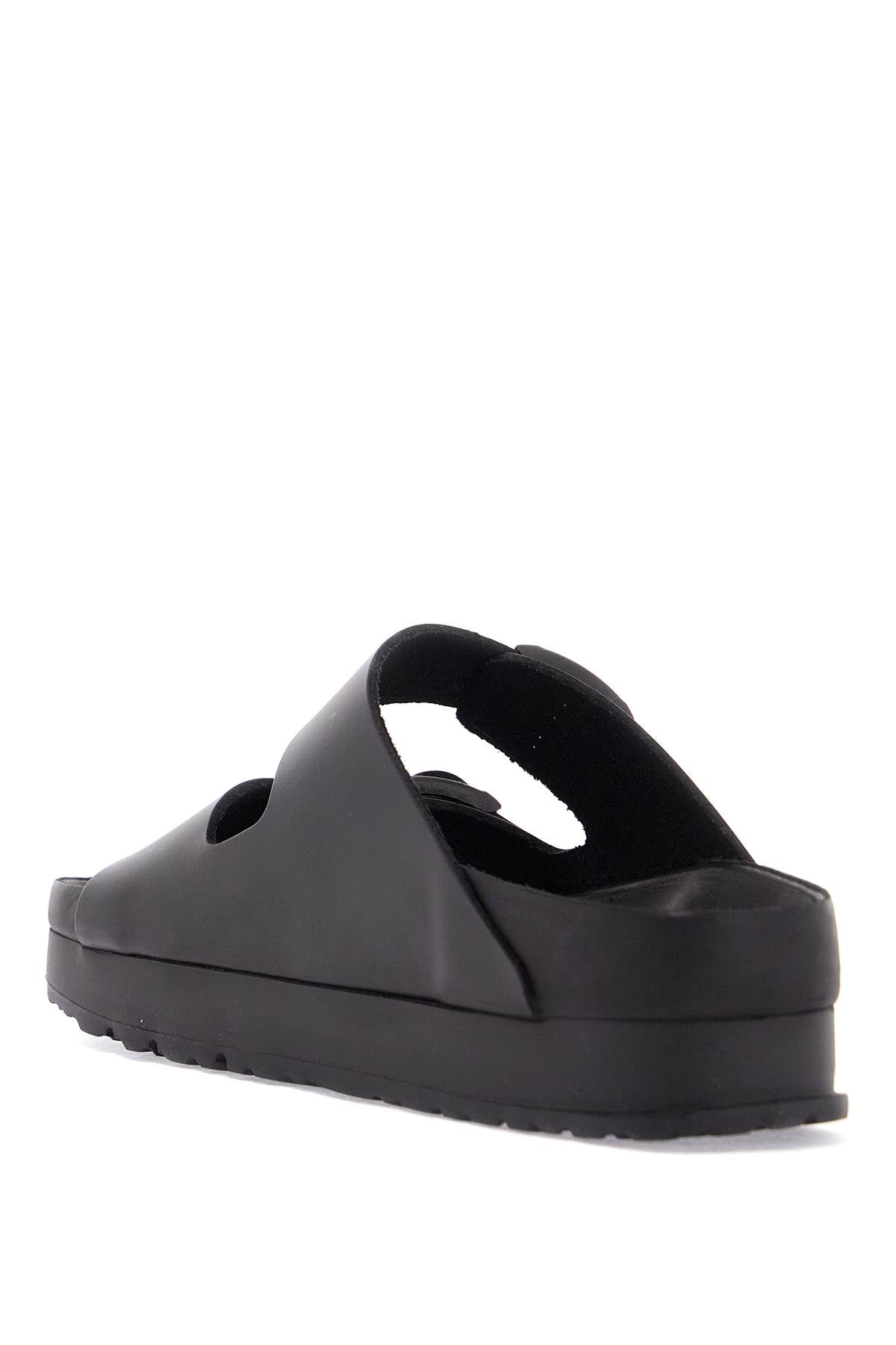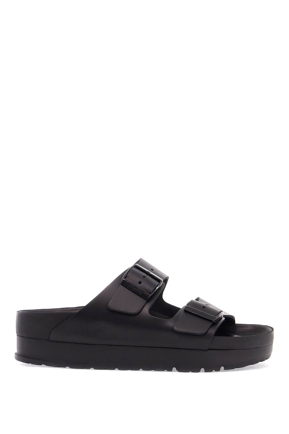 Birkenstock black leather platform sandals with two straps and metal buckles