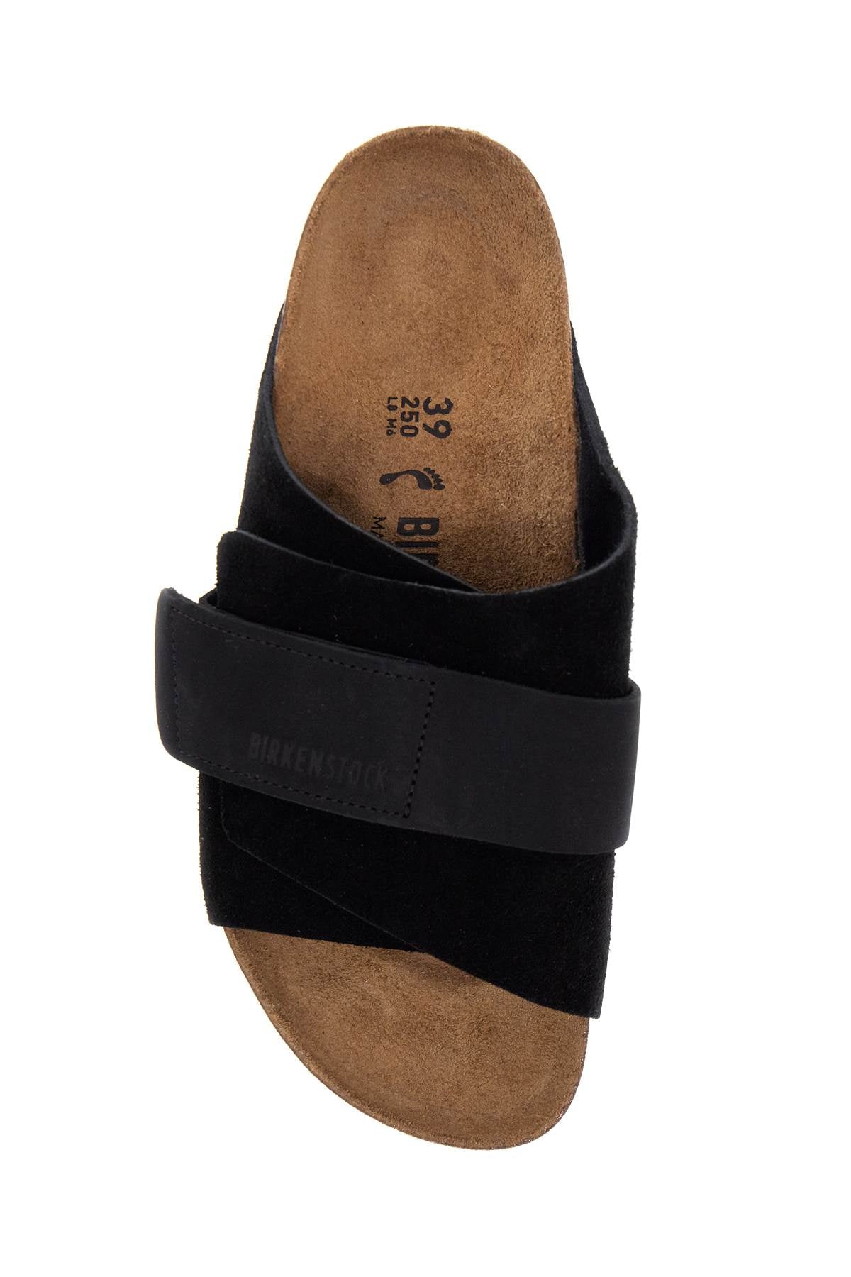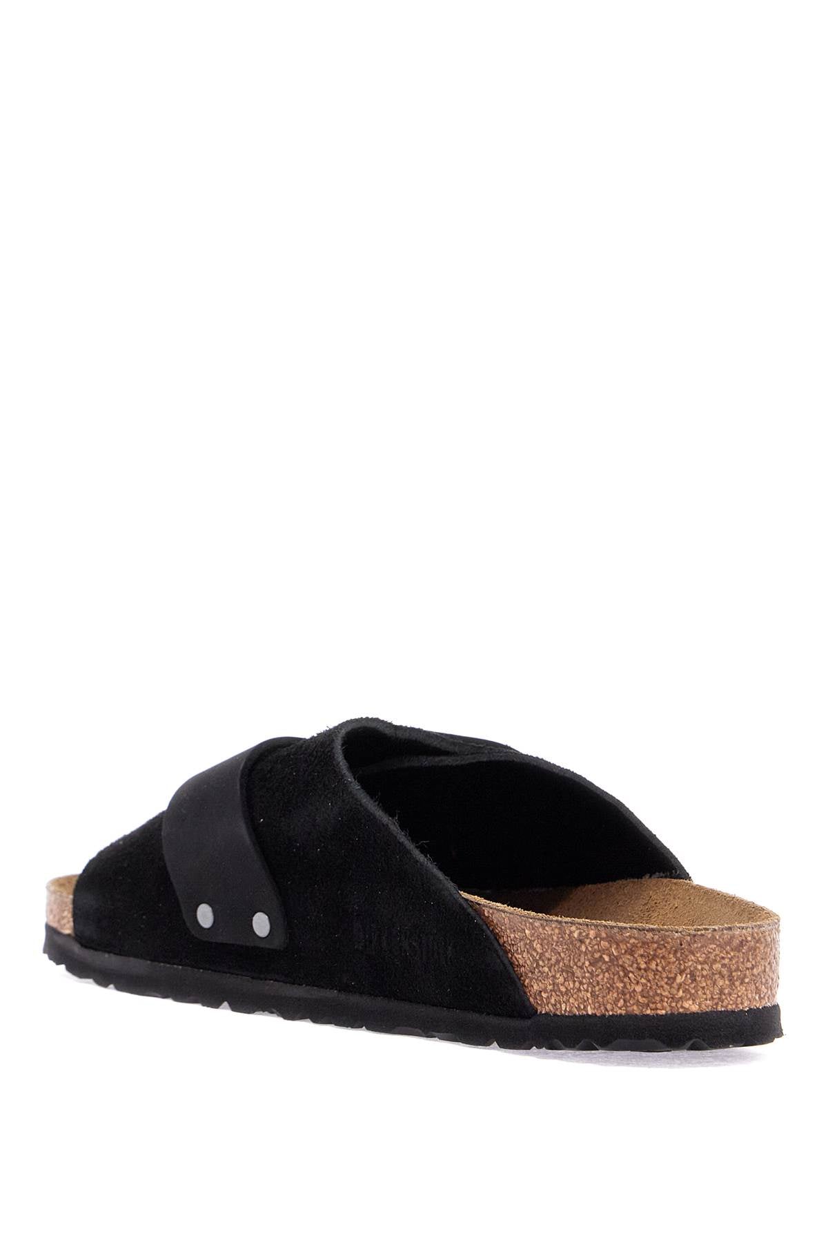 Birkenstock Kyoto slides made of suede and nubuck leather with adjustable Velcro closure, anatomical cork and latex footbed, suede insole, and rubber sole.
