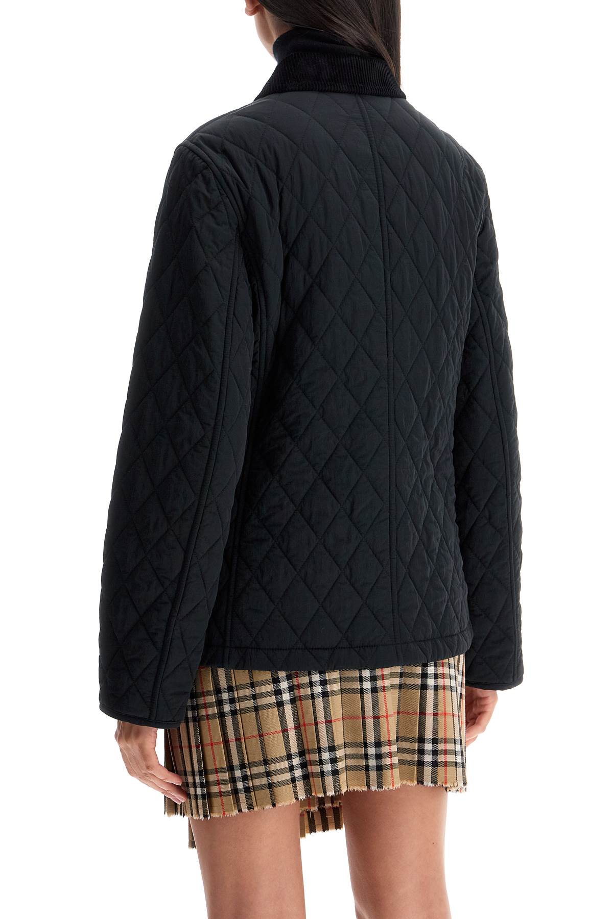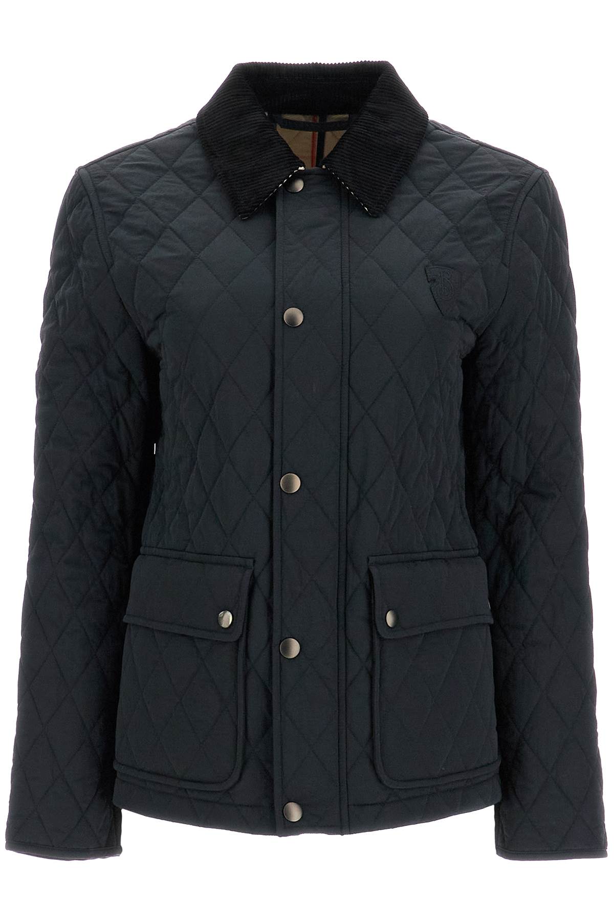 Crafted in diamond-quilted nylon with a tonal corduroy collar, this Burberry jacket features a fitted silhouette and is adorned with the 'B Shield' appliqué at the chest. It has a two-way zip and snap button closure, two patch pockets with flaps, and a contrast cotton lining in Burberry Check. The lightweight polyester padding adds extra warmth. The model is 177 cm tall and wears size S.