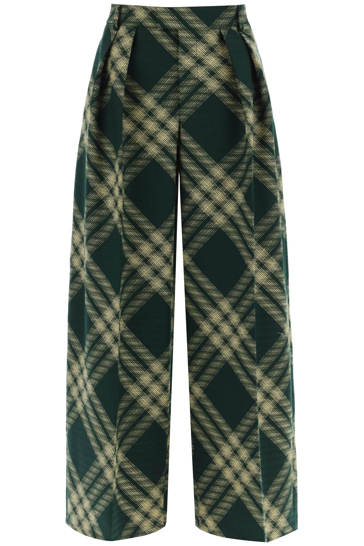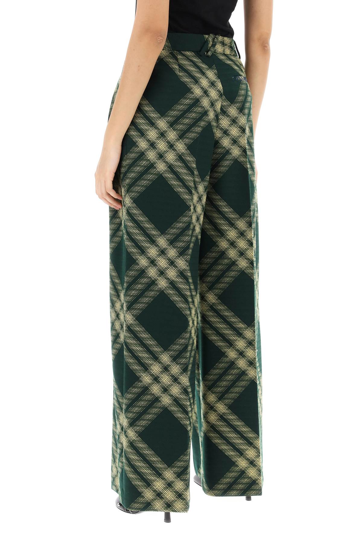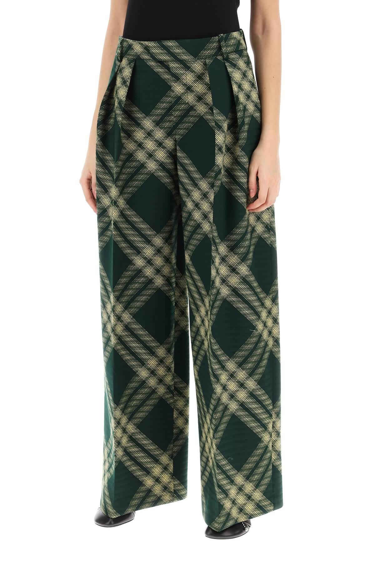 Burberry pants crafted in light wool with Check pattern all over, characterized by a flared cut enhanced by front pleats. They feature closure with zipper fly and tab with hook and button, side slash pockets, belt loops and a back welt pockets. The model is 177 cm tall and wears size UK 6.